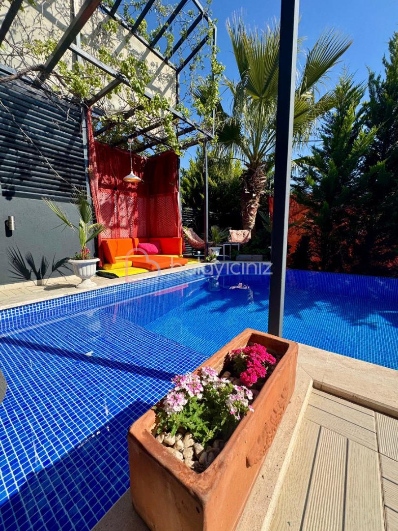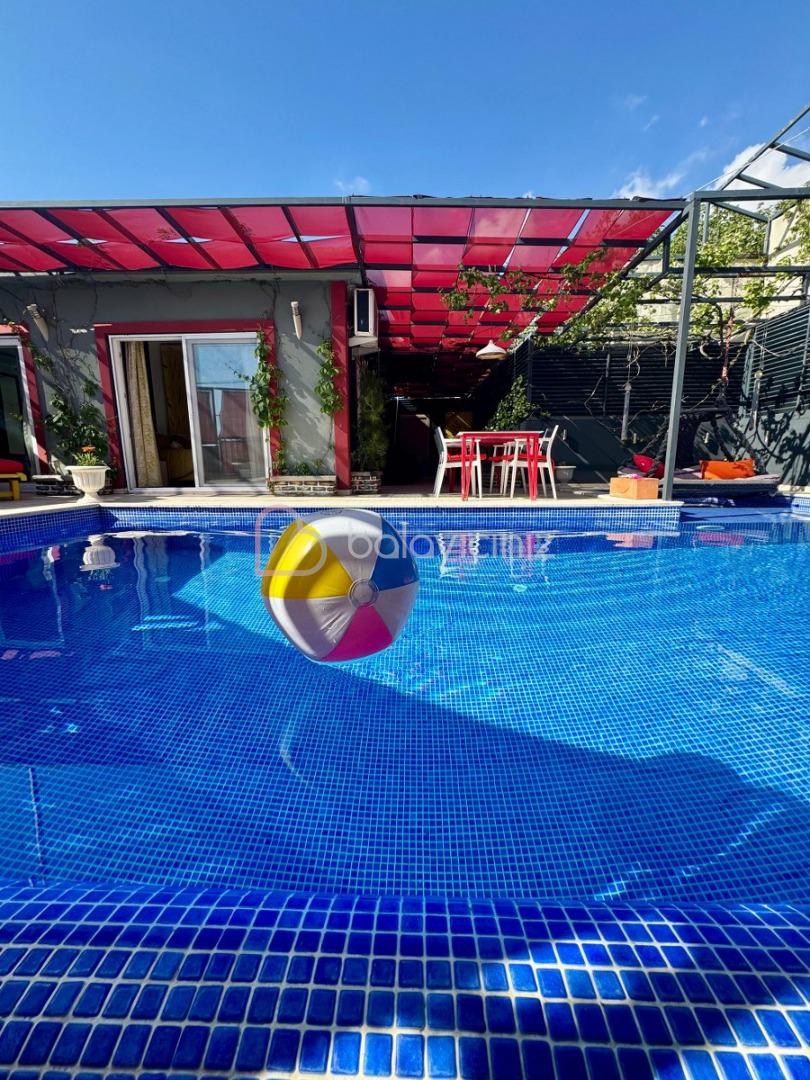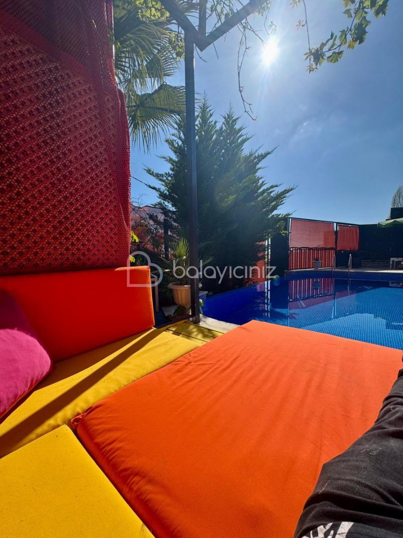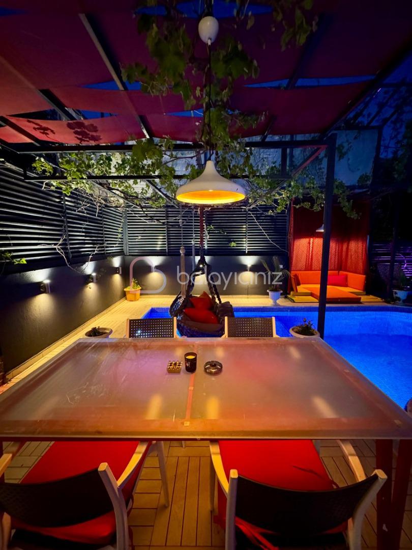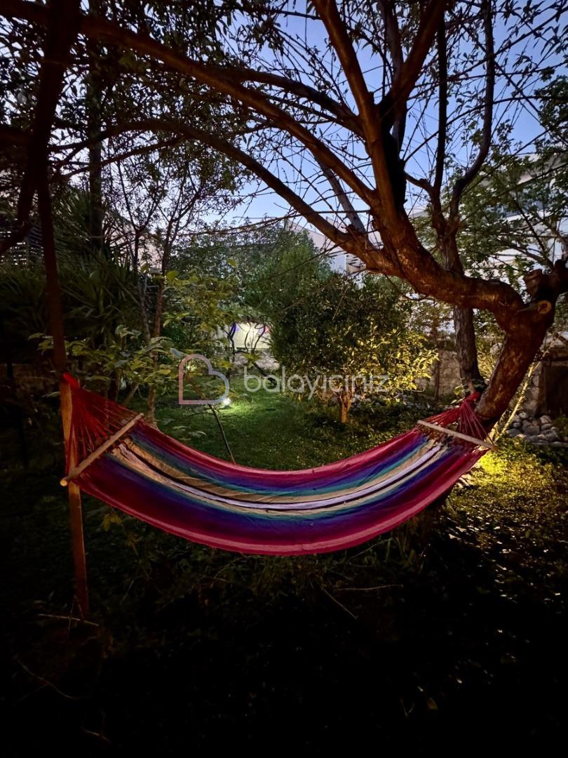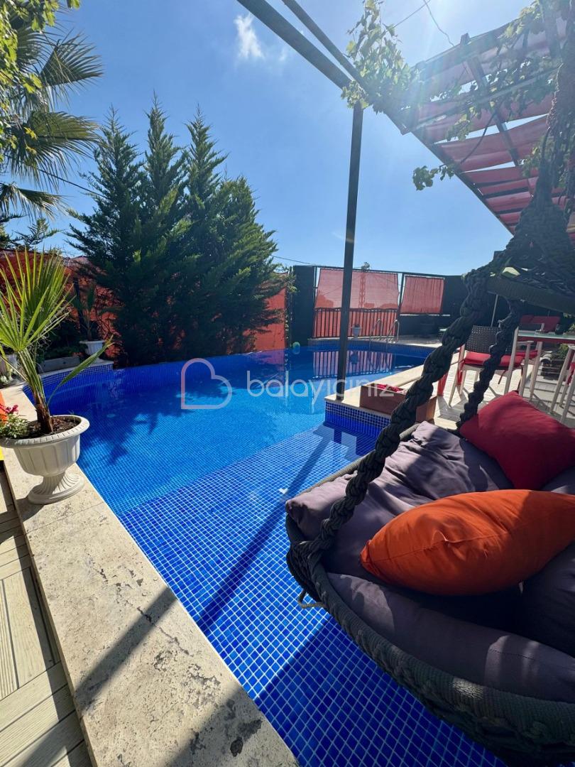 Bahçe içerisinde güneşlenme terası, özel yüzme havuzu, şezlonglar, güneş şemsiyesi, langırt, 4 kişilik bahçe yemek masası ve sandalyeler, salıncak ve mangal bulunmaktadır.
