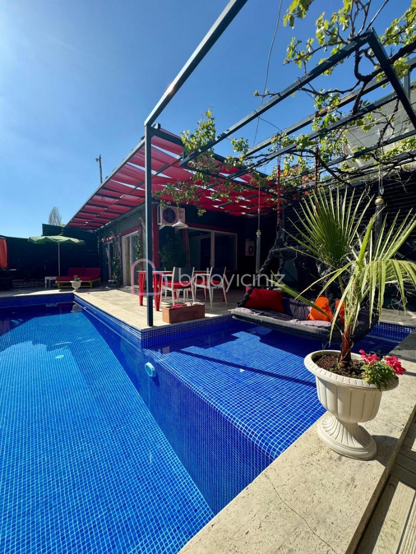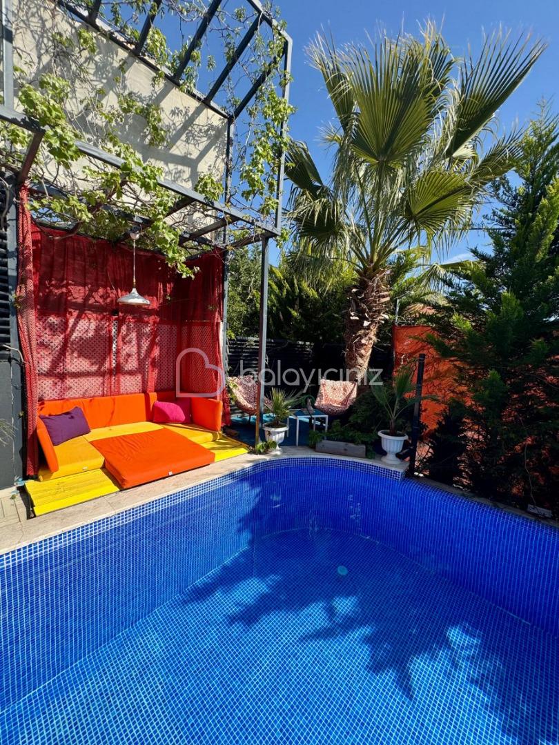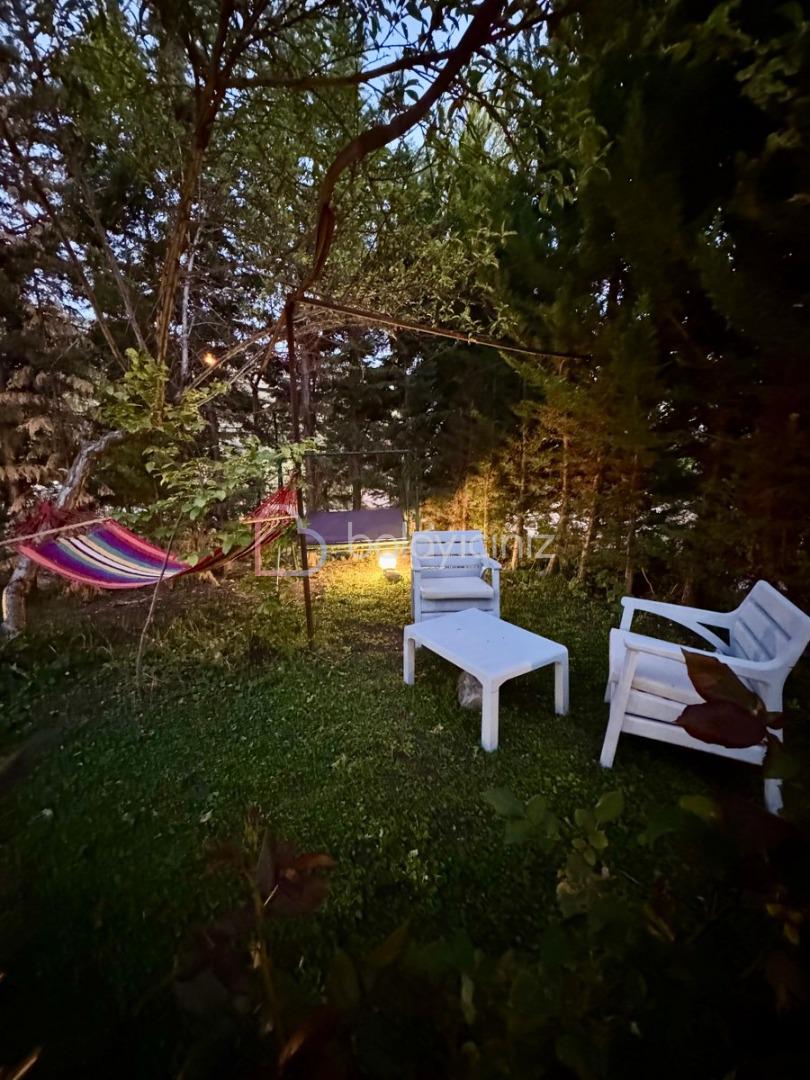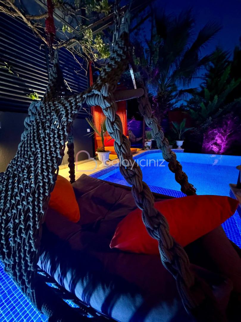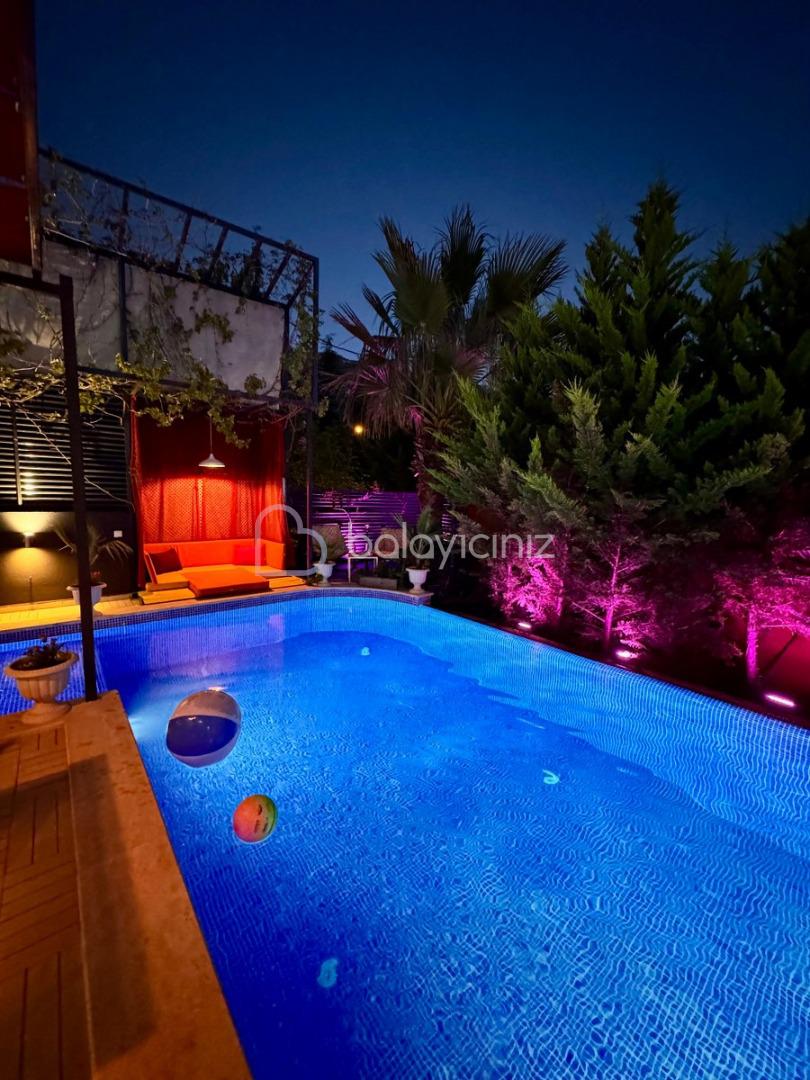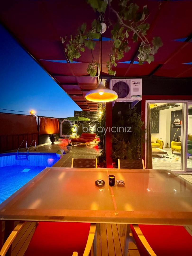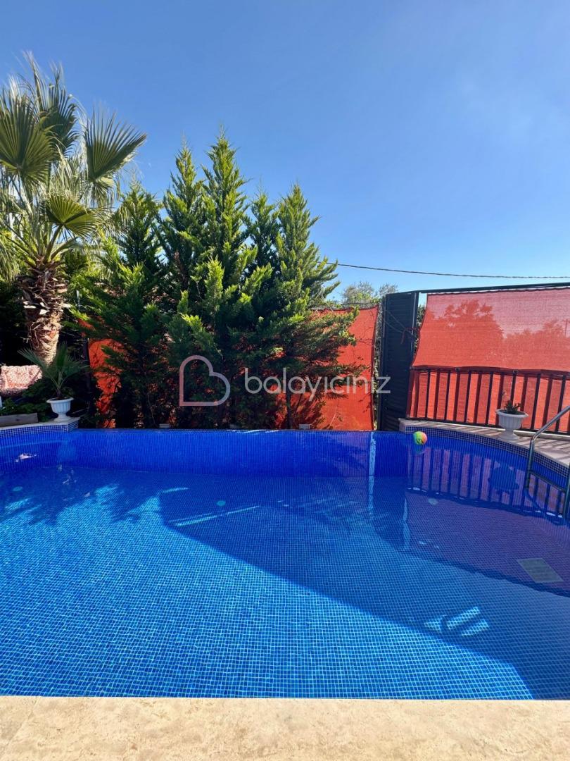 Bahçe içerisinde güneşlenme terası, özel yüzme havuzu, şezlonglar, güneş şemsiyesi, langırt, 4 kişilik bahçe yemek masası ve sandalyeler, salıncak ve mangal bulunmaktadır.
