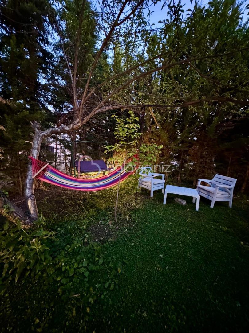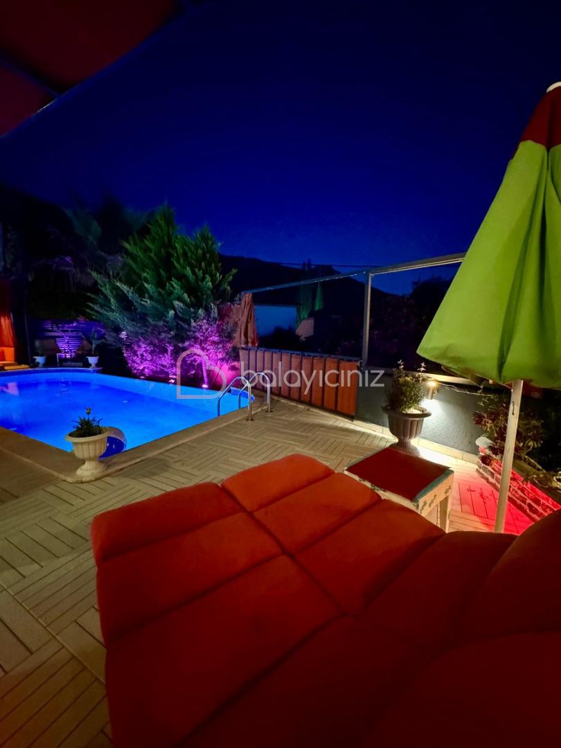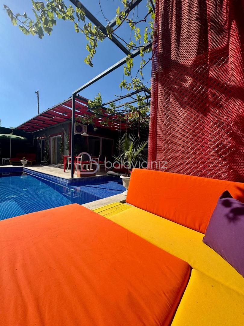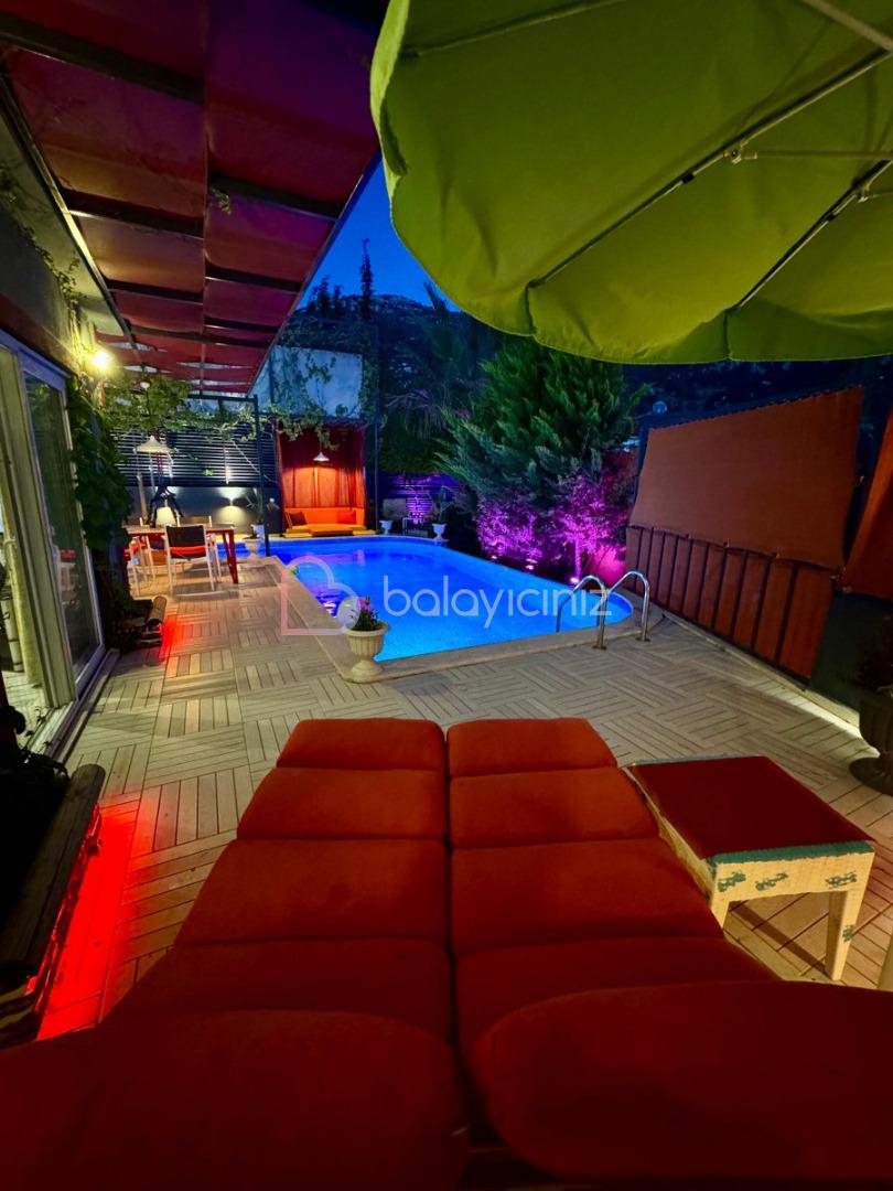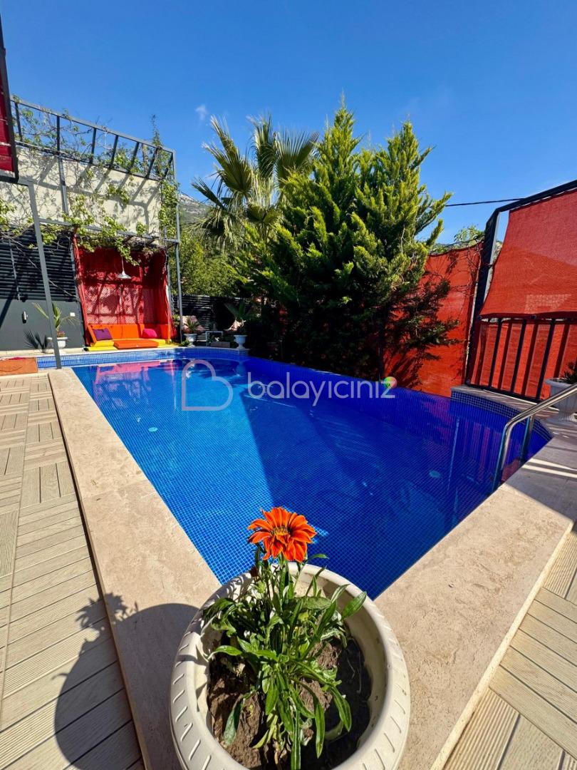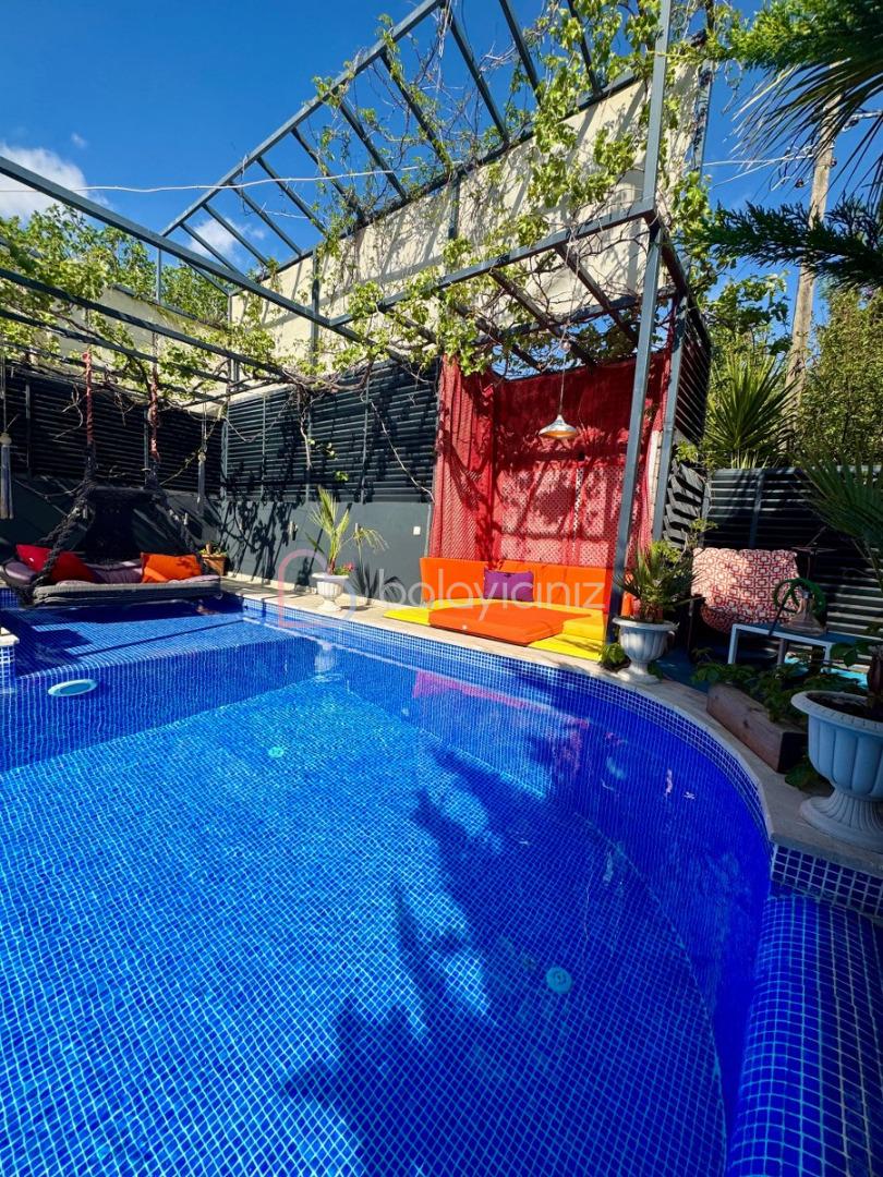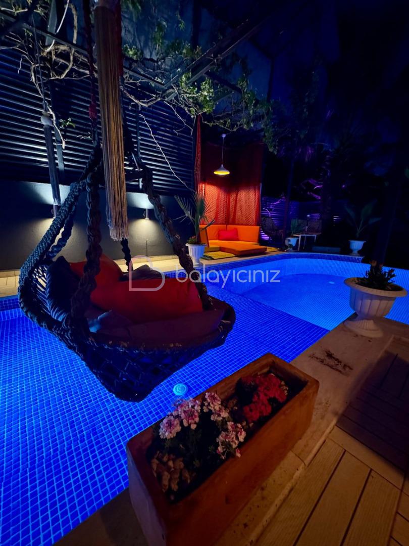 Bahçe içerisinde güneşlenme terası, özel yüzme havuzu, şezlonglar, güneş şemsiyesi, langırt, 4 kişilik bahçe yemek masası ve sandalyeler, salıncak ve mangal bulunmaktadır.