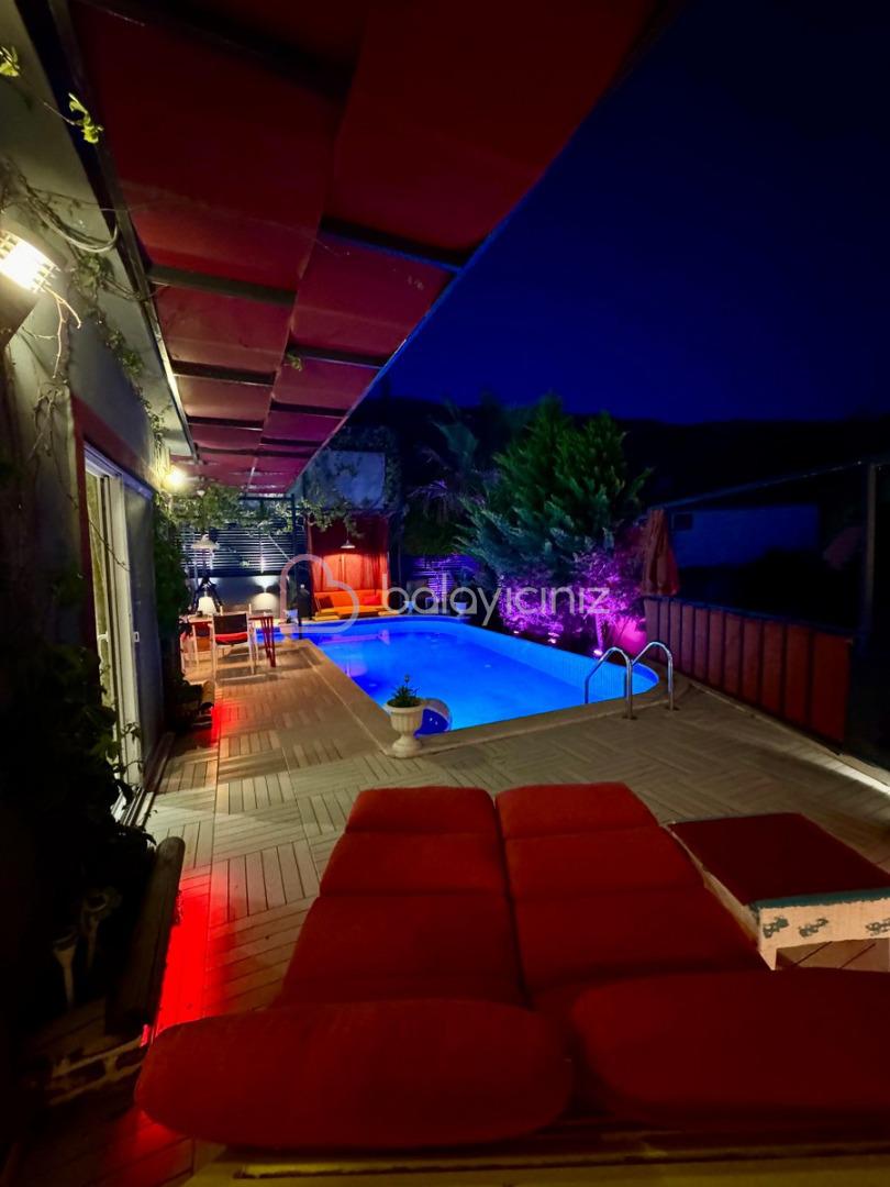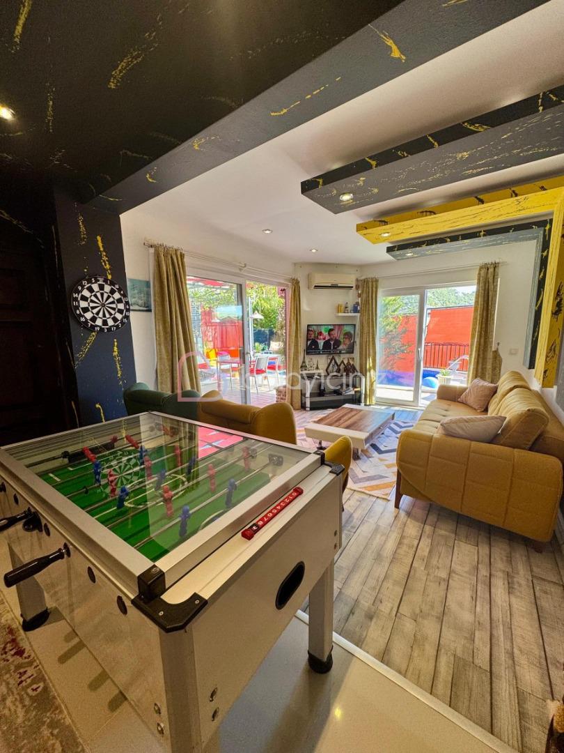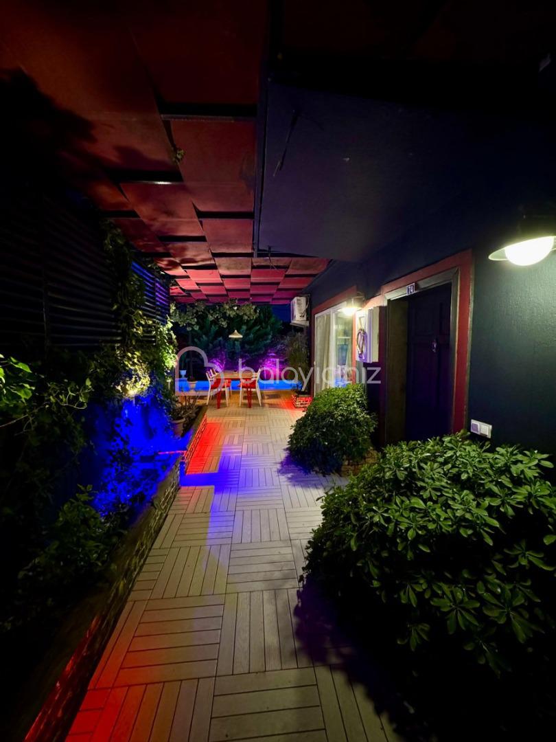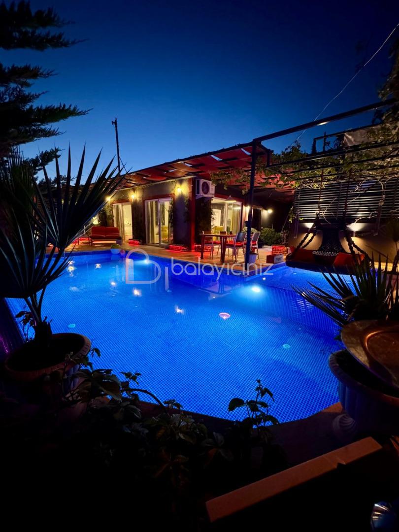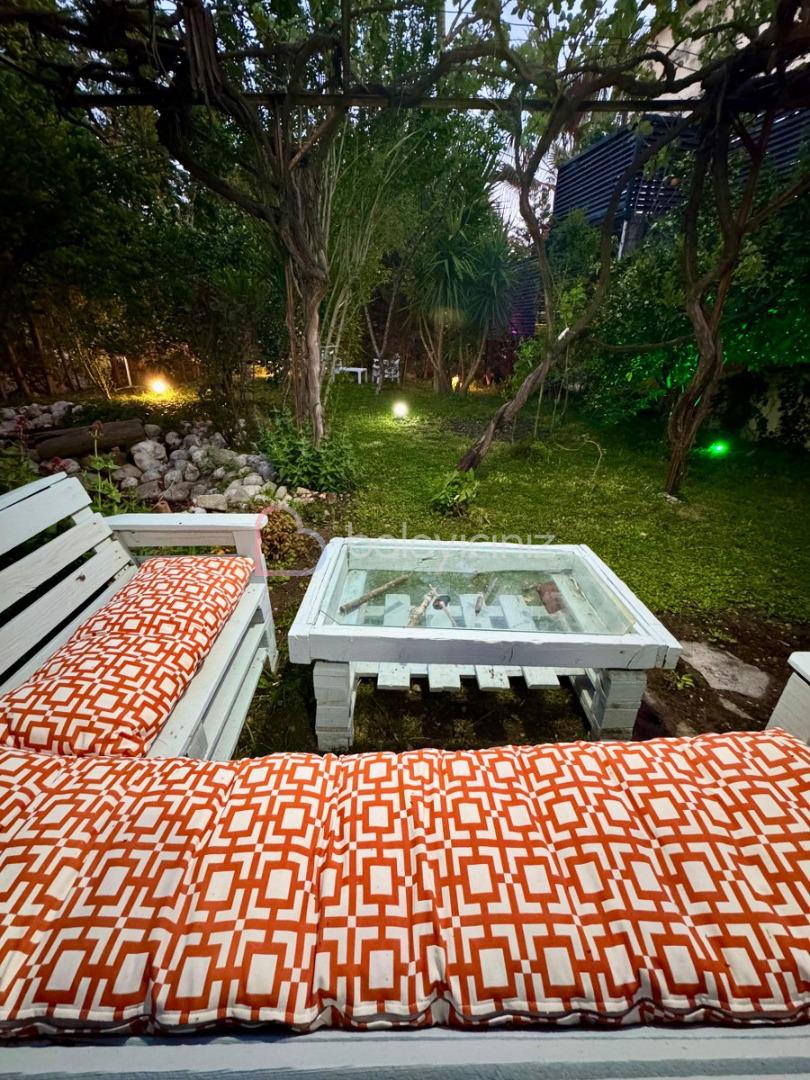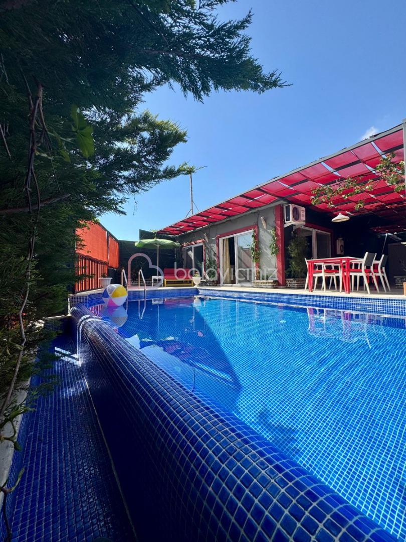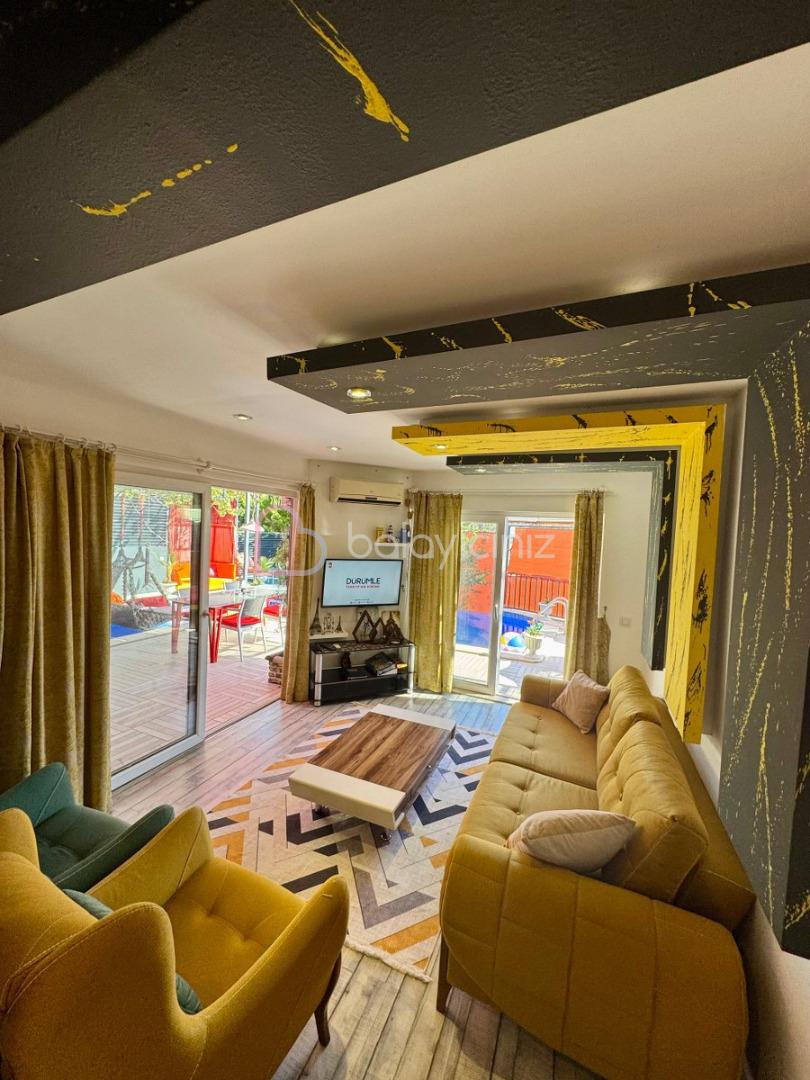 Bahçe içerisinde güneşlenme terası, özel yüzme havuzu, şezlonglar, güneş şemsiyesi, langırt, 4 kişilik bahçe yemek masası ve sandalyeler, salıncak ve mangal bulunmaktadır.