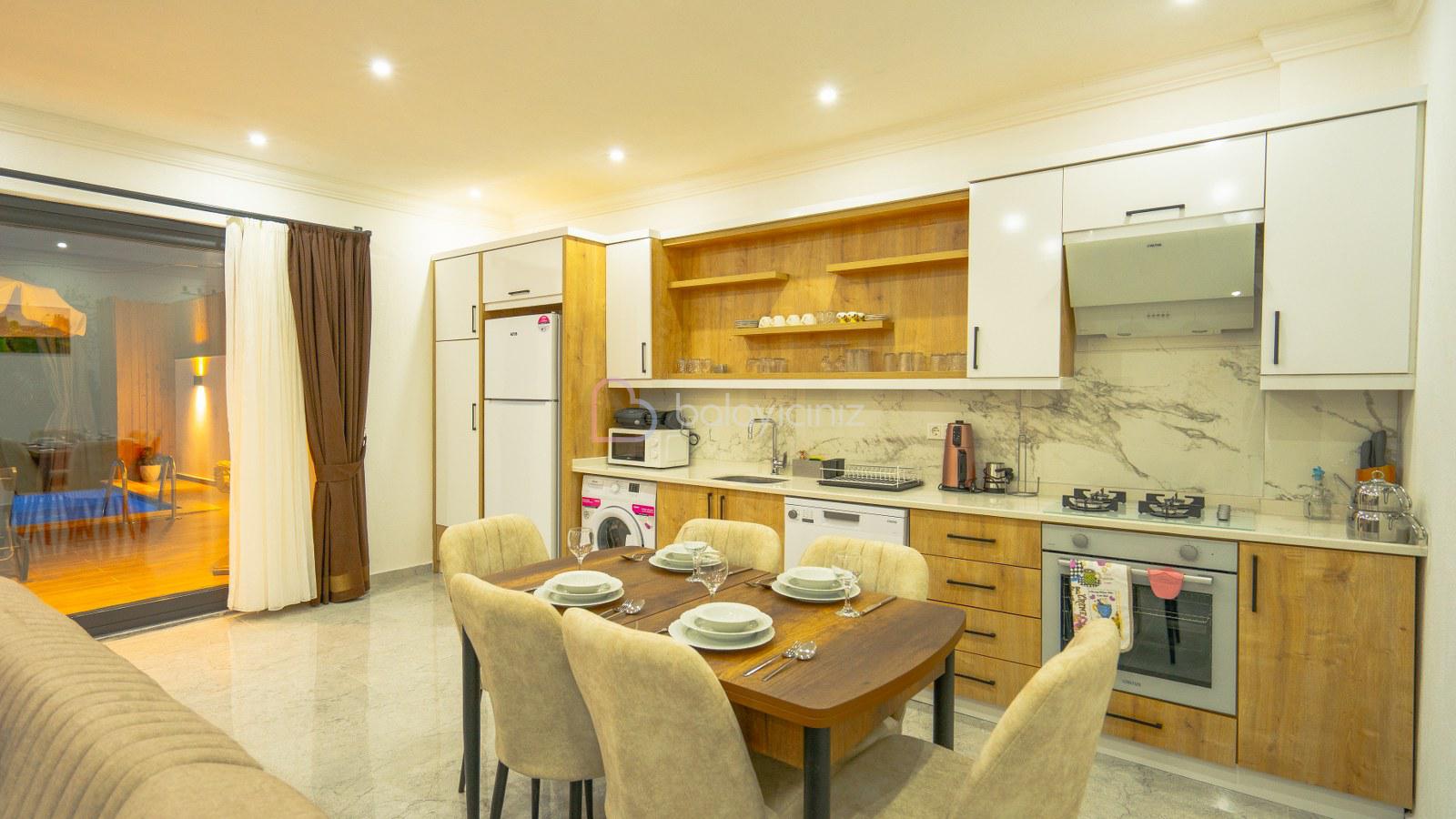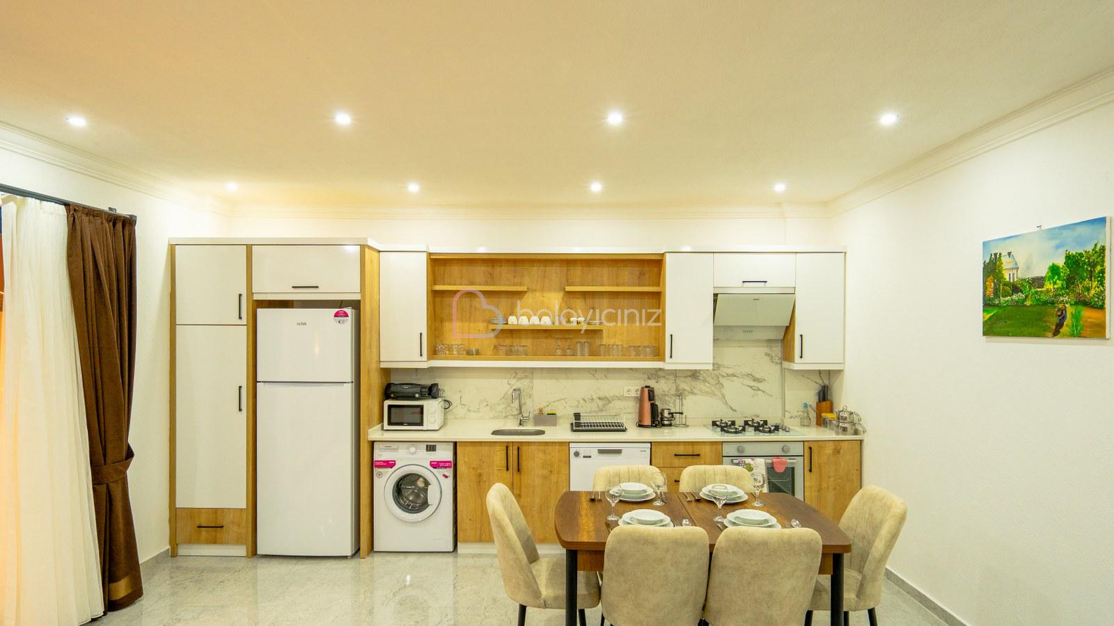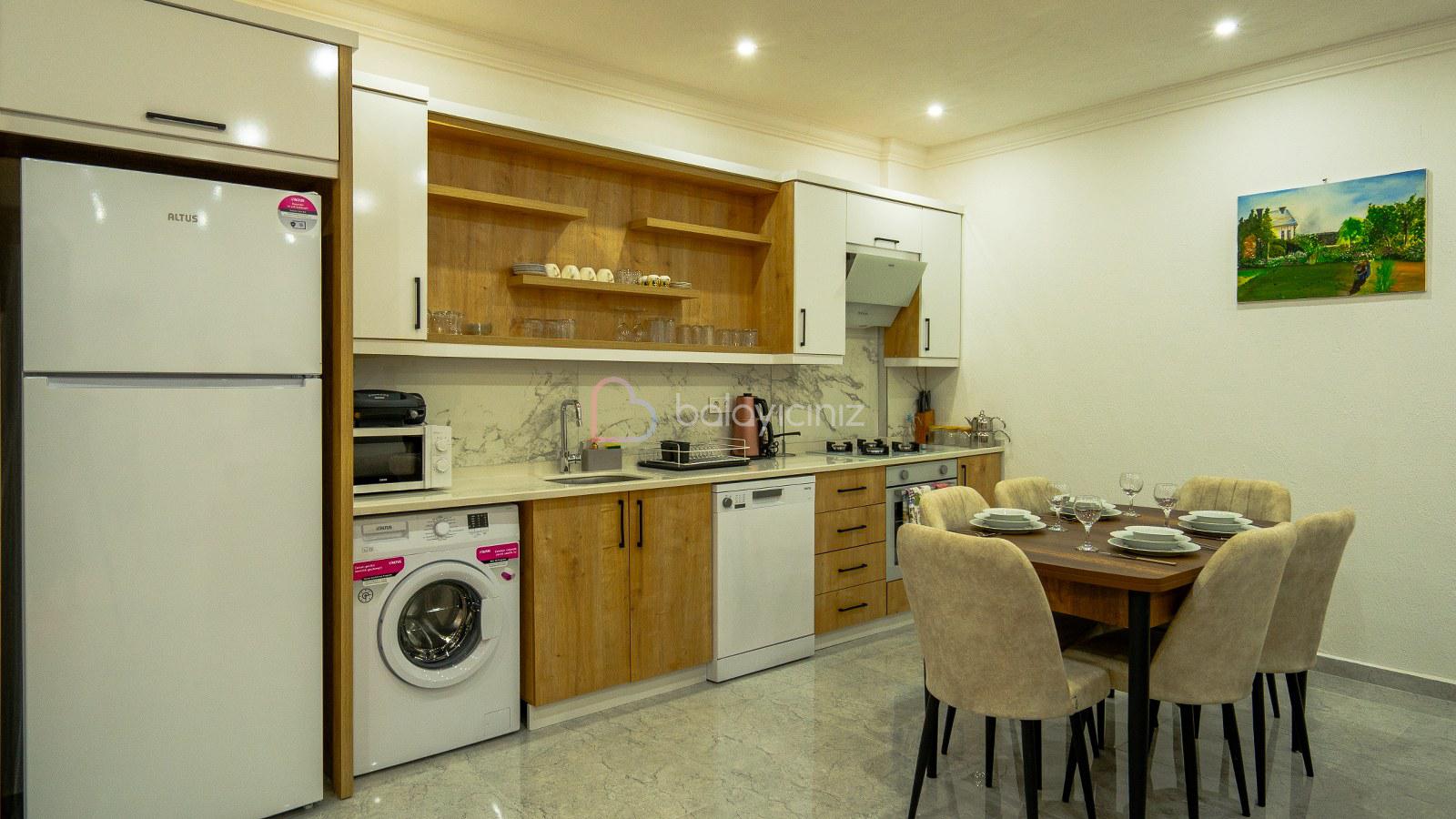Modern açık mutfak içerisinde buzdolabı, bulaşık makinesi, fırın, ocak, mikrodalga fırın, yemek masası, yemek takımları, çatal ve bıçak takımları, tencere ve tava takımları, bardaklar bulunmaktadır.