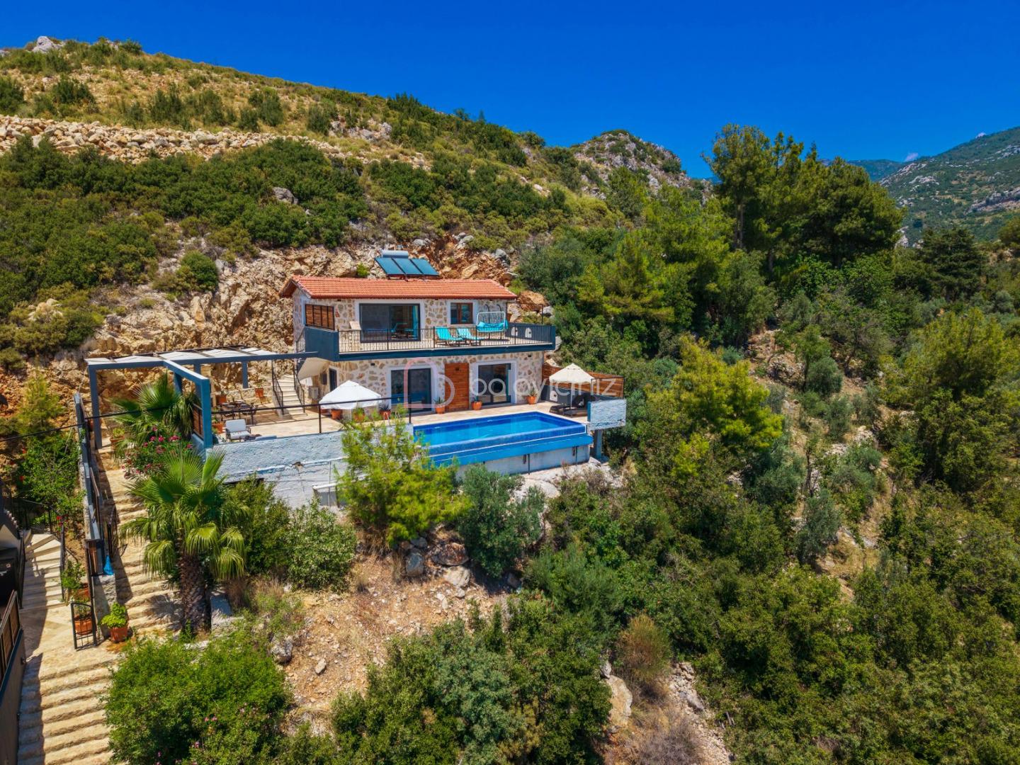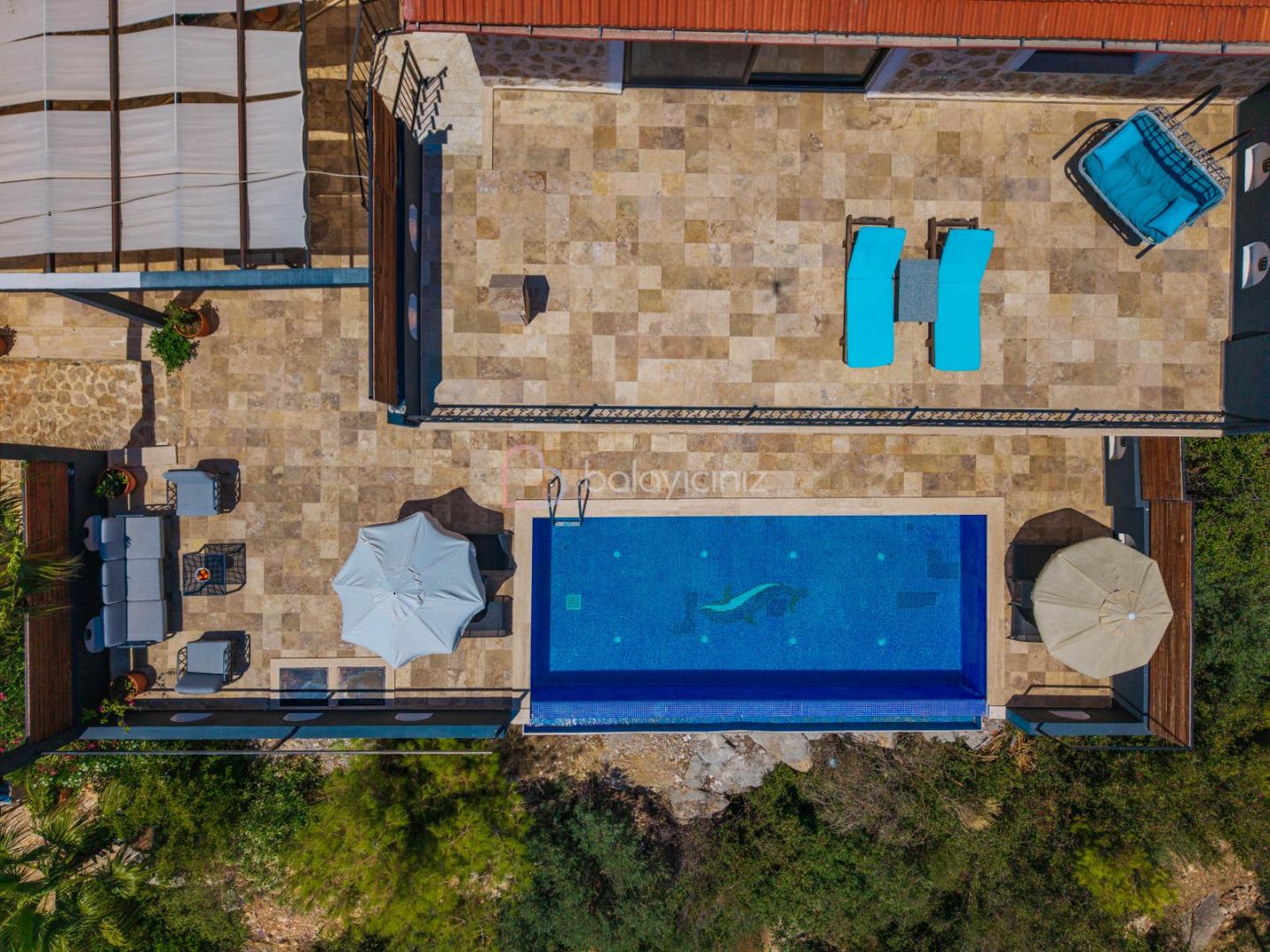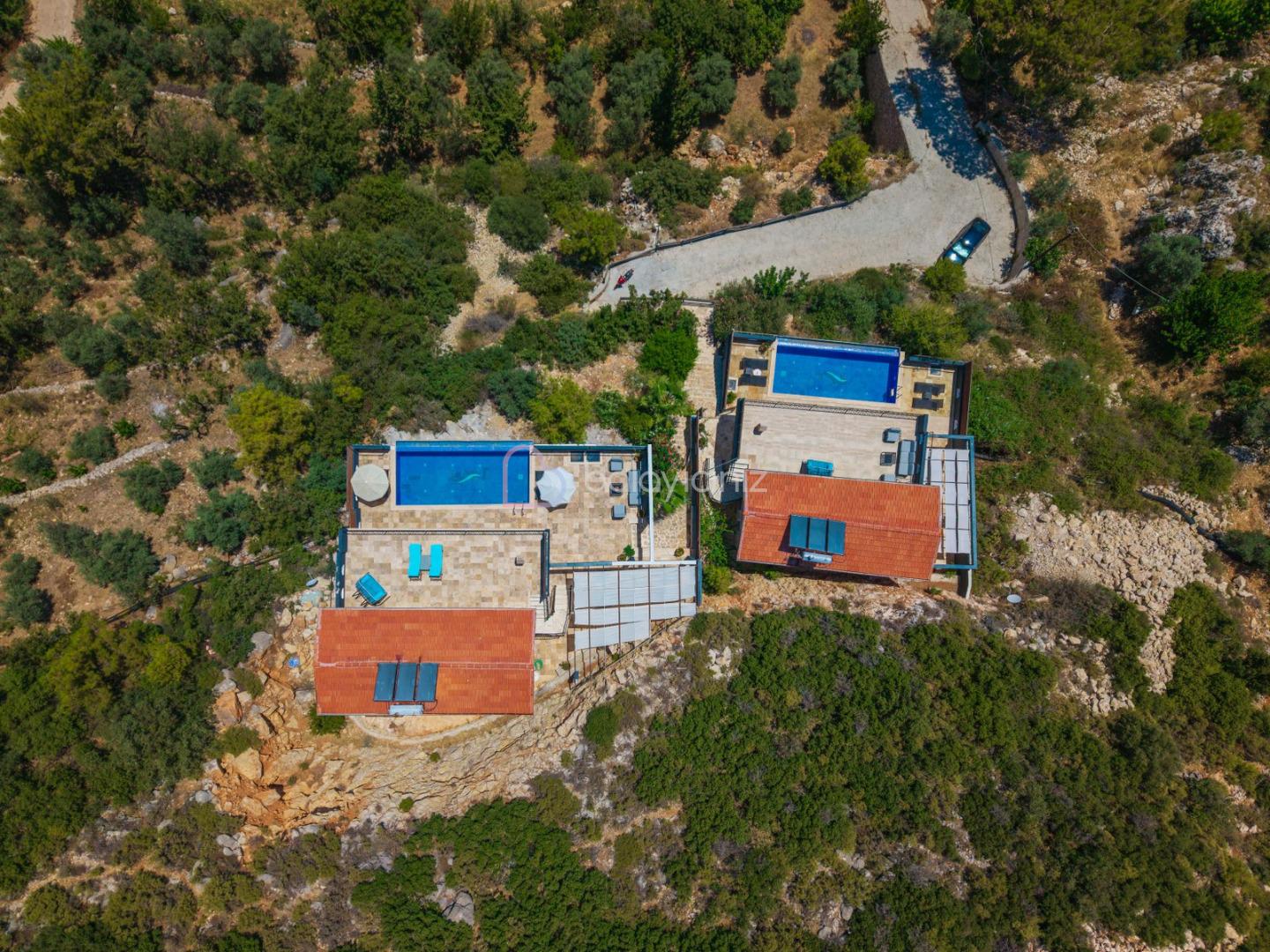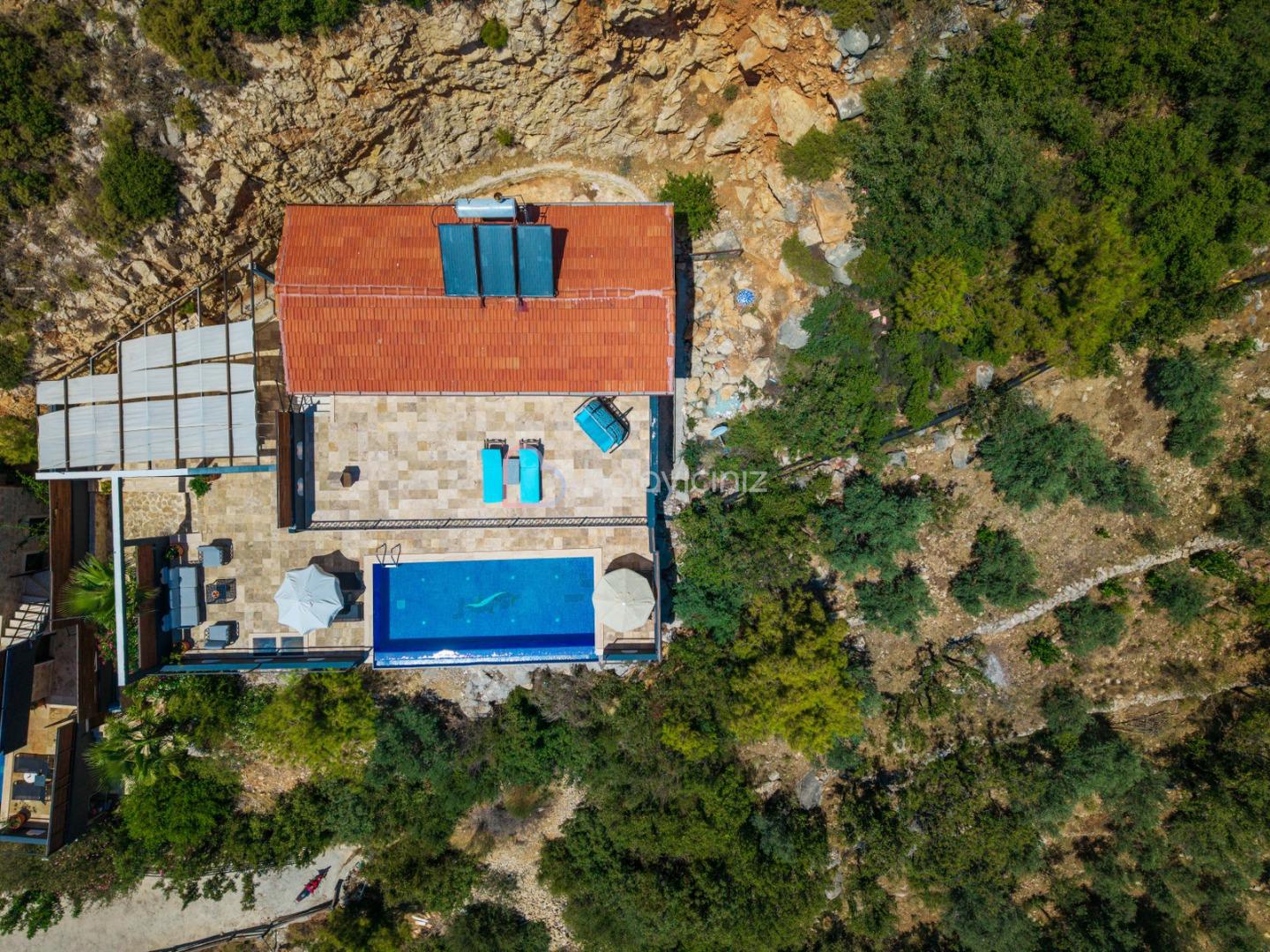 Villanın güneşlenme terası ve havuzunun dış taraftan görünmemesi için gerekli önlemler alınmıştır fakat villanın diğer bölümlerinin görünürlüğü kesin olarak garanti edilememektedir.