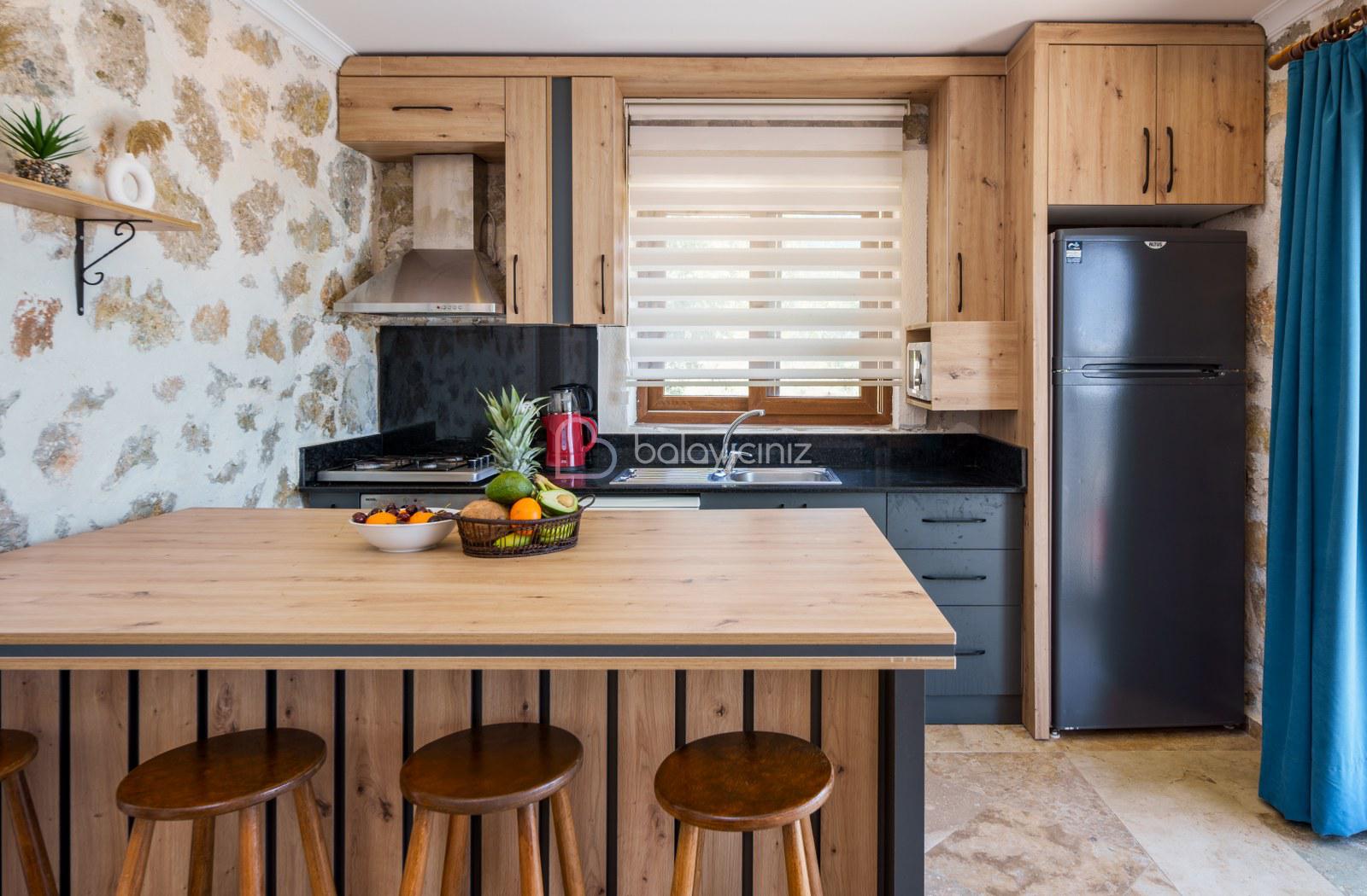 Amerikan mutfak, buzdolabı, bulaşık makinesi, çamaşır makinesi, fırın, 4’lü Ocak (ankastre), elektrikli su ısıtıcı, tava, tencere vb. mutfak ekipmanları, yemek masası, yemek takımı bulunmaktadır.