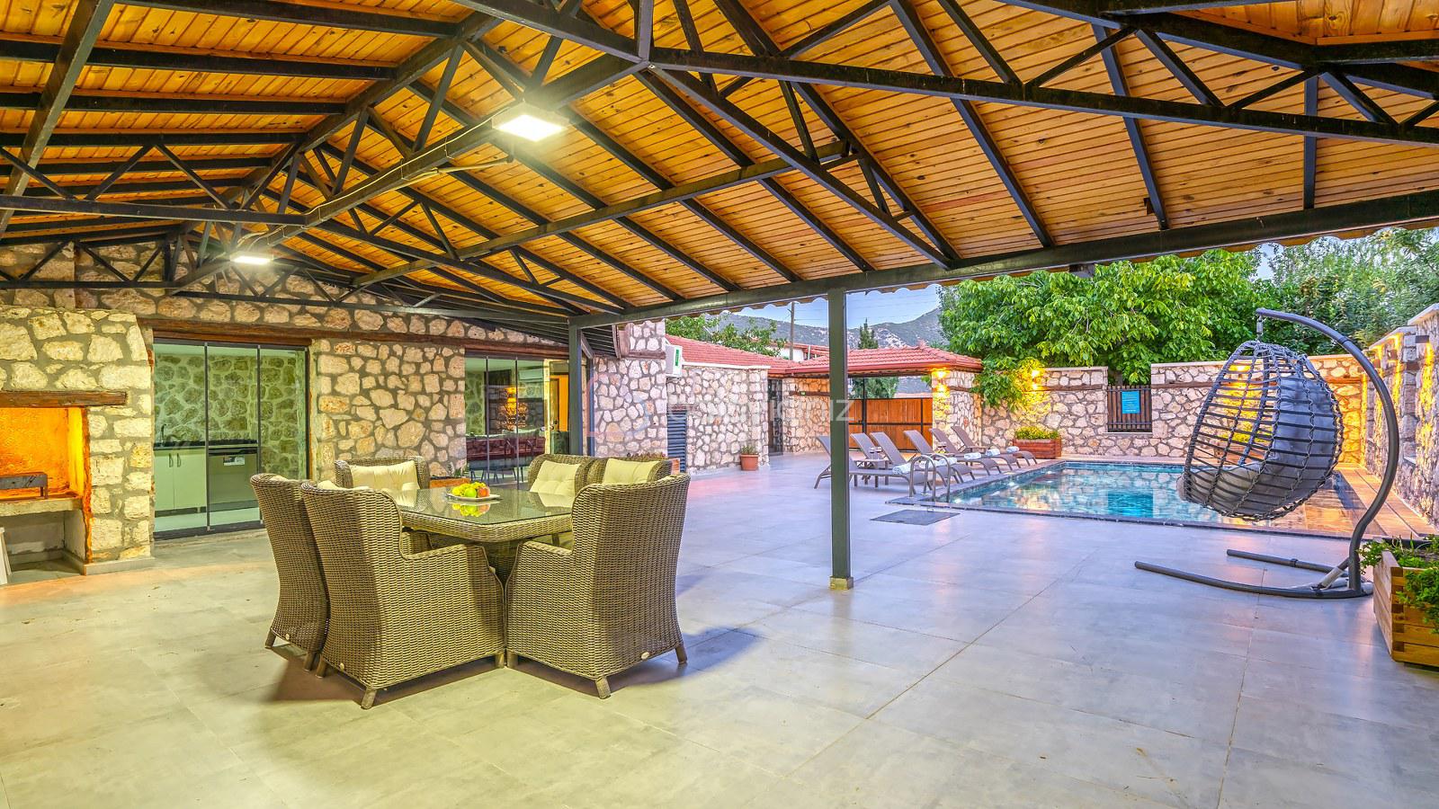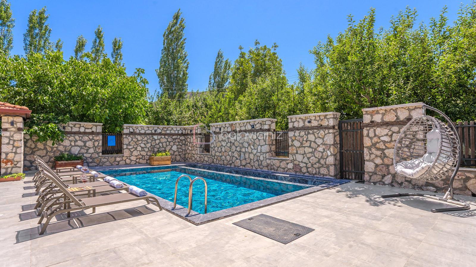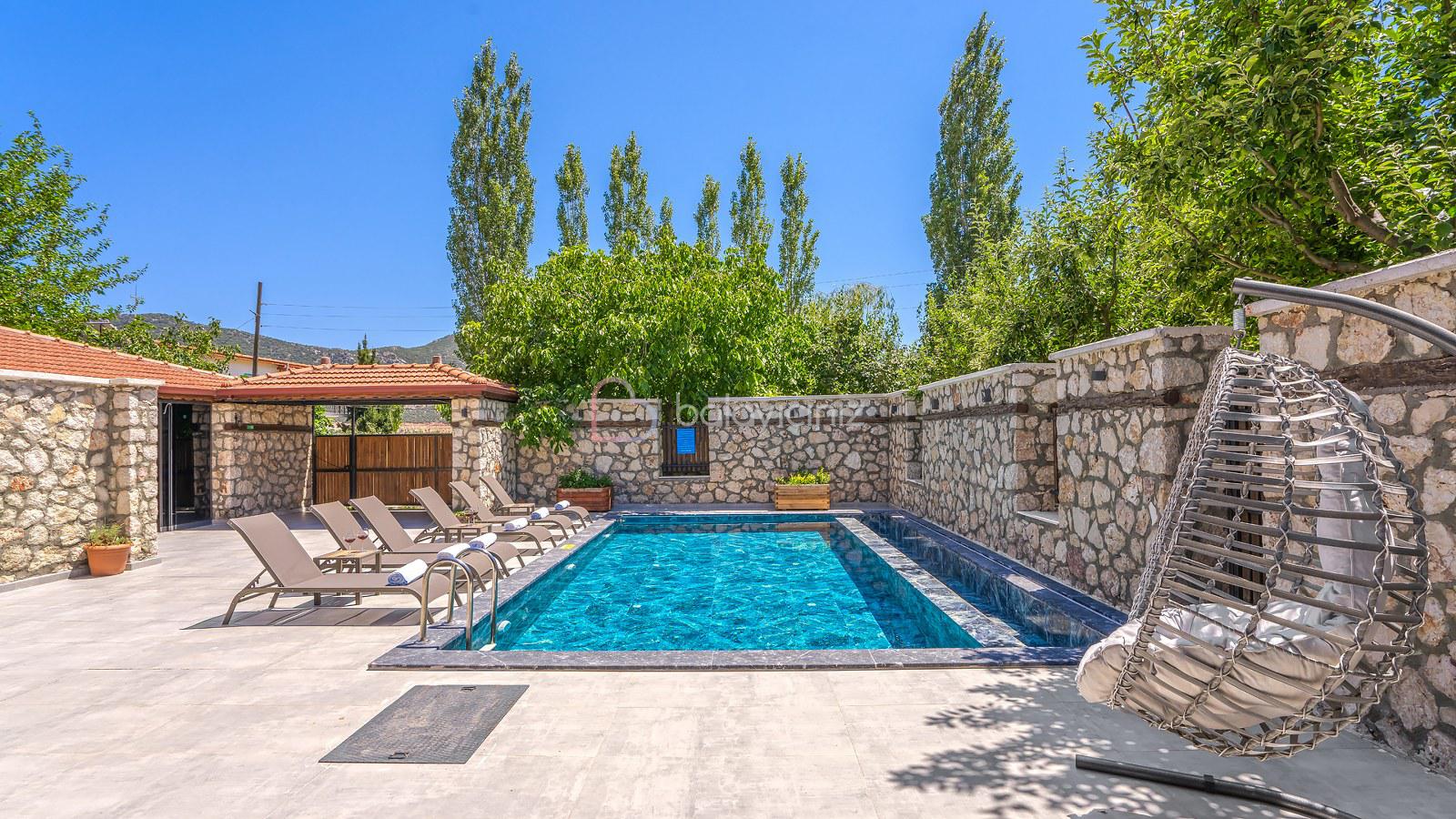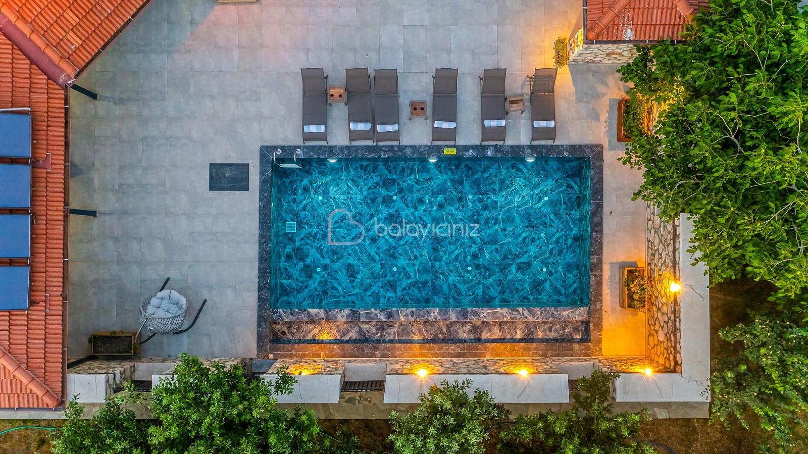 Havuz terasında özel yüzme havuzu, şezlonglar, güneş şemsiyesi, bahçe oturma grubu ve yemek masası, barbekü bulunmaktadır.