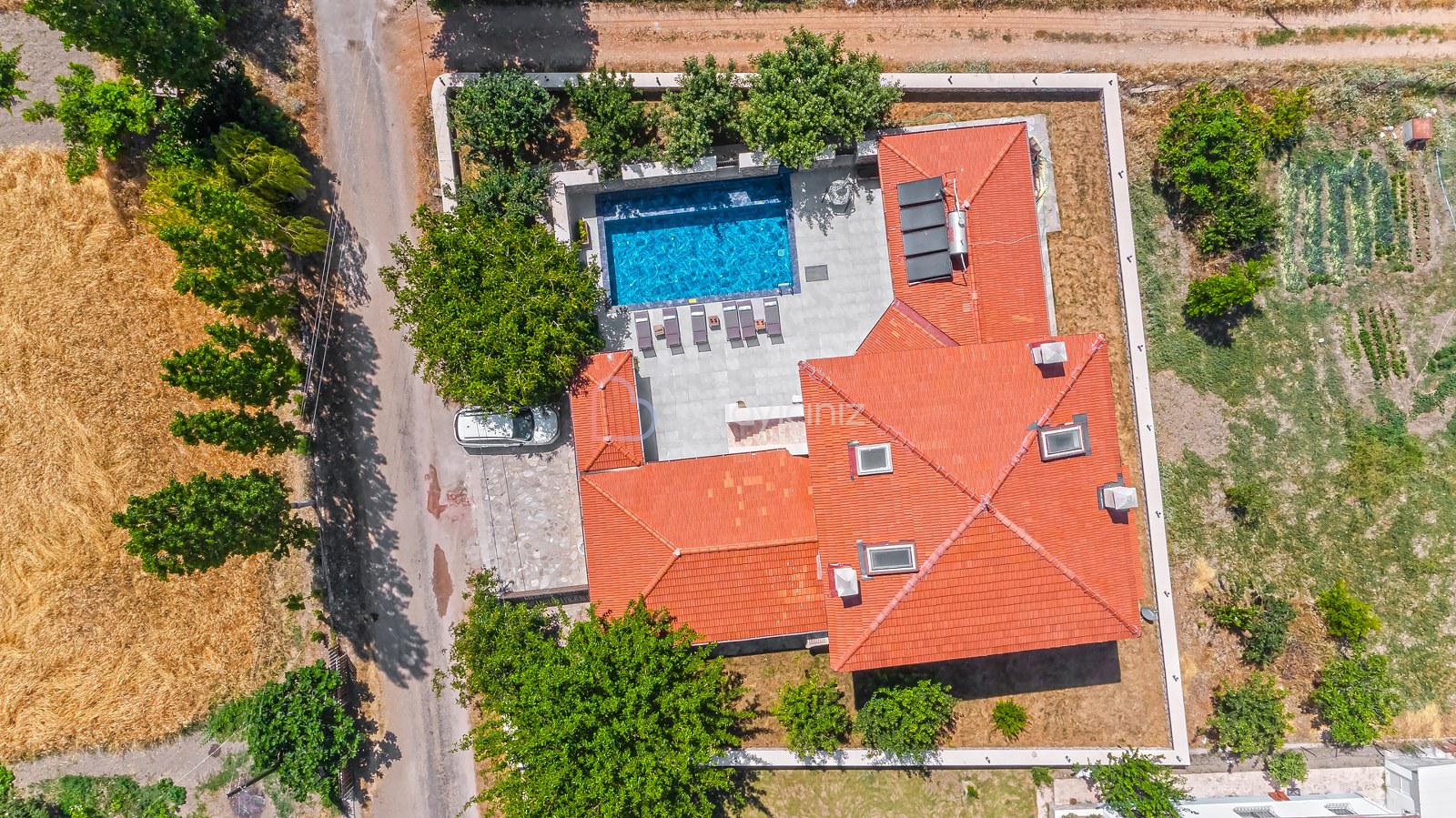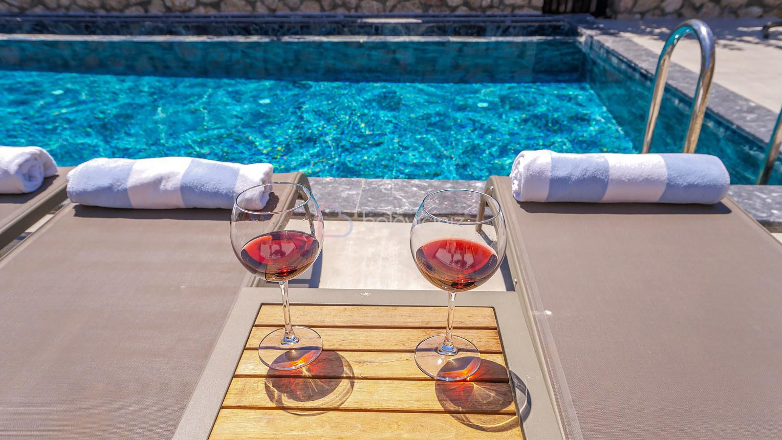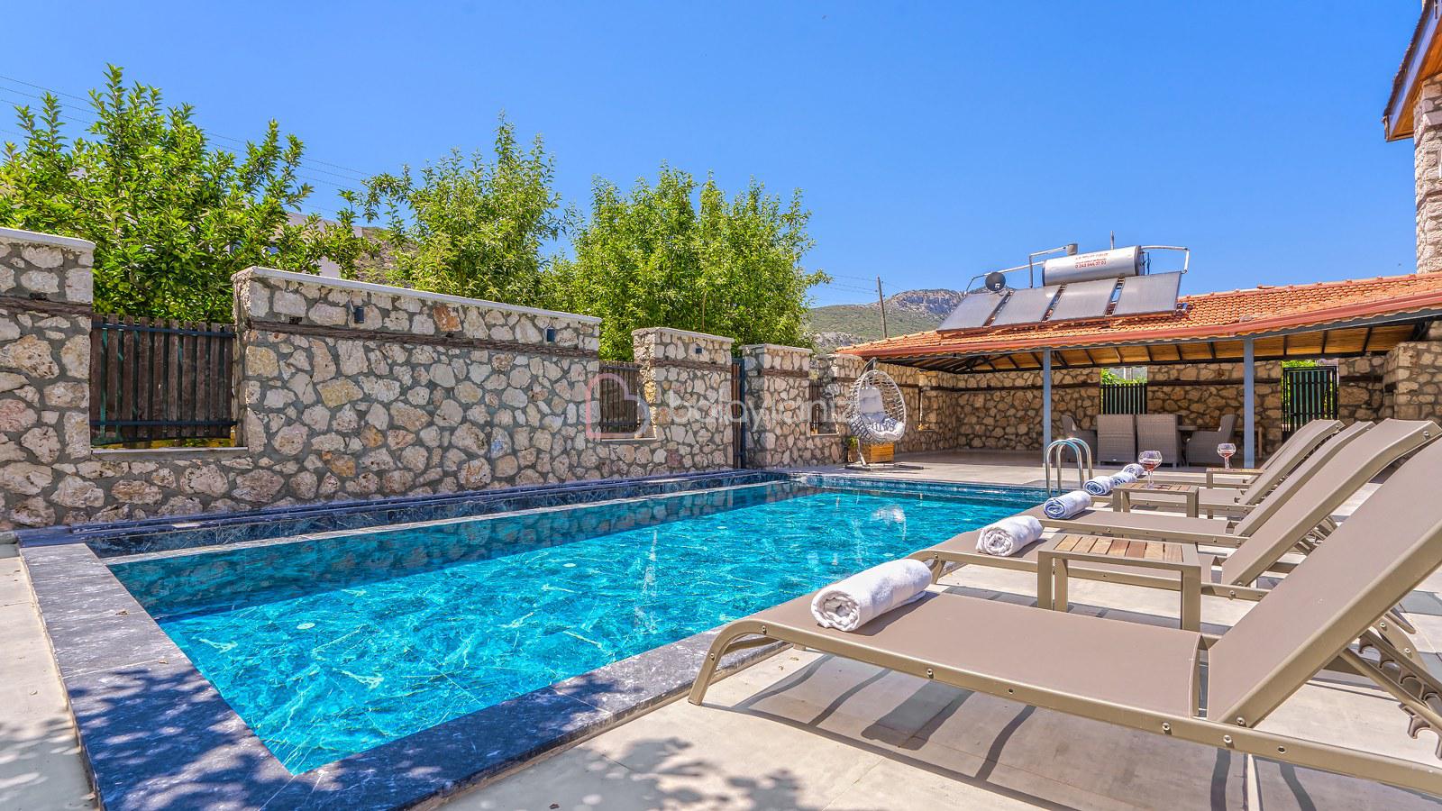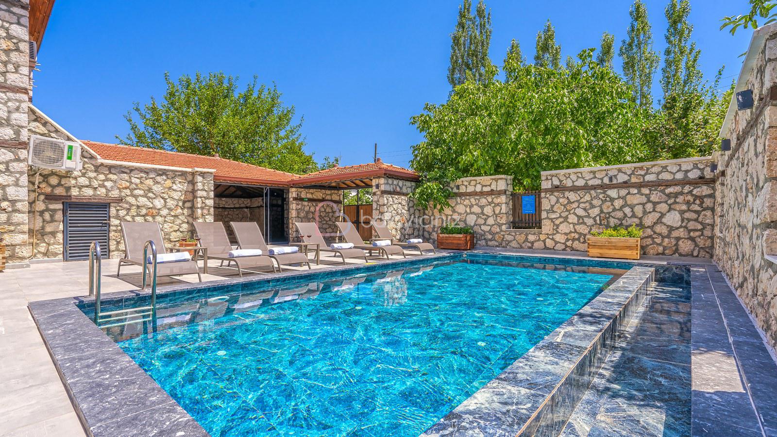 Havuz terasında özel yüzme havuzu, şezlonglar, güneş şemsiyesi, bahçe oturma grubu ve yemek masası, barbekü bulunmaktadır.