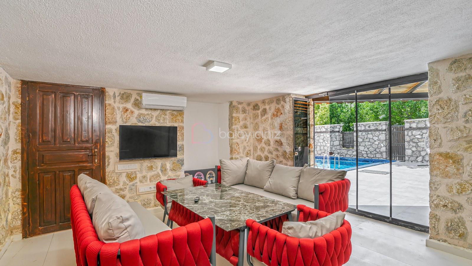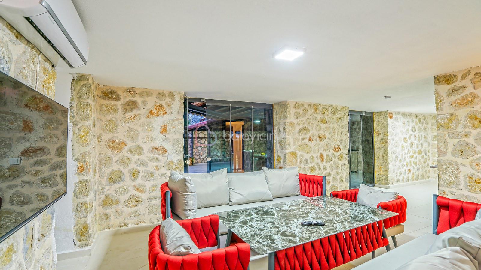 Salon içerisinde oturma grubu, televizyon, klima, sehpa, yemek masası ve sandalyeler, havuz terasına çıkış yapılabilmektedir.