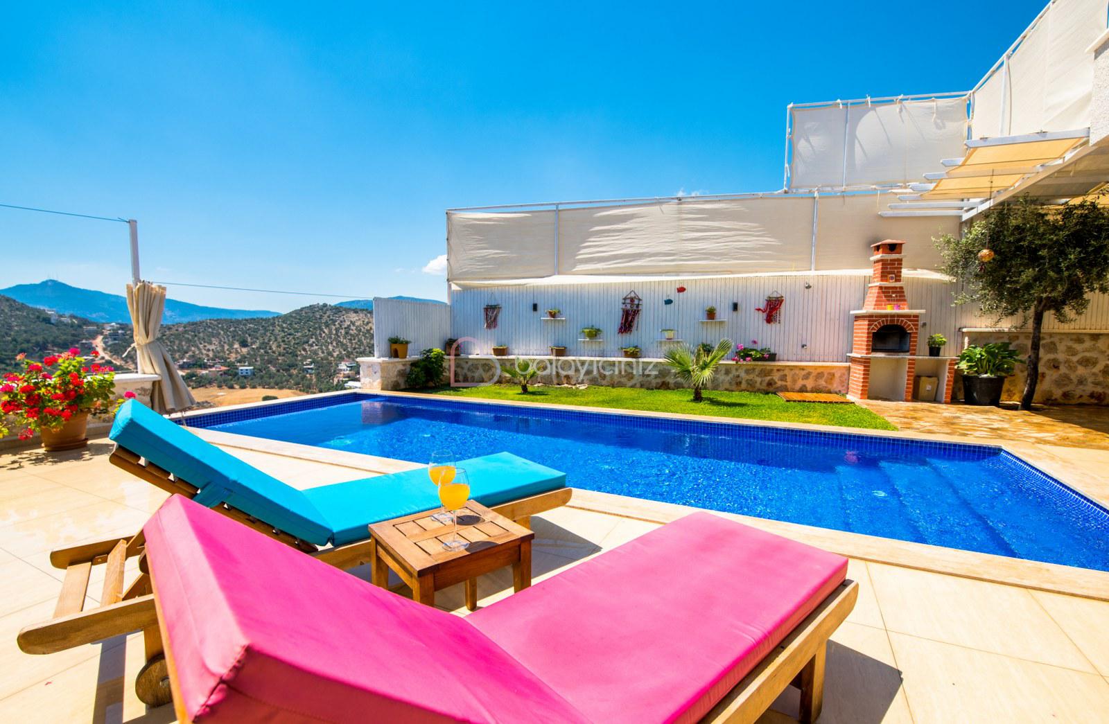 Terasında özel yüzme havuzu, şezlonglar, güneş şemsiyeleri, masa ve sandalyeler, pergola, mangal bulunmaktadır.