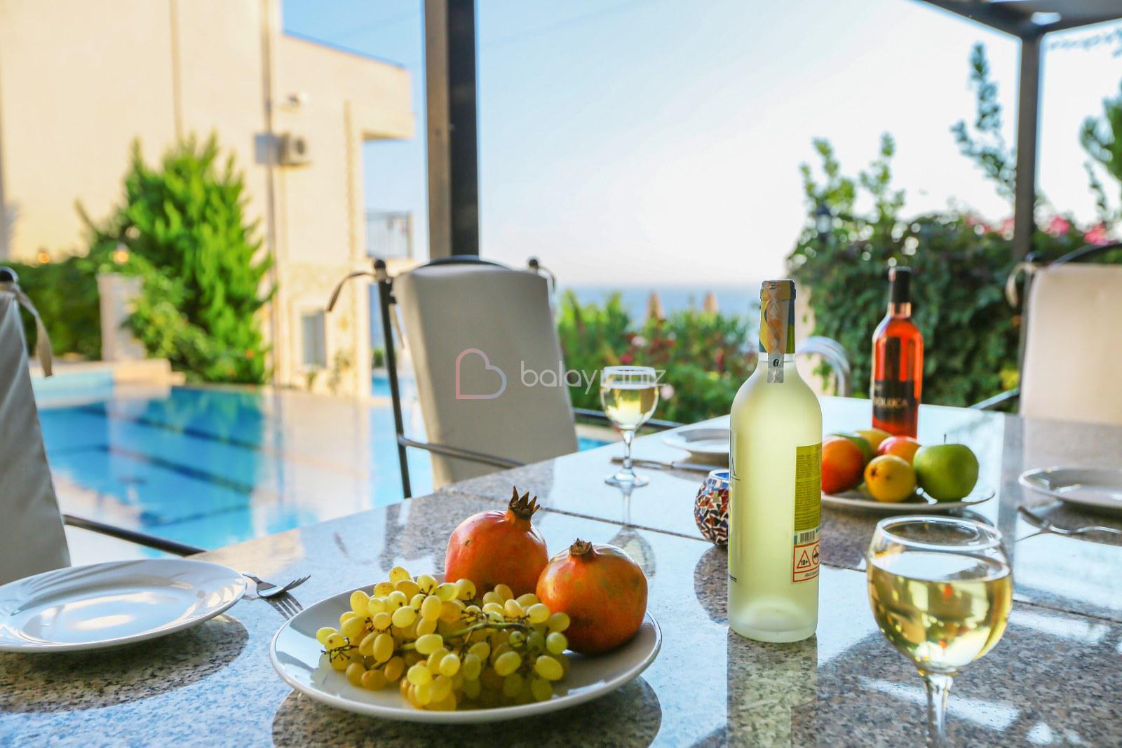 (Havuz katında), oturma grubu, yemek masası, uydu alıcı, TV, DVD Player, klima, lavabo, ütü, ütü masası, müzik çalar, elektrik süpürgesi, kablosuz modem ve direk havuz başına çıkış bulunmaktadır.