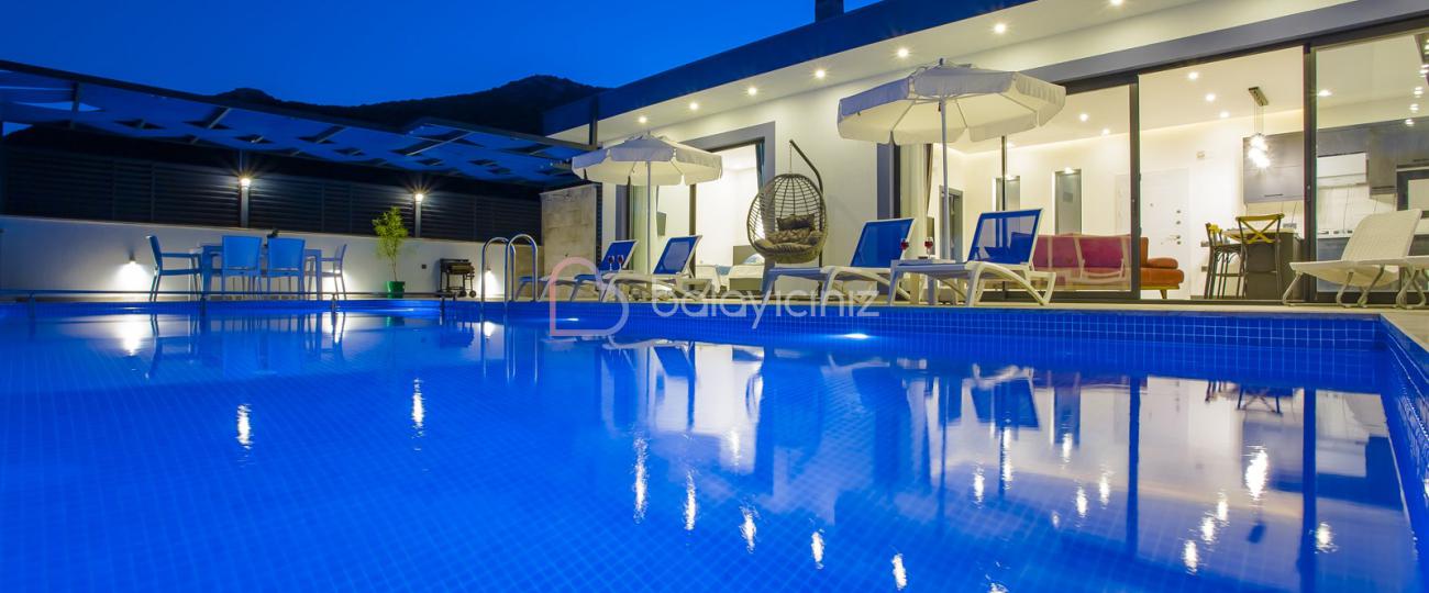 Villamızın özel yüzme havuzu muhafazakâr olup dışarıdan kesinlikle görünmemektedir. Şezlong, şemsiye, yemek masası, mangal bulunmaktadır.
