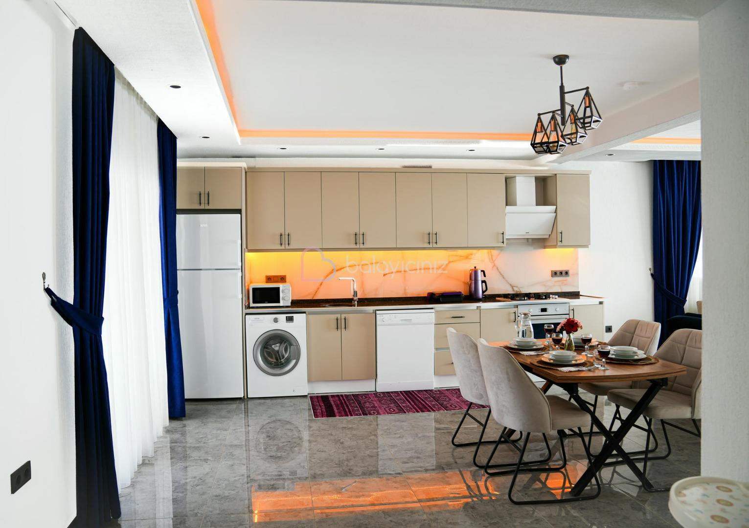 Modern açık mutfak içerisinde buzdolabı, bulaşık makinesi, fırın, ocak, mikrodalga fırın, yemek masası, yemek takımları, çatal ve bıçak takımları, tencere ve tava takımları, bardaklar bulunmaktadır.