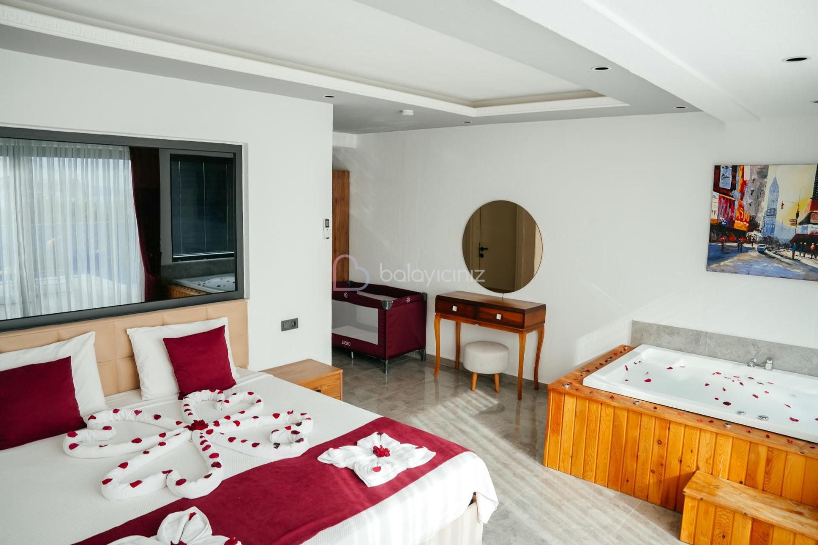 1. Yatak Odası: 1 adet çift kişilik yatak, klima, komodin, elbise dolabı, makyaj masası, jakuzi, banyo ve tuvalet bulunmaktadır.