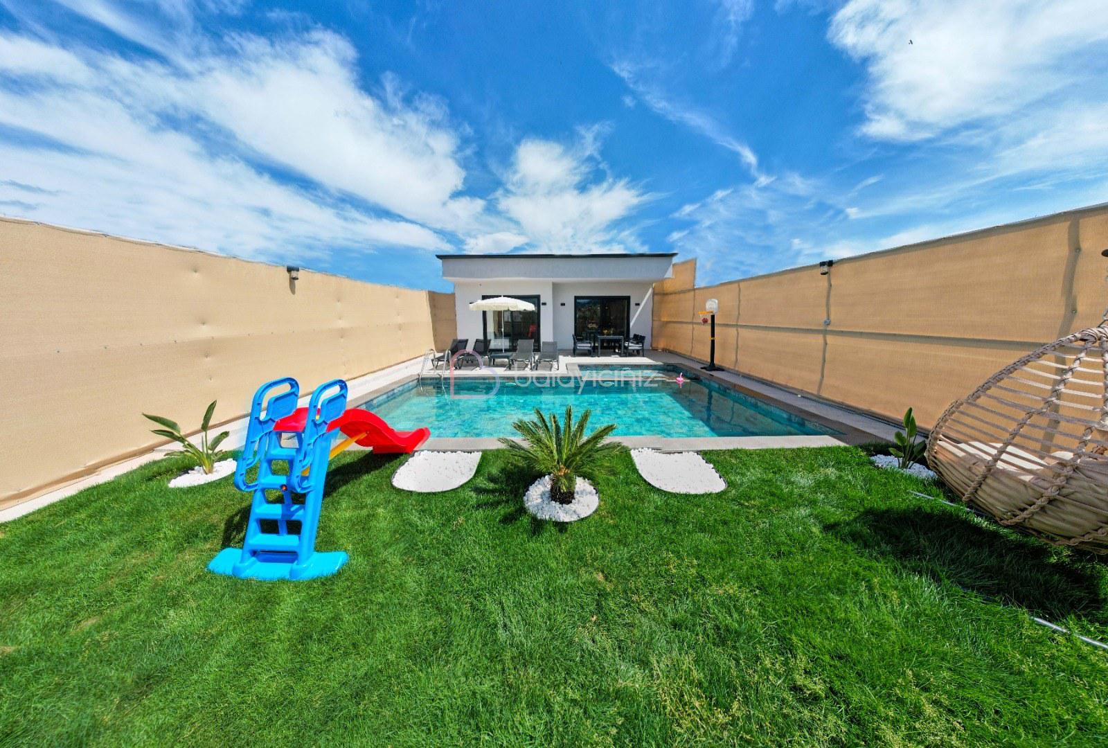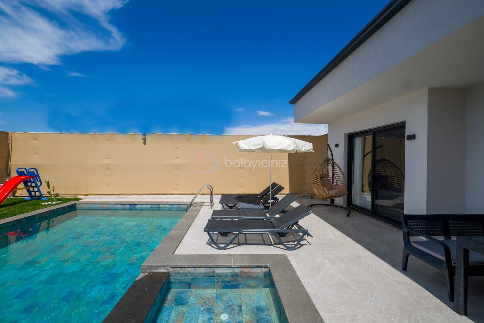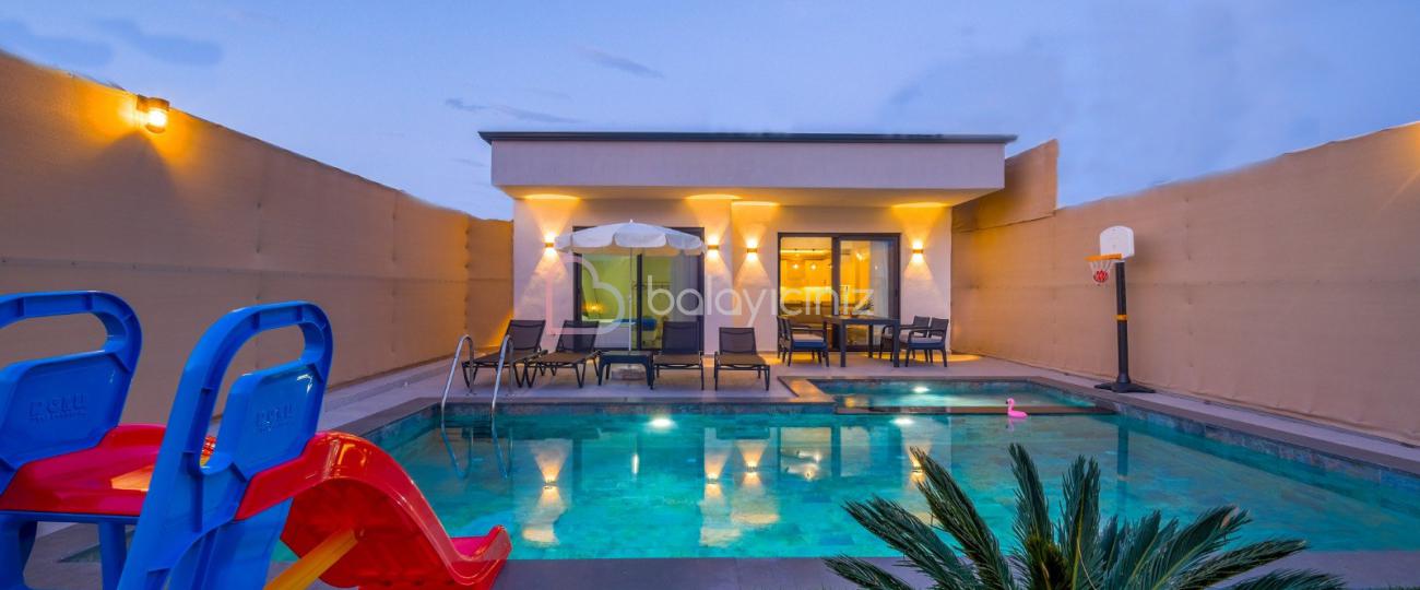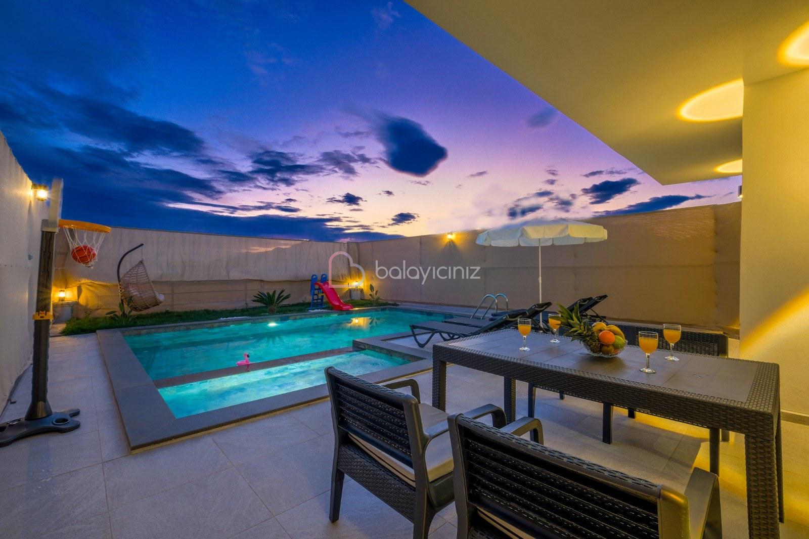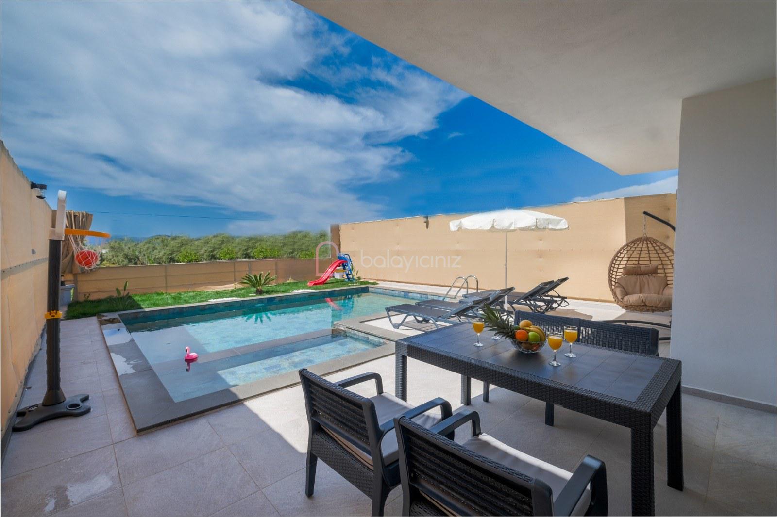 Havuz terasında özel yüzme havuzu, şezlonglar, güneş şemsiyesi, yemek masası, mini kaydırak, mini basket potası, salıncak, mangal bulunmaktadır.