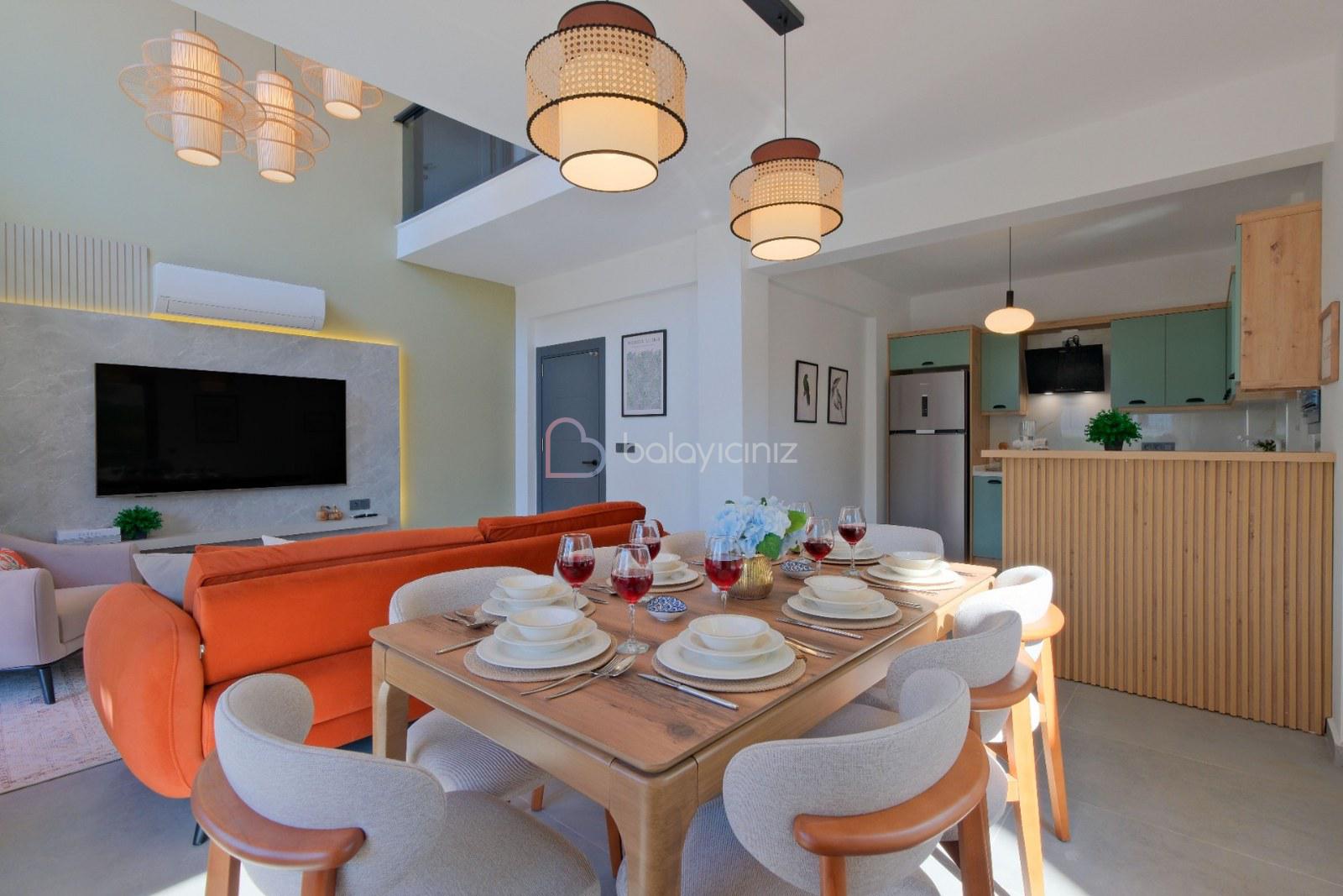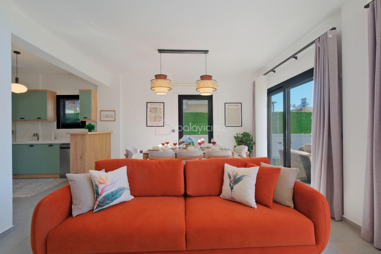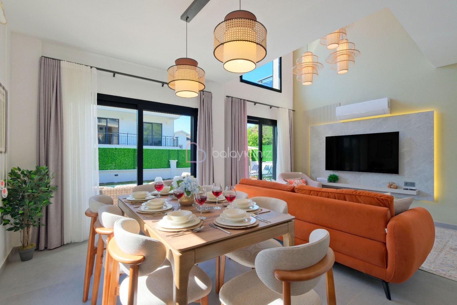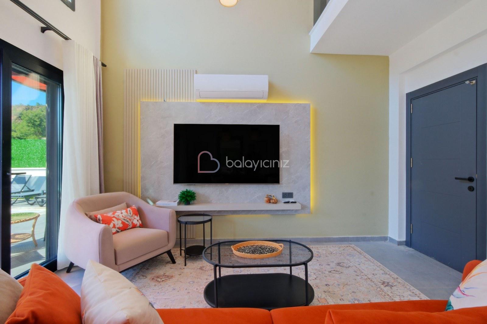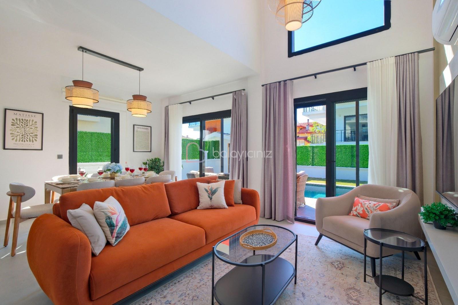 Salon içerisinde konforlu oturma grubu, sehpa, televizyon, uydu alıcı, klima. Salondan havuz terasına çıkış bulunmaktadır.