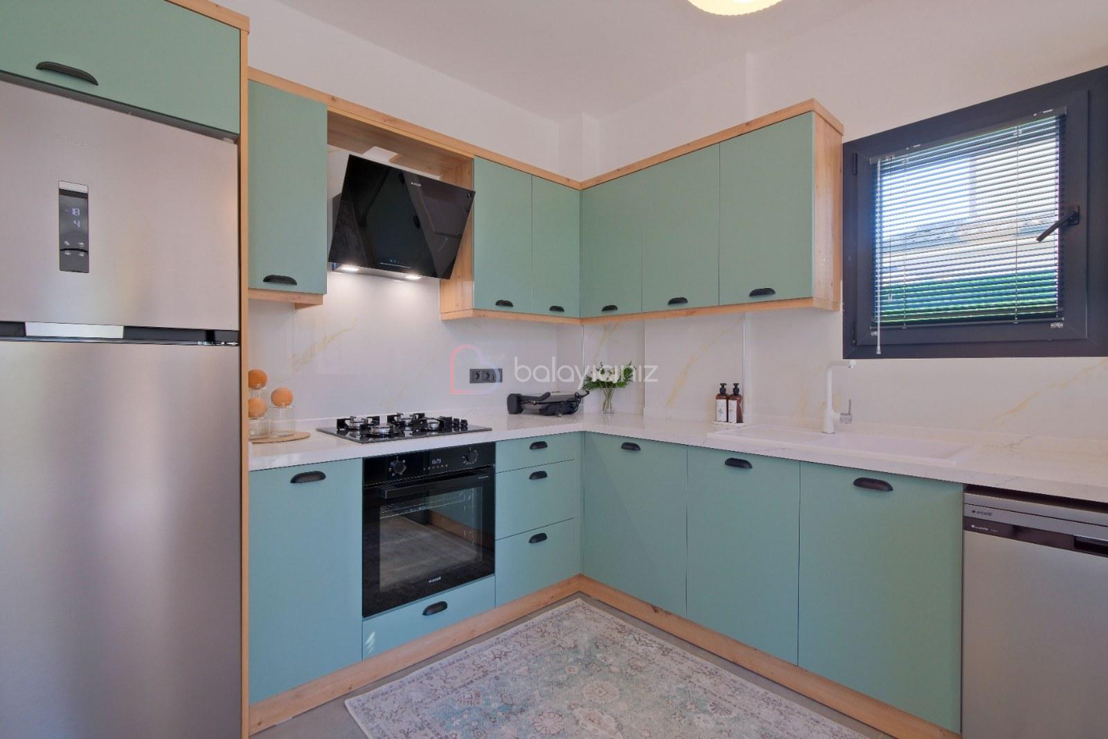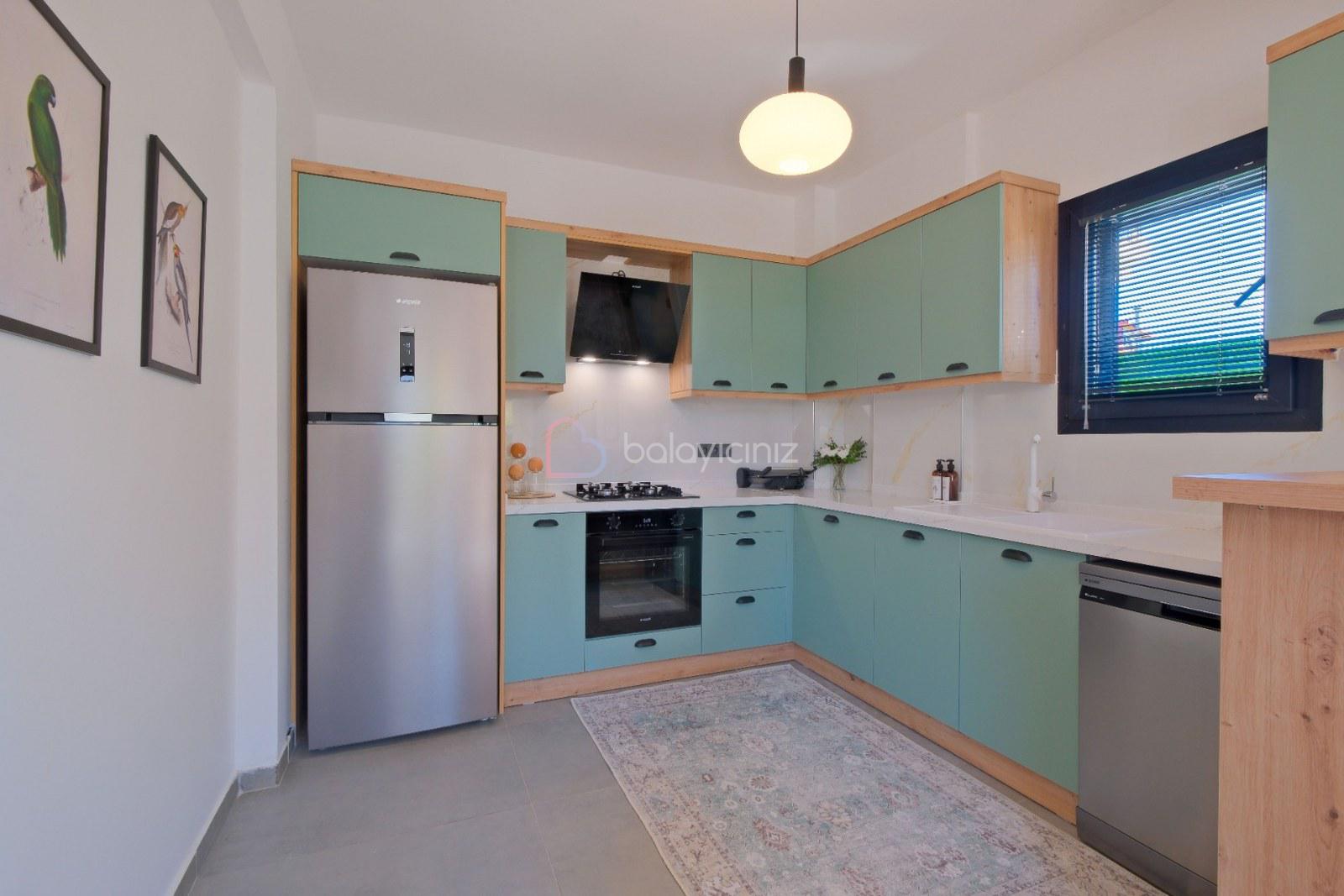 Buzdolabı, fırın, mikrodalga, çamaşır makinesi, bulaşık makinesi, 4’lü ocak, kahve makinasi, elektrikli su ısıtıcısı (kettle), elektrikli süpürge, 8 kişilik yemek takımı, tava, tencereler, çatal ve bıçak takımı ve diğer mutfak malzemesi mevcuttur. Havuz terasına çıkış bulunmaktadır.