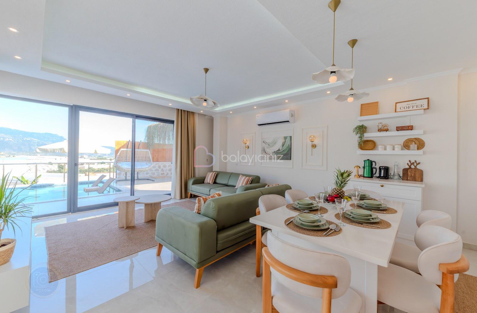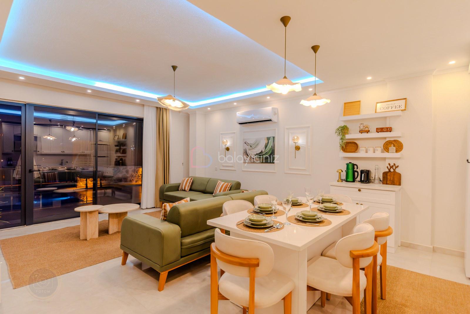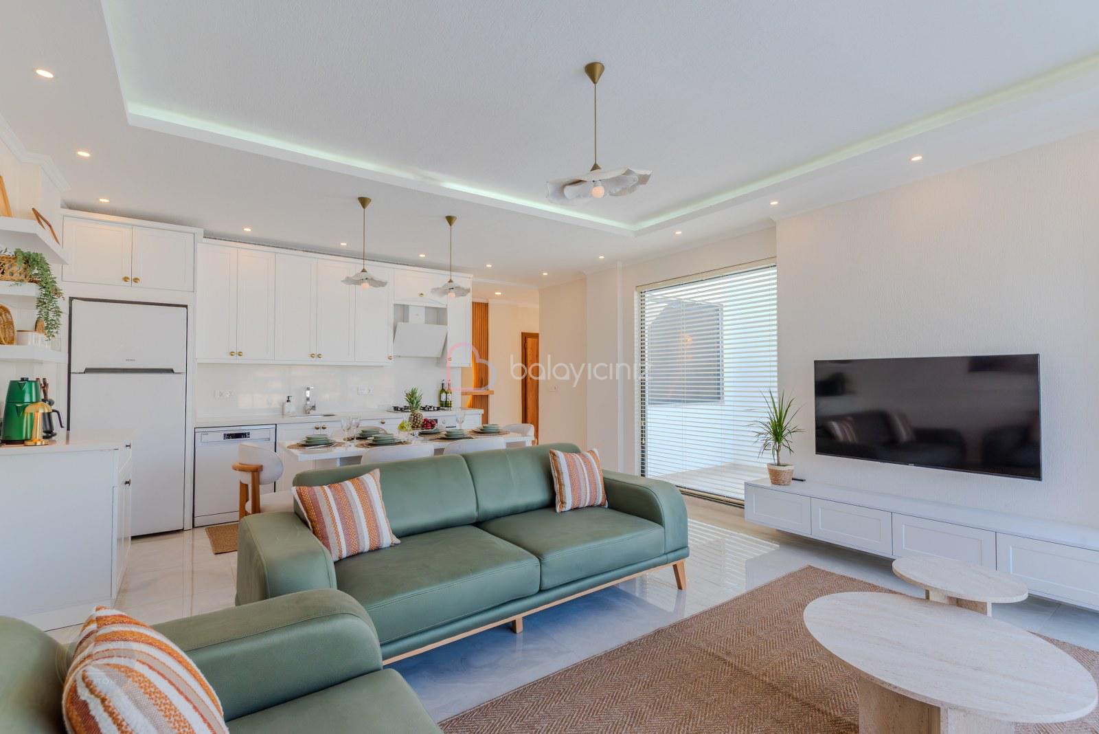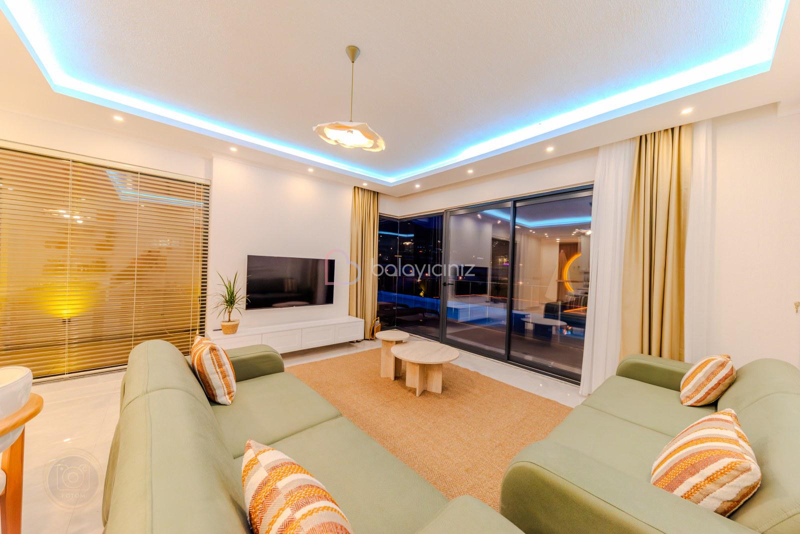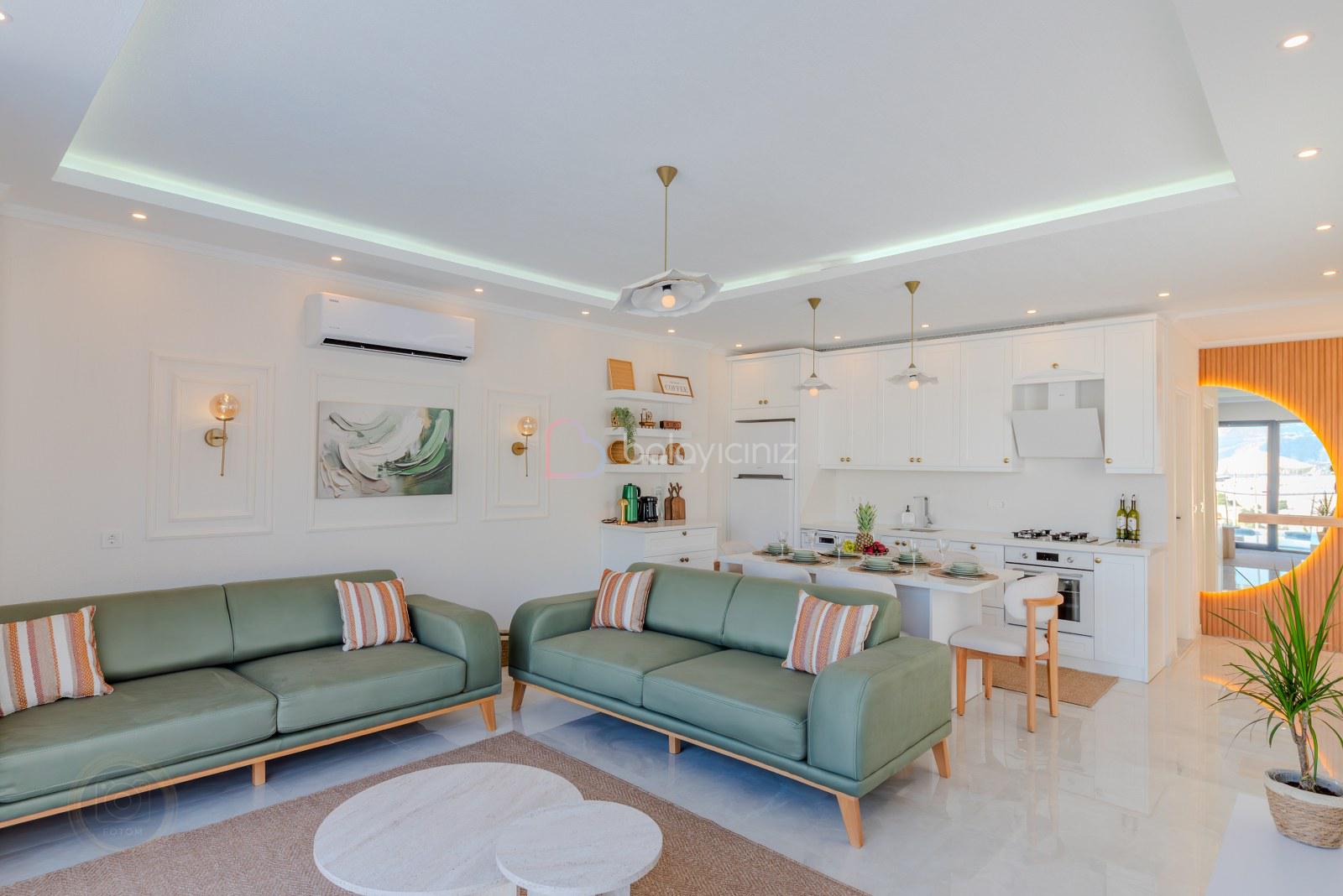 Oturma grubu, uydu alici, televizyon, klima, orta sehpa, internet ve havuza çikis bulunmaktadir.