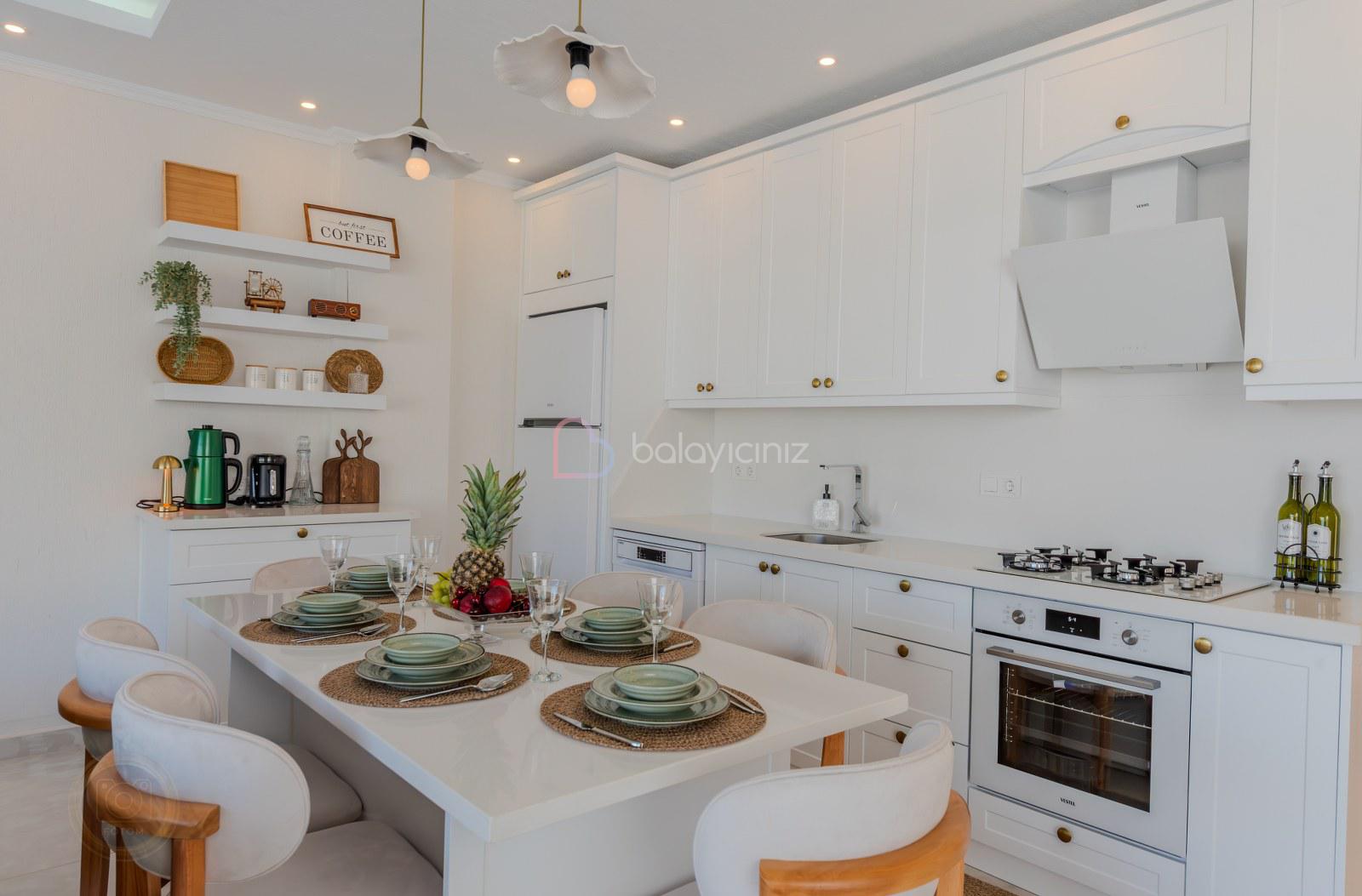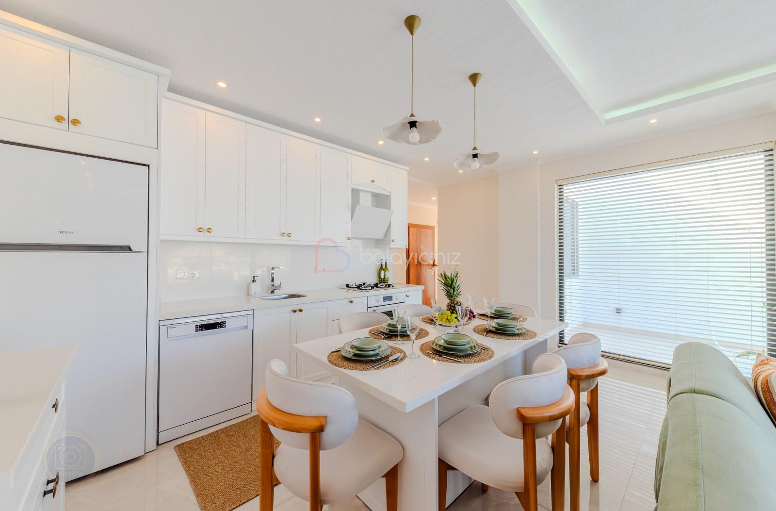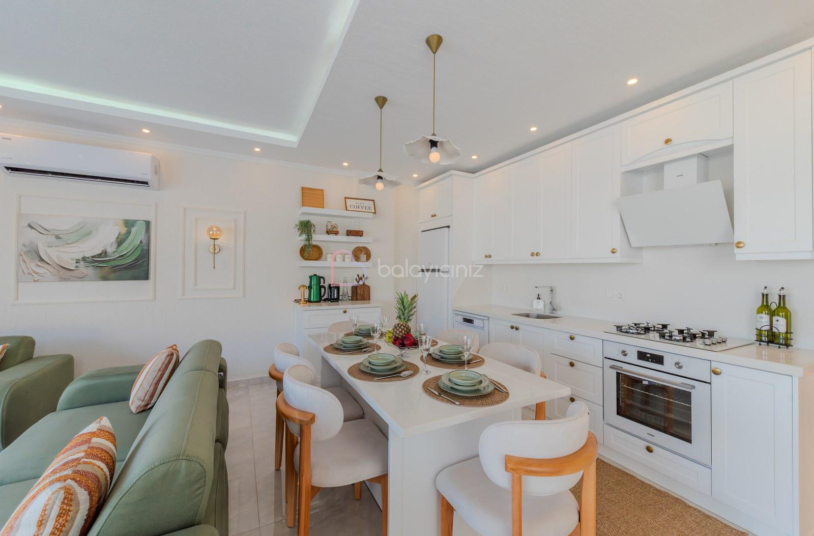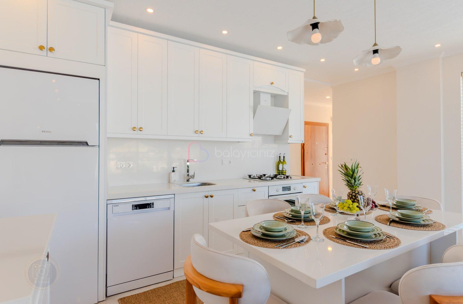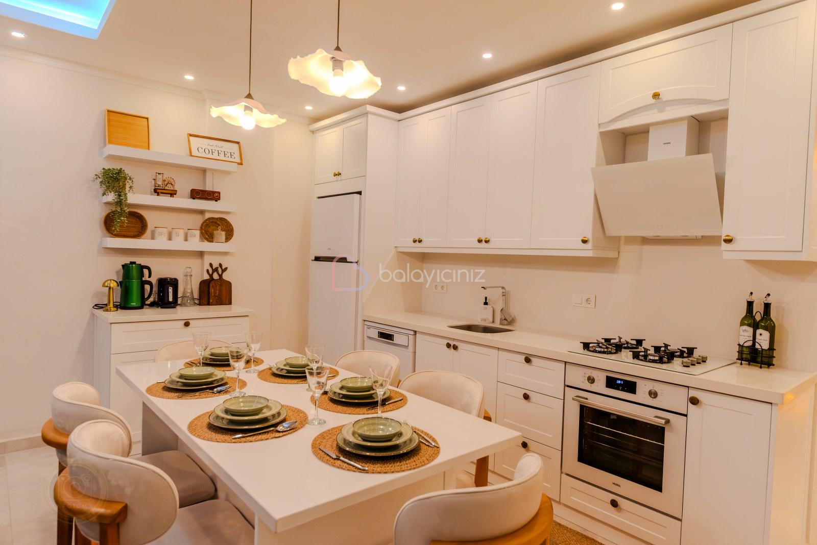 Modern Amerikan mutfak, buzdolabi, bulasik makinesi, çamasir makinesi, ankastre firin, mikrodalga firin, ankastre 4’lü ocak, elektrikli su isiticisi(kettle), yemek takimi, çesitli mutfak araç gereçleri.