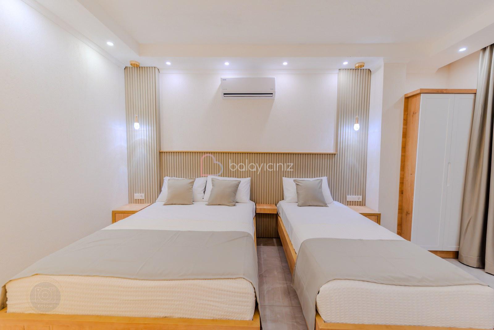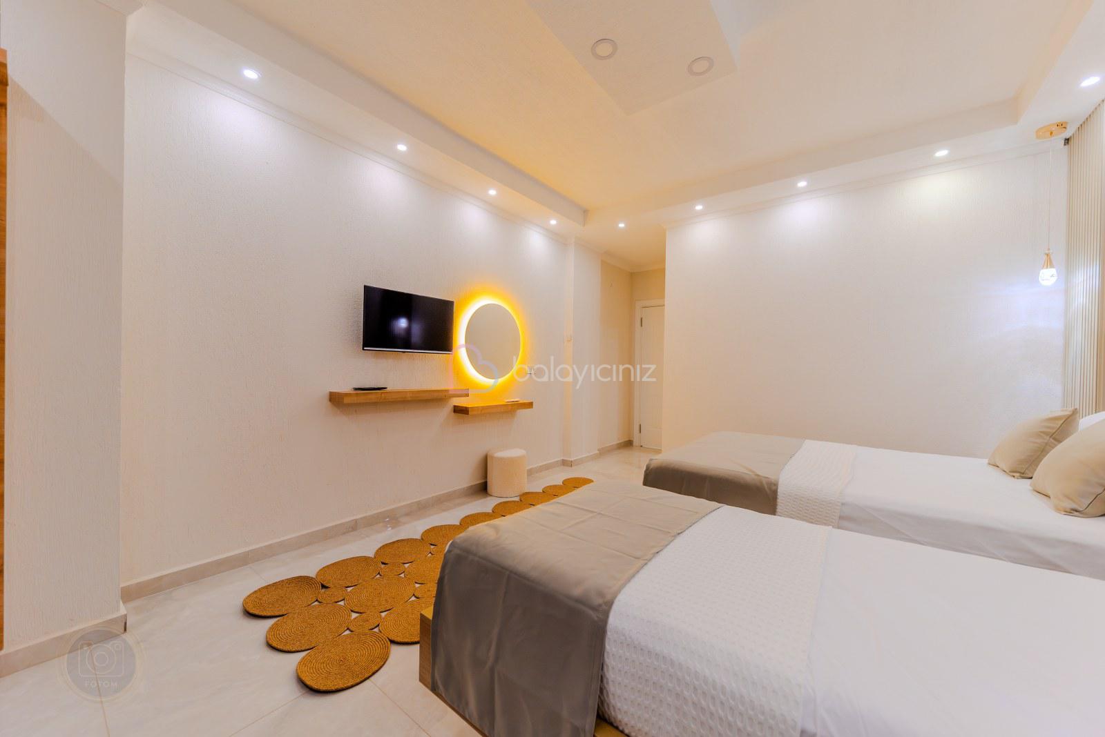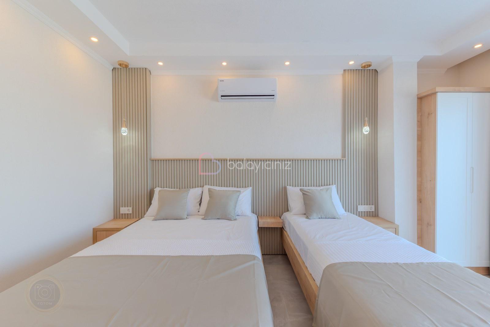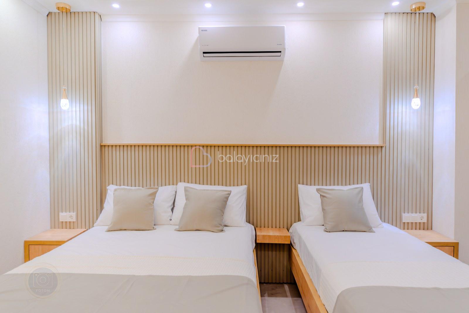 2. Yatak Odasi: 1 adet çift kisilik yatak, 1 adet tek kişilik yatak, komodin, elbise dolabi, makyaj masasi, klima ve banyo bulunmaktadir.