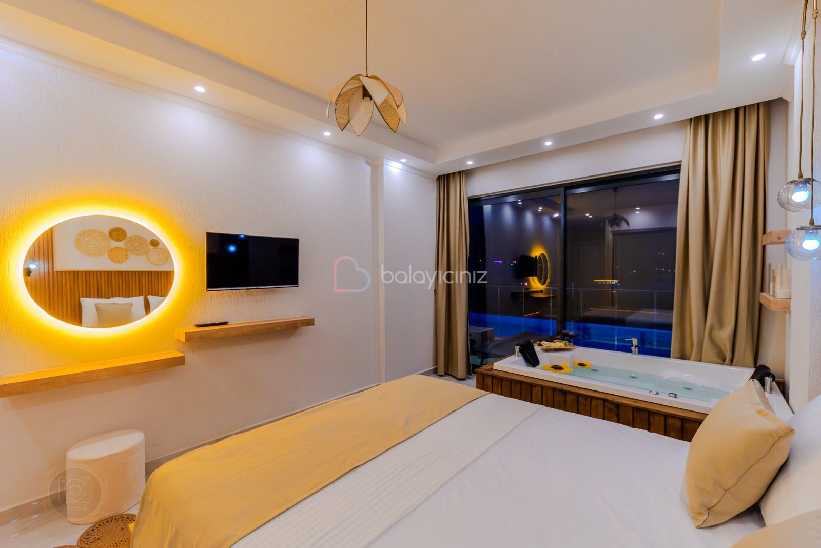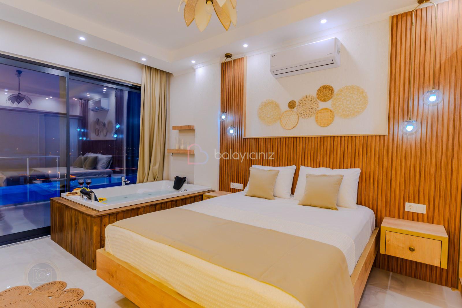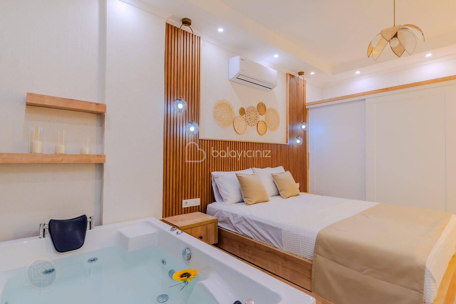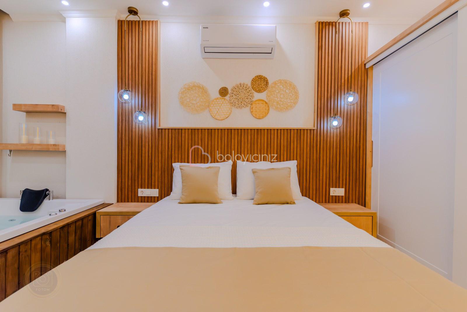 1. Yatak Odasi: 1 adet çift kisilik yatak, elbise dolabi, komodin, makyaj masasi, klima, jakuzi, banyo bulunmaktadir