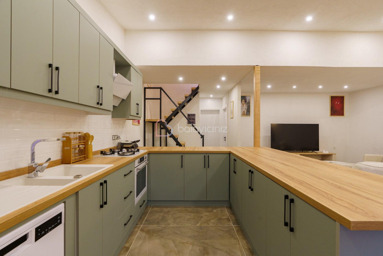 Modern Amerikan mutfakta buz dolabi, bulasik makinasi, 4'lü ocak, firin, mikrodalga firin, ekmek kizartma makinasi, kettle, 4 kisilik yemek masasi, yemek takimlari, çatal ve biçak takimlari, tencere ve tava takimlari, bardaklar bulunmaktadir.