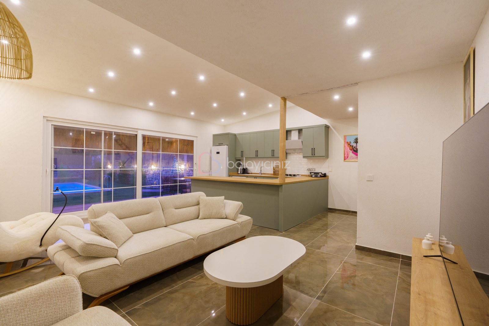 Salonumuzda modern oturma grubu, televizyon, klima, sehpa bulunmaktadir. Havuz terasina çikis yapilabilmektedir.
