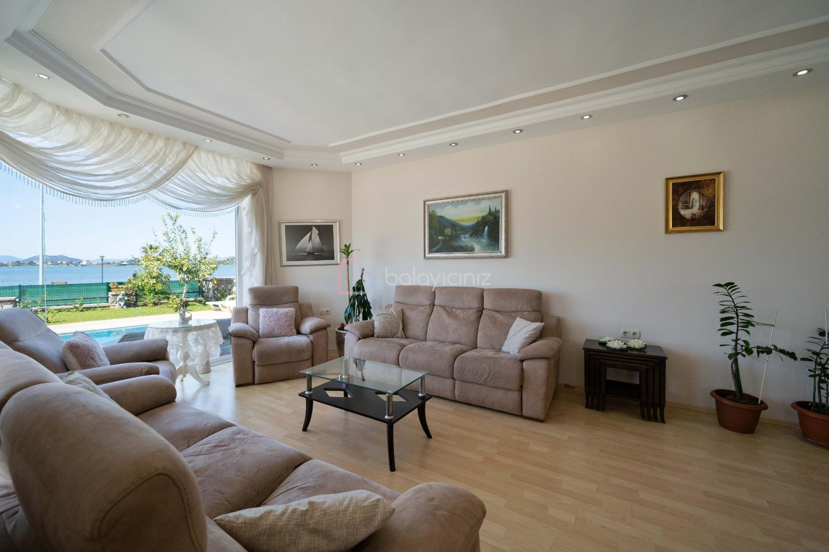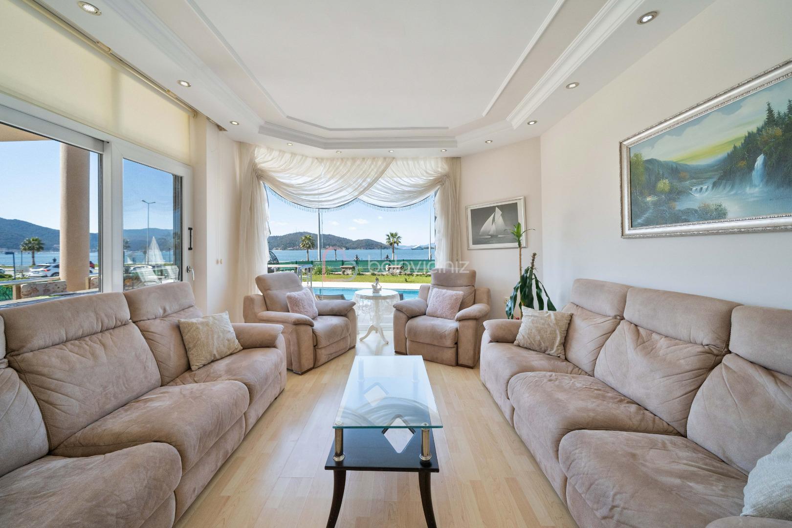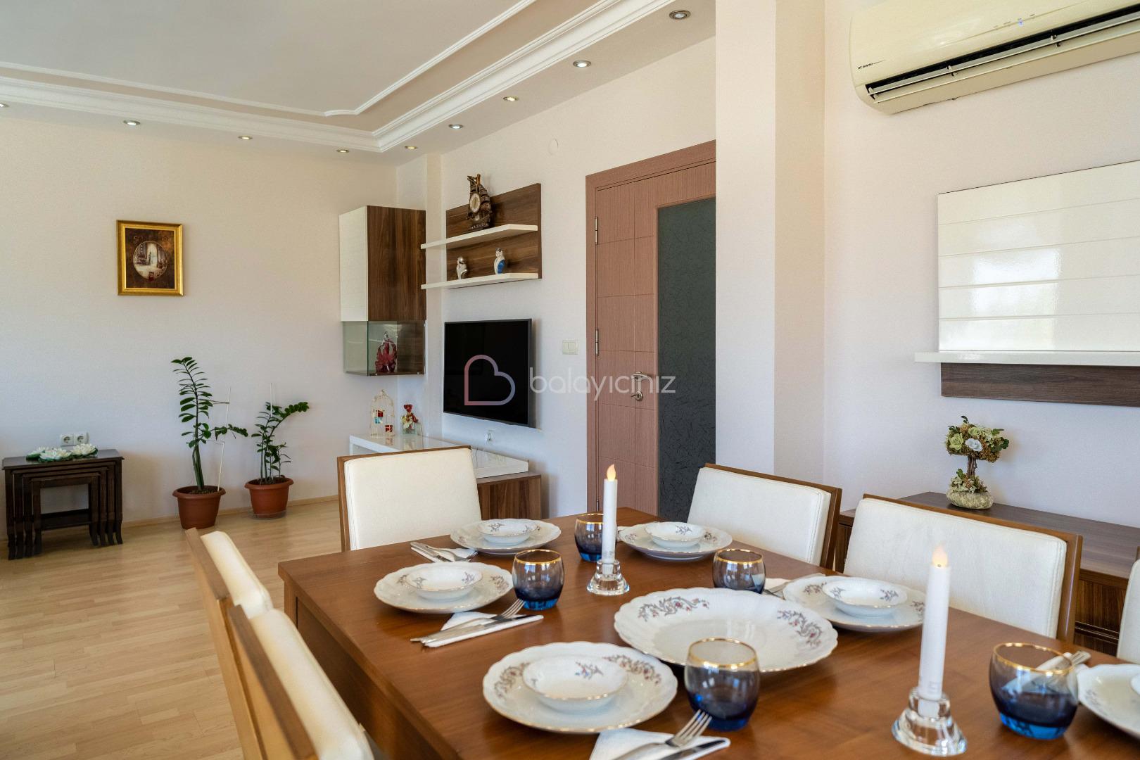 Salon içerisinde konforlu oturma grubu, sehpa, televizyon, uydu alıcı, klima. Salondan havuz terasına çıkış bulunmaktadır.