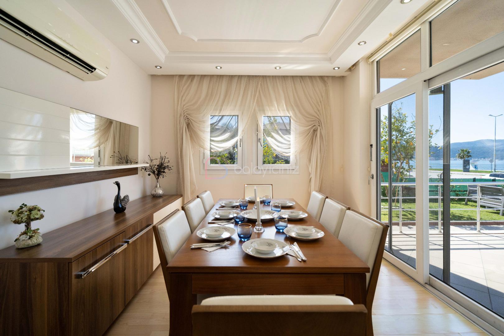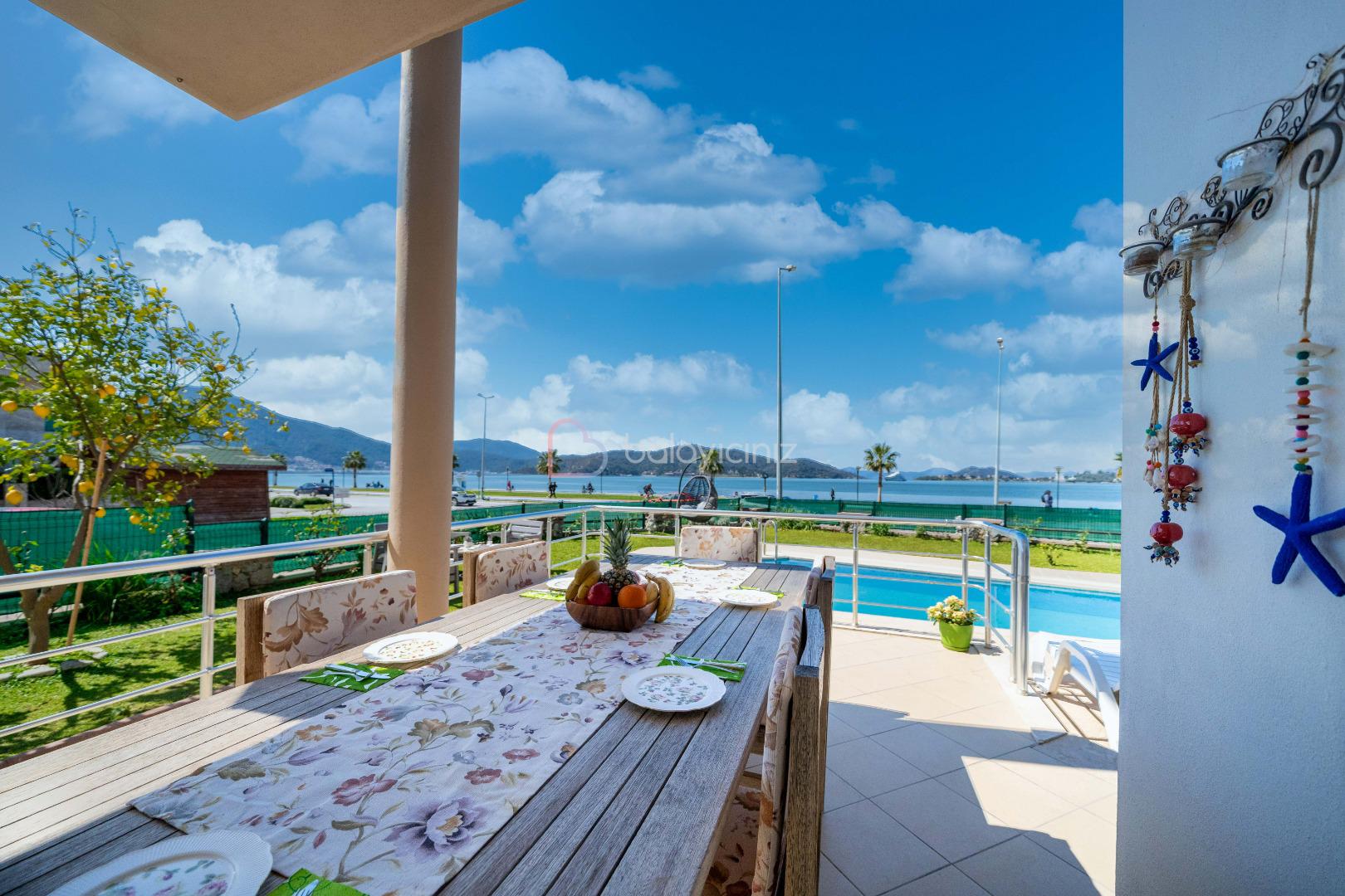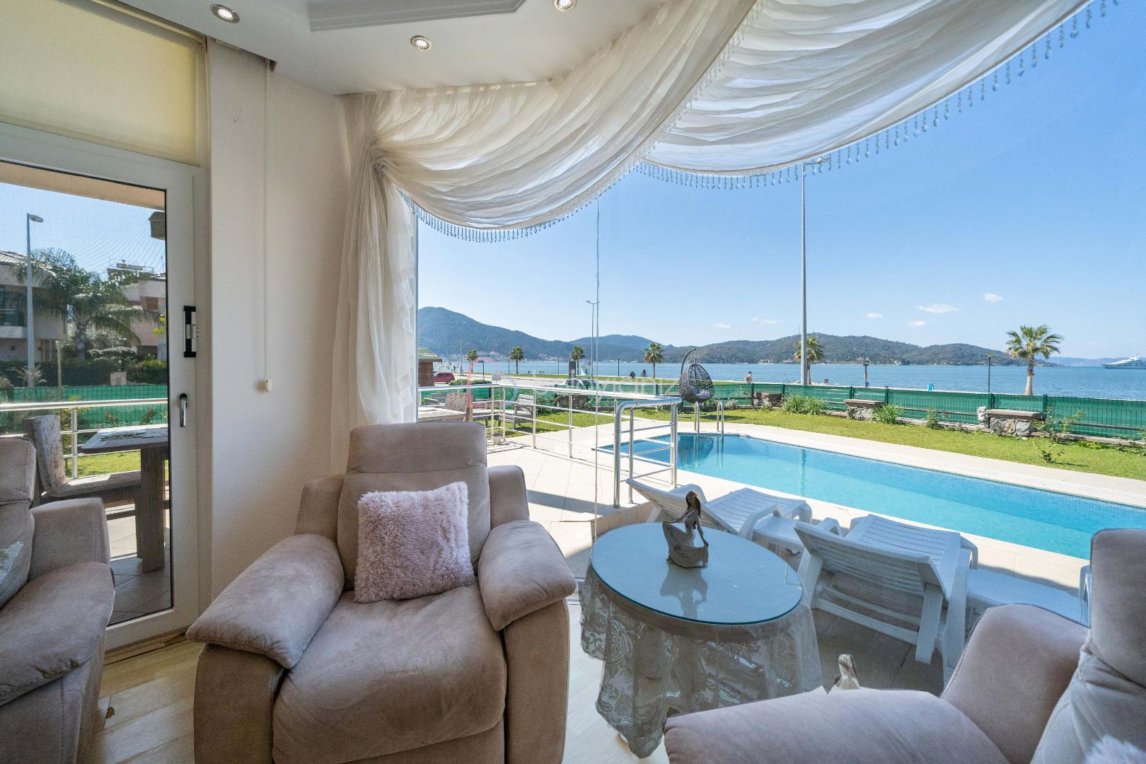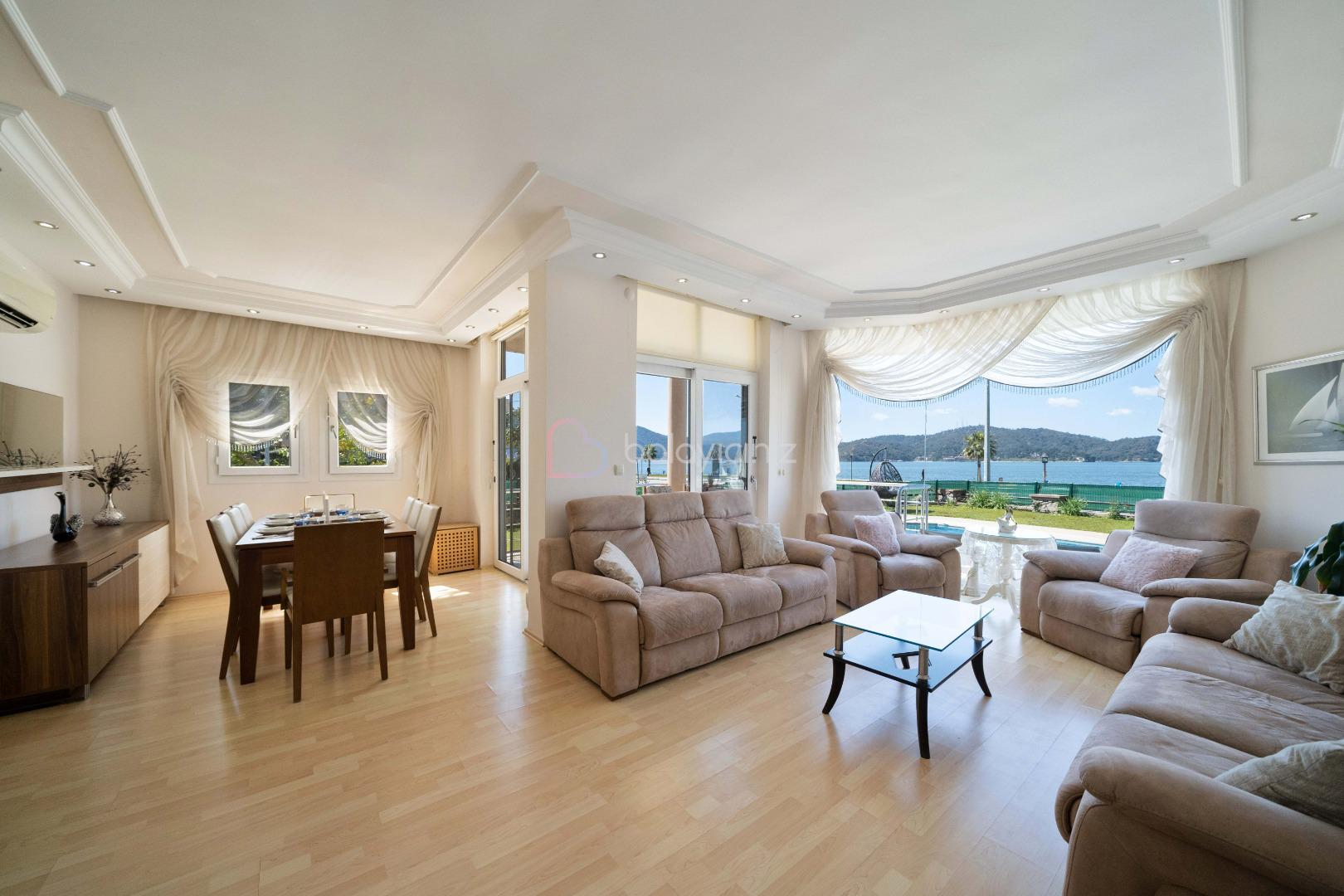 Salon içerisinde konforlu oturma grubu, sehpa, televizyon, uydu alıcı, klima. Salondan havuz terasına çıkış bulunmaktadır.