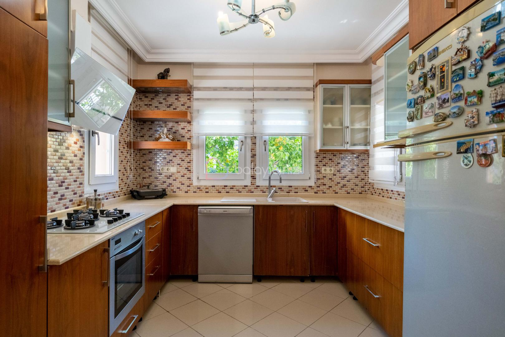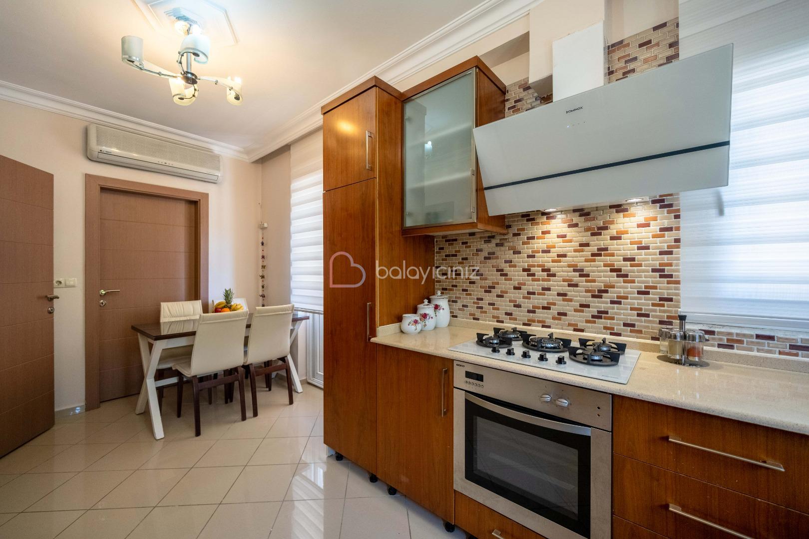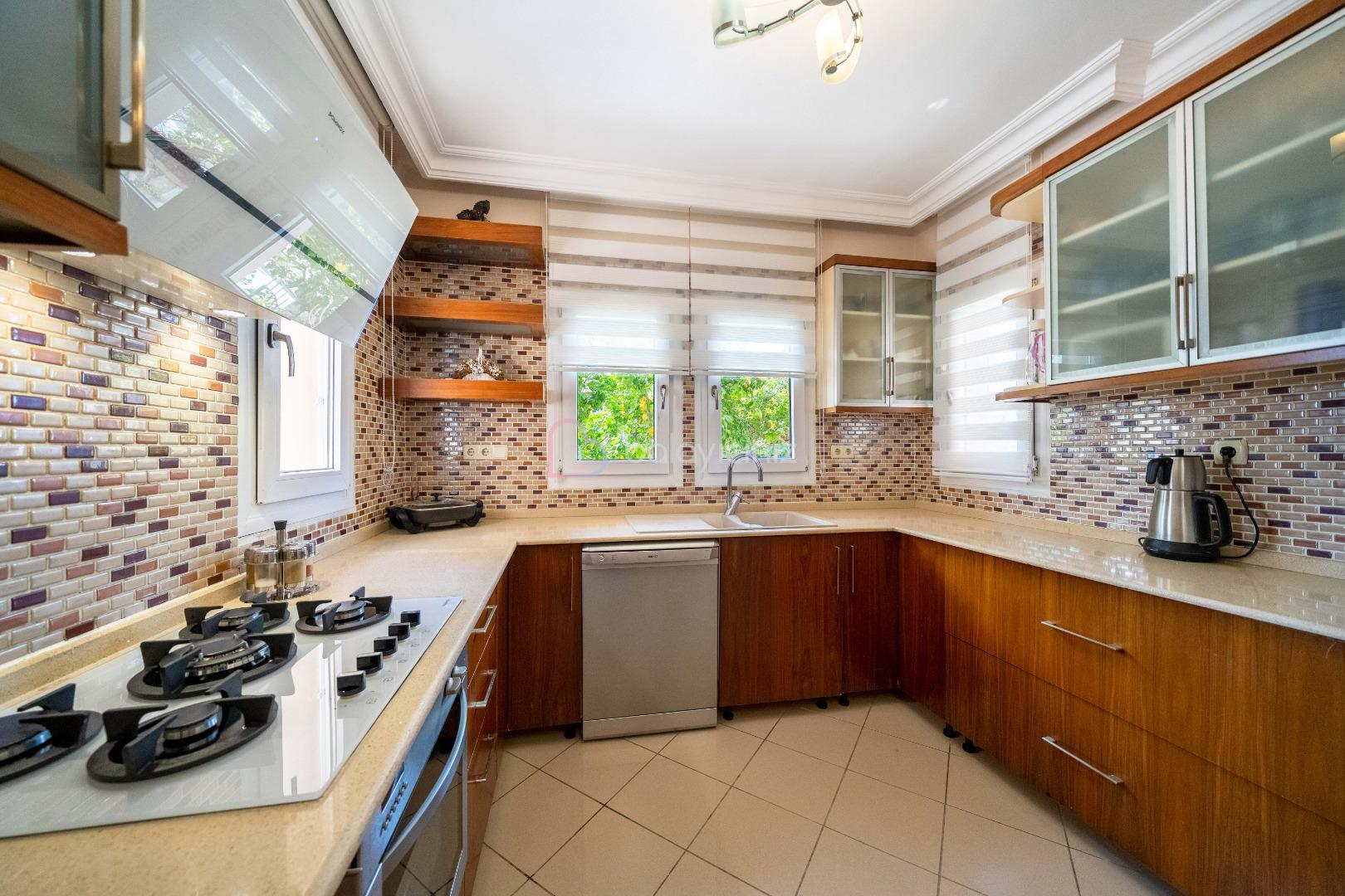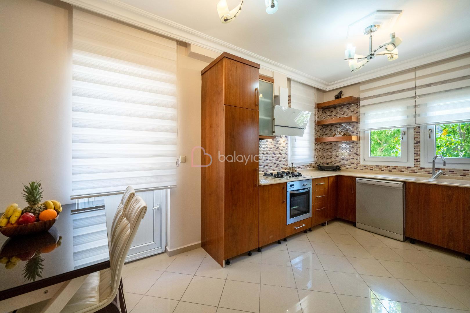 Buzdolabı, fırın, mikrodalga, çamaşır makinesi, bulaşık makinesi, 4’lü ocak, elektrikli su ısıtıcısı (kettle), elektrikli süpürge, ekmek kızartma makinesi, 8 kişilik yemek takımı, tava, tencereler, çatal ve bıçak takımı ve diğer mutfak malzemesi mevcuttur. Havuz terasına çıkış bulunmaktadır.