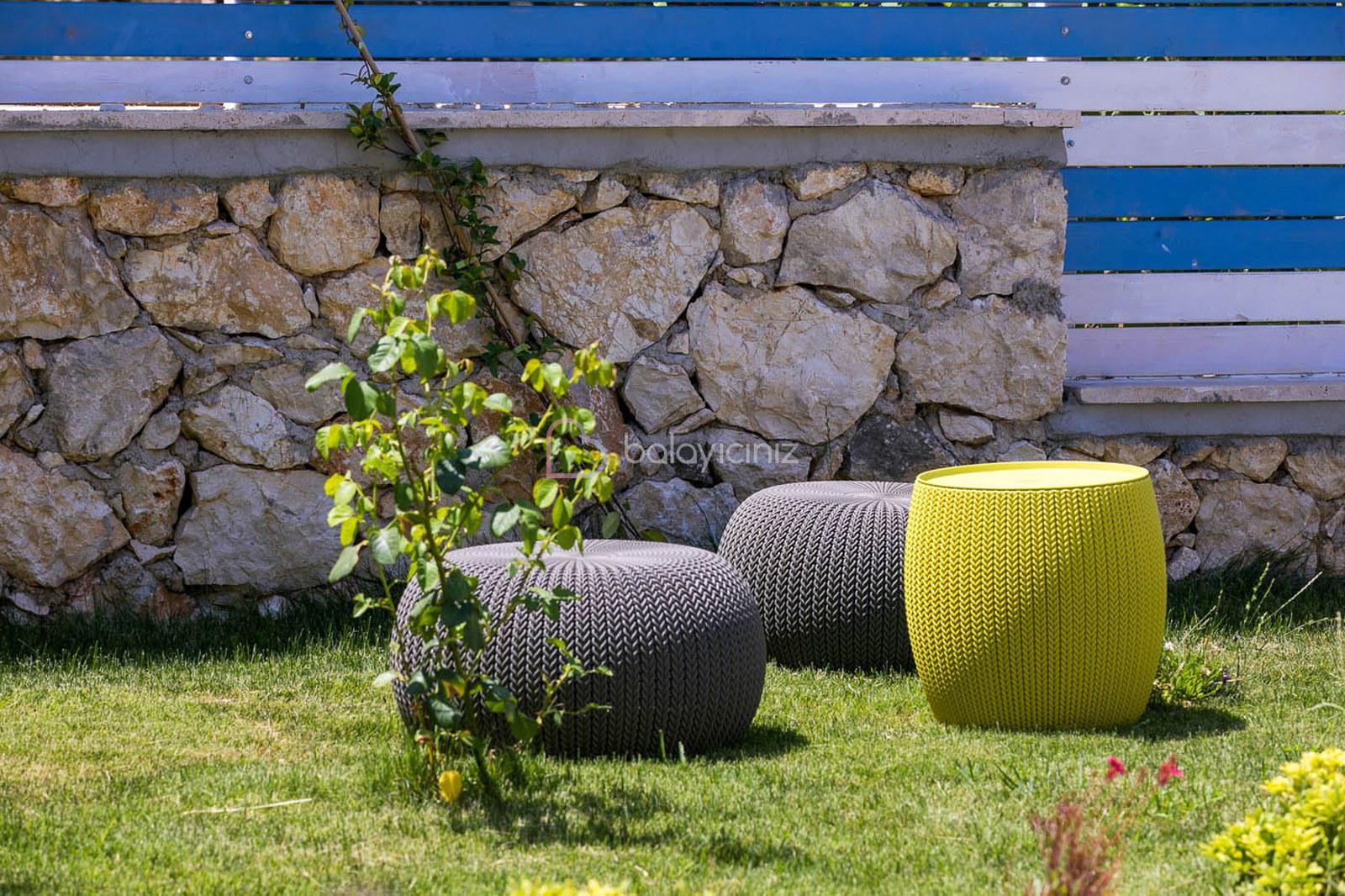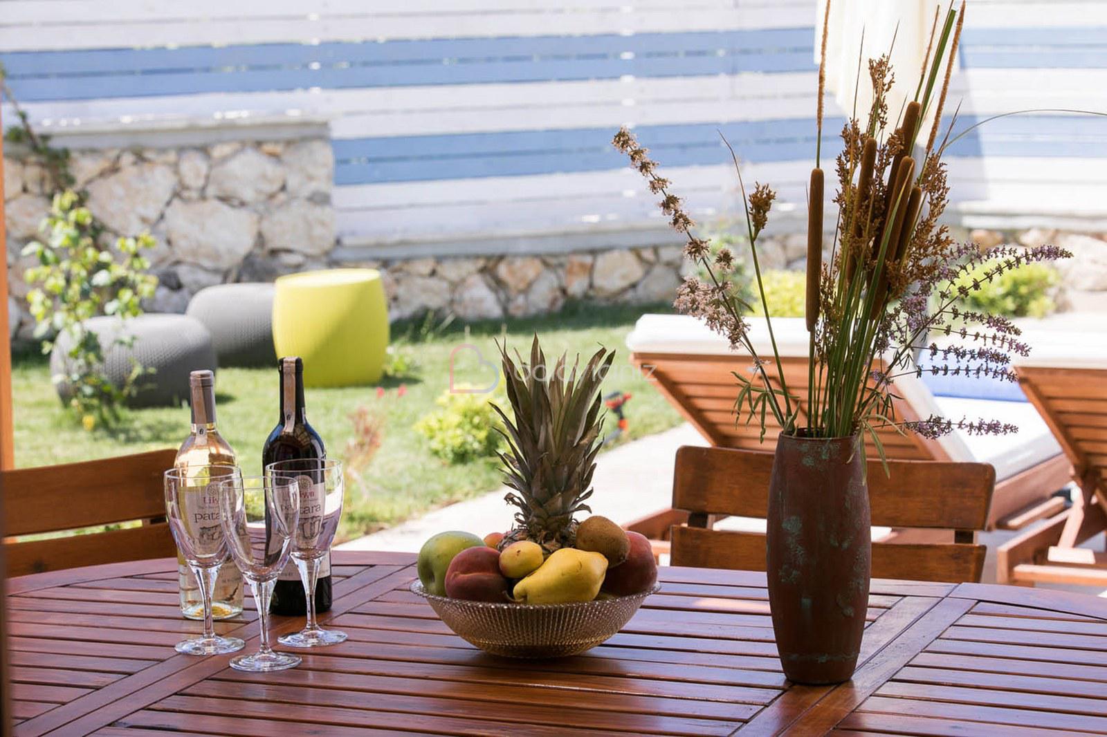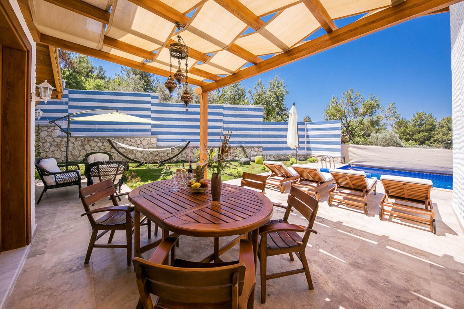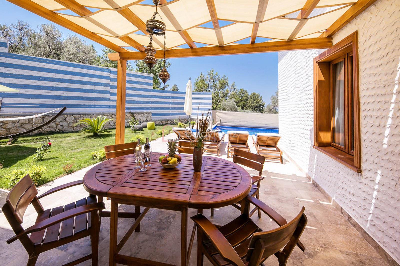 Özel korunakli yüzme havuzu, Güneş şemsiyesi, şezlonglar, mangal, yemek masası ve sandalyeler bahçe oturma grubu