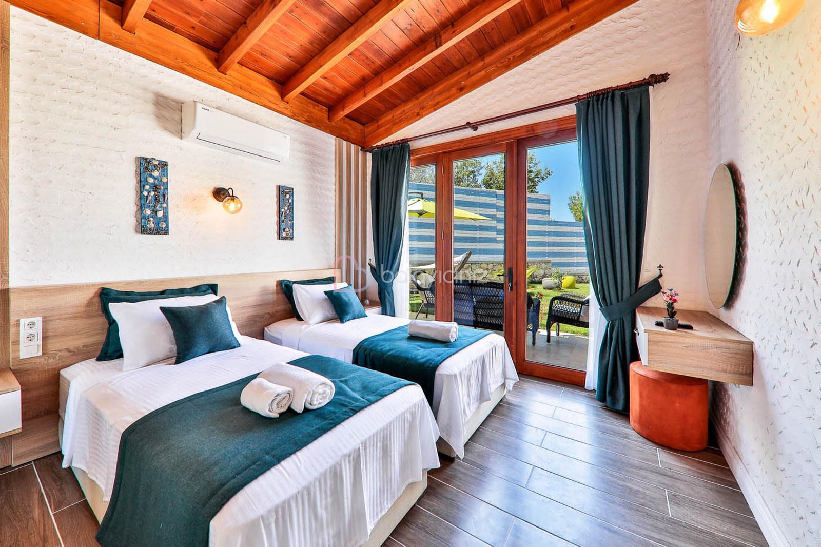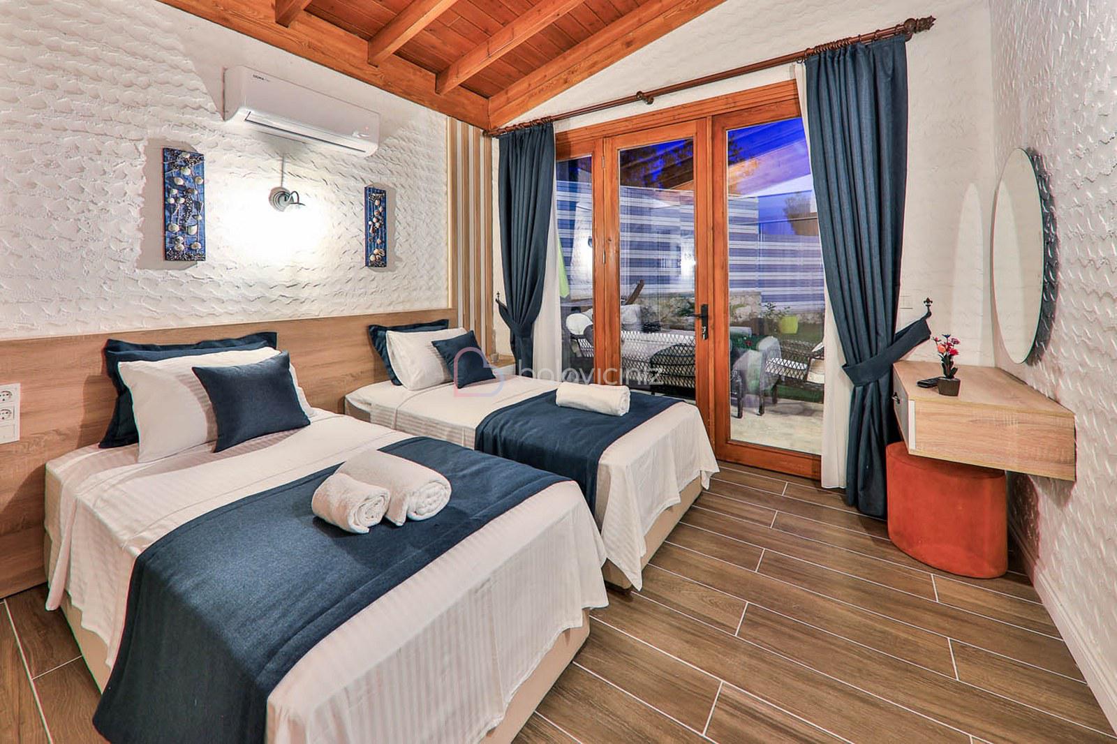 2.Yatak Odası: 2 adet tek kişilik yatak, komodin, elbise dolabı, makyaj masası, klima, banyo ve havuz terasına çıkış bulunmaktadır.