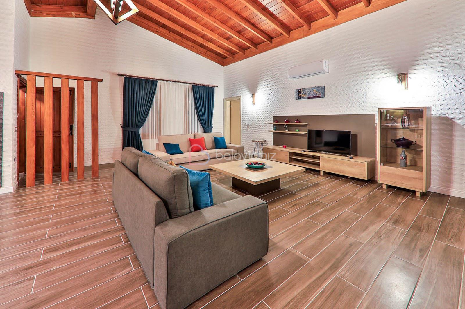 Oturma grubu, televizyon, uydu alıcı, klima, internet için modem ve havuz terasına çıkış bulunmaktadır.