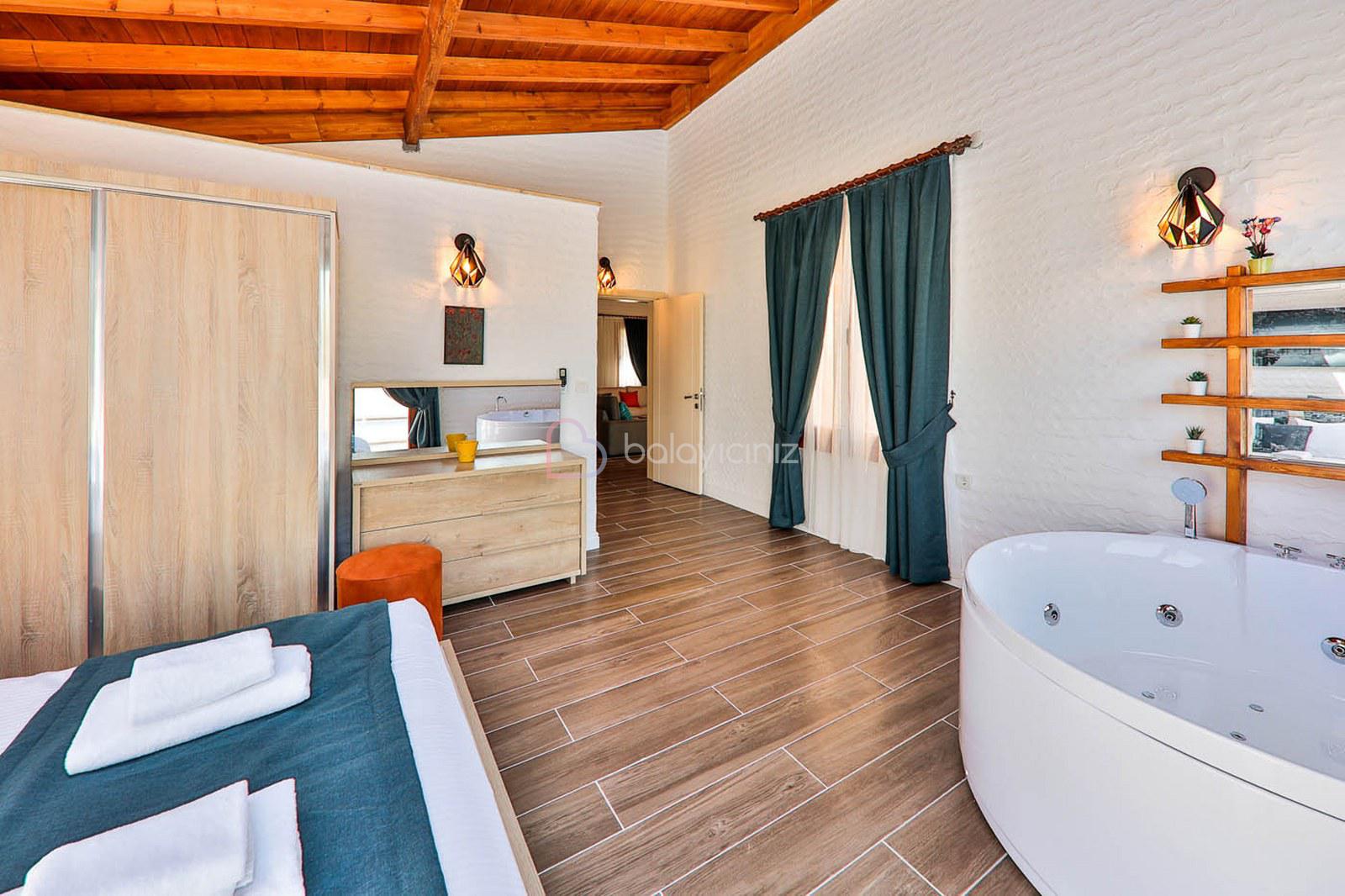 1.Yatak Odası: 1 adet çift kişilik yatak, komodin, elbise dolabı, makyaj masası, klima, banyo, jakuzi, tuvalet ve havuz terasına çıkış bulunmaktadır.