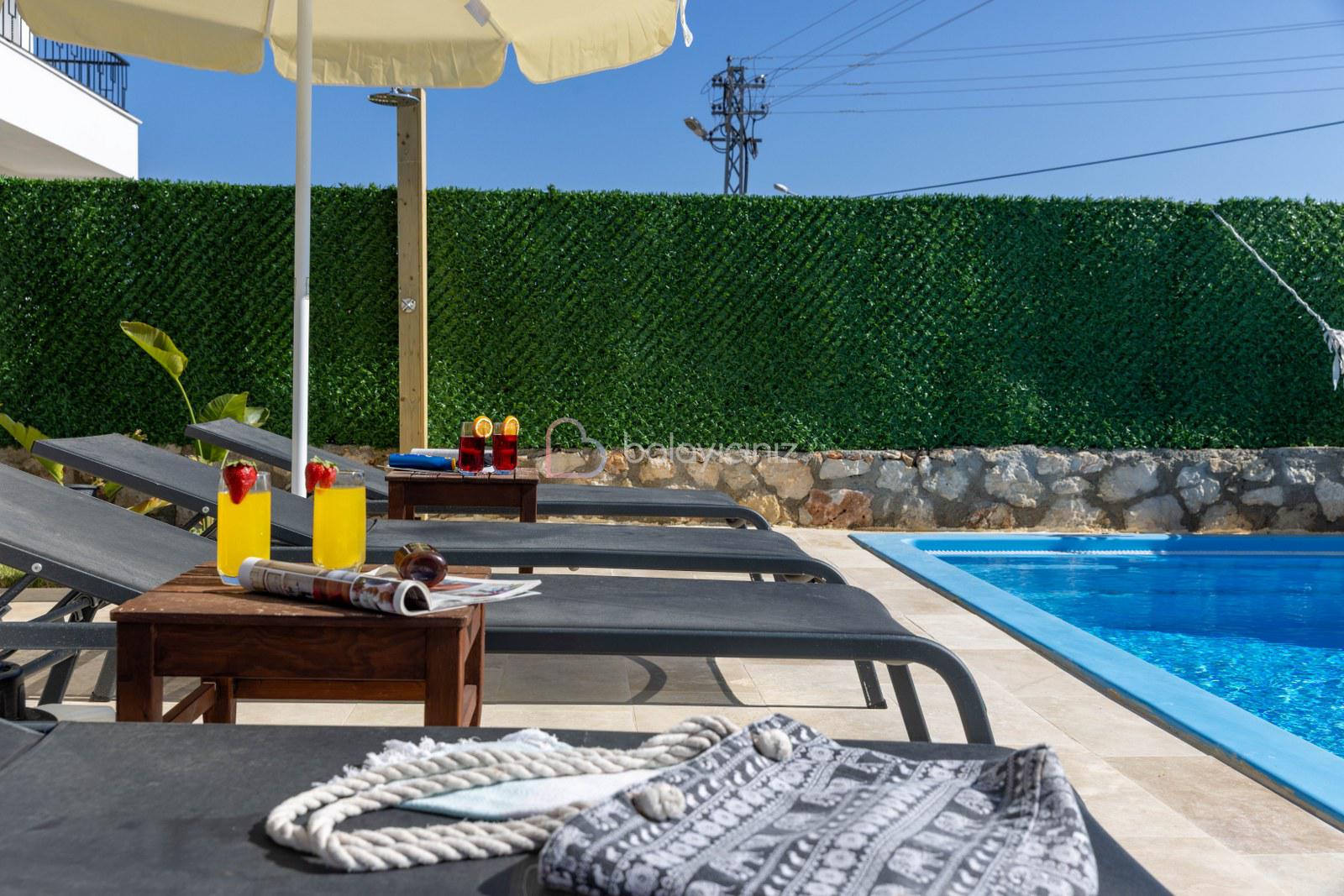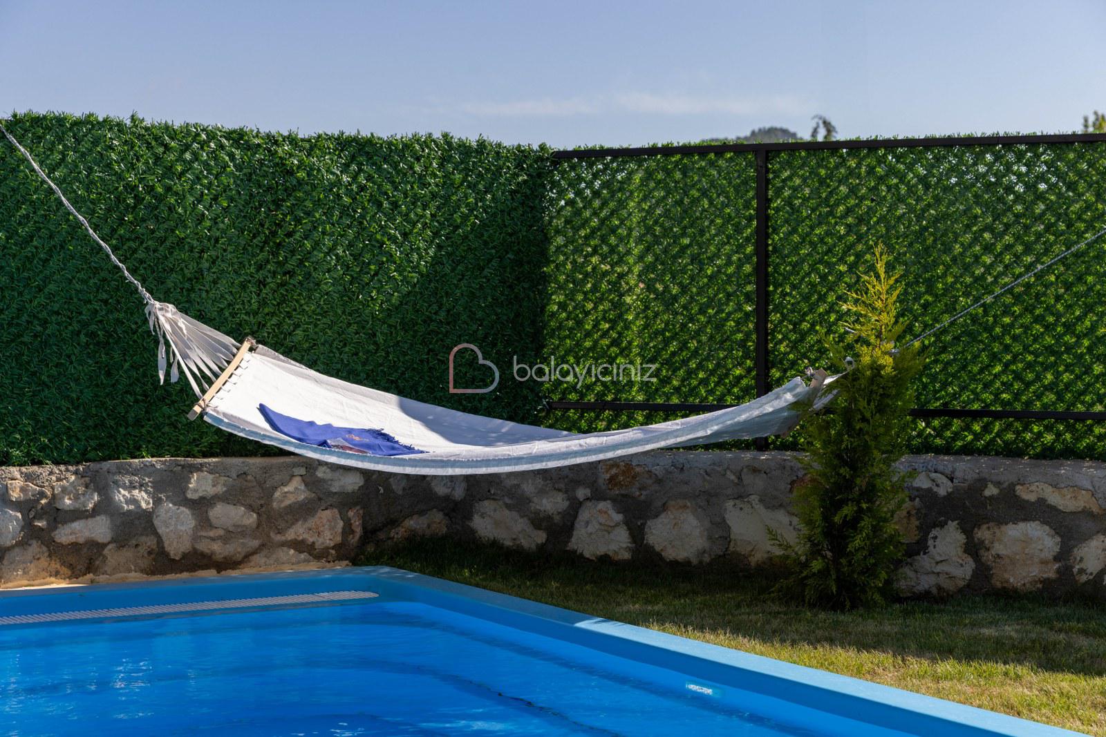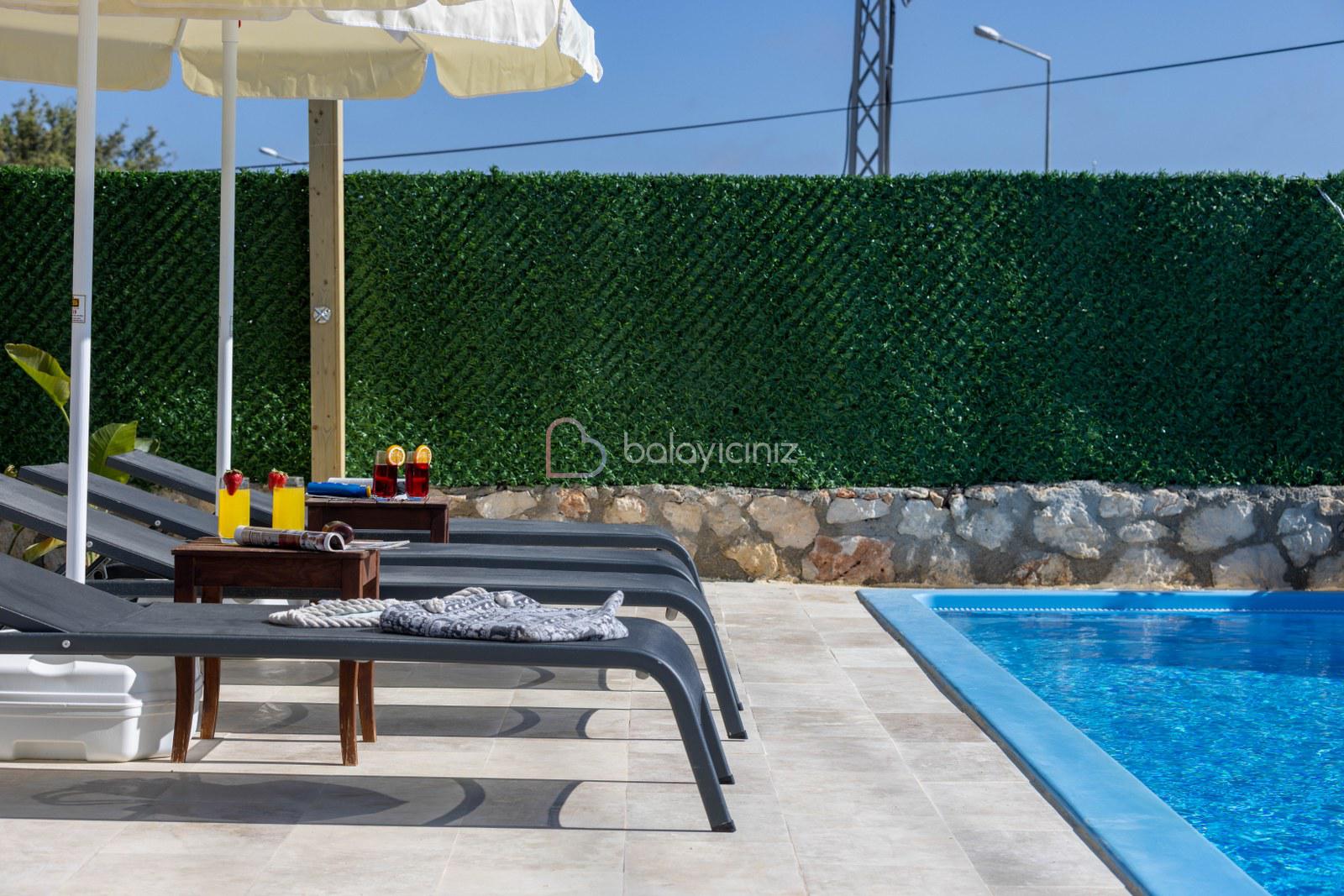 Özel yüzme havuzu, havuz başında şezlong, güneşlenme şemsiyesi, barbekü, yemek masası ve sandalyeleri bulunmaktadır. Havuz ve bahçe bakimi görevli tarafından günlük olarak yapılmaktadır.