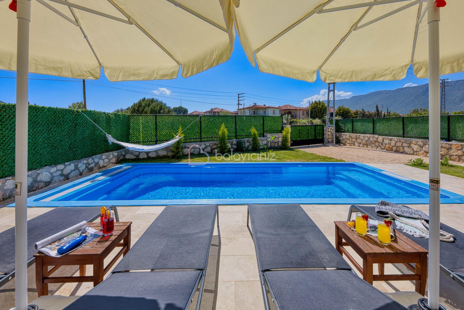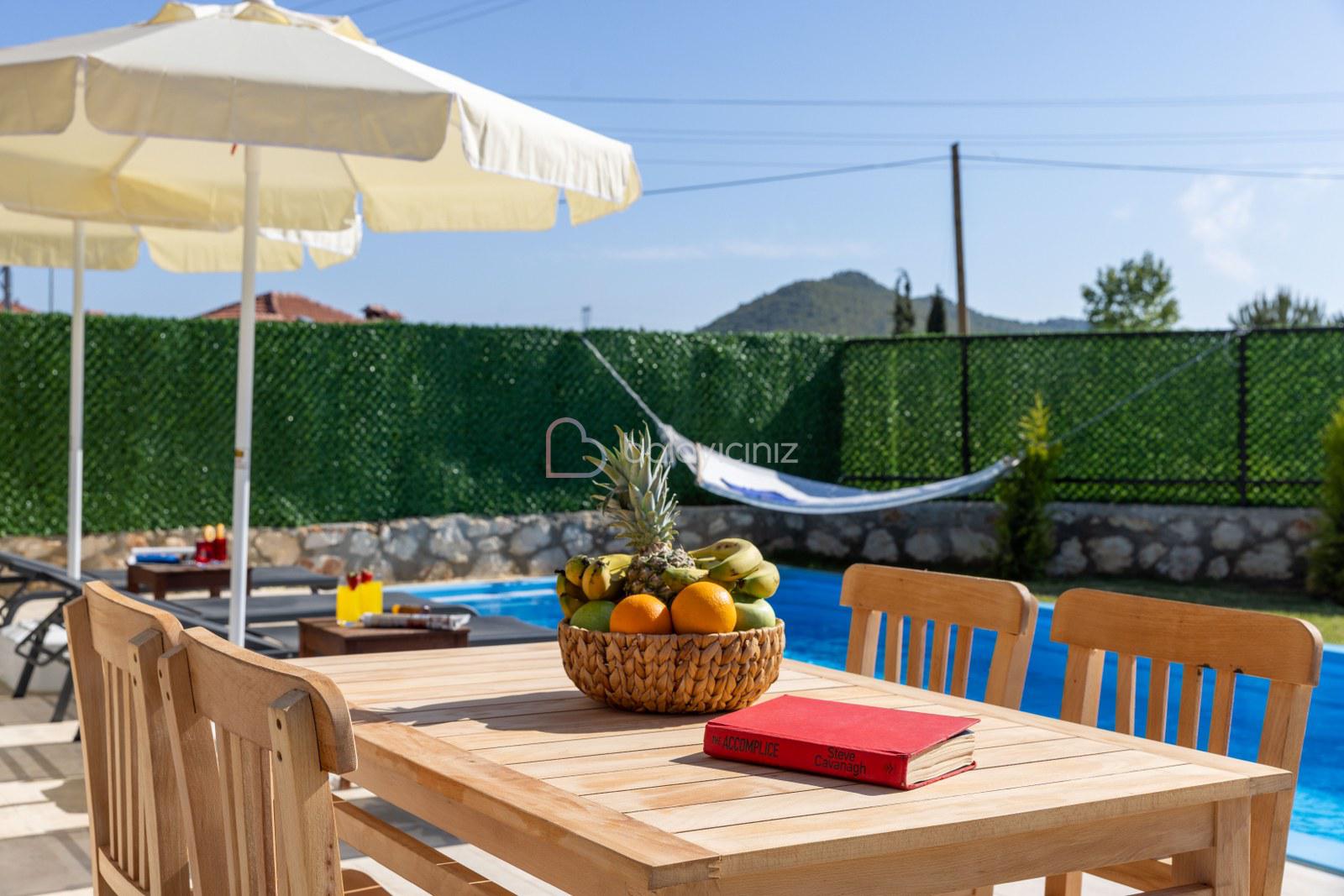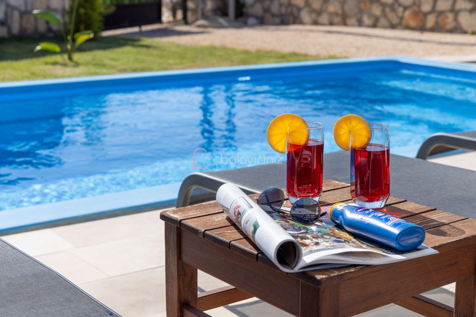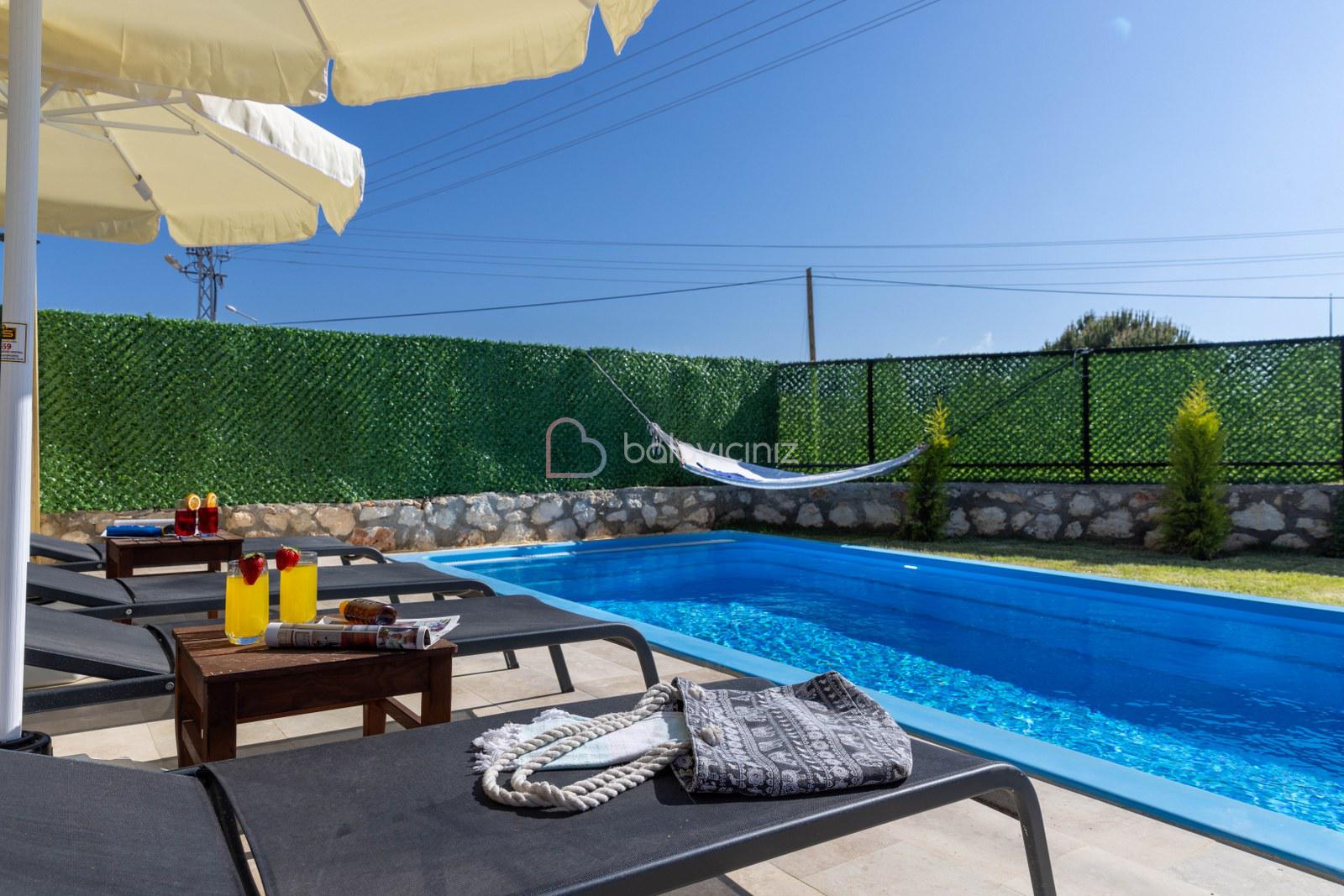 Özel yüzme havuzu, havuz başında şezlong, güneşlenme şemsiyesi, barbekü, yemek masası ve sandalyeleri bulunmaktadır. Havuz ve bahçe bakimi görevli tarafından günlük olarak yapılmaktadır.