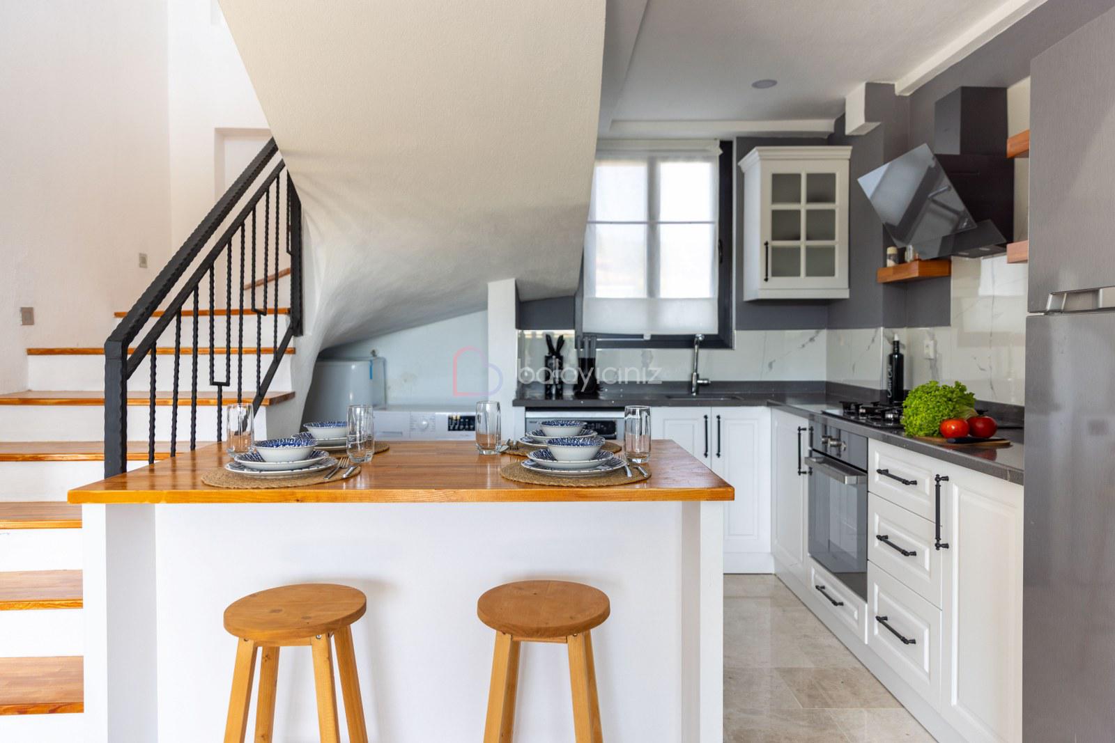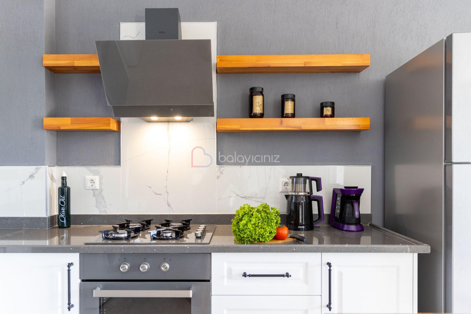 Modern Amerikan mutfak, buzdolabı, bulaşık makinesi, çamaşır makinesi, ankastre fırın, mikrodalga fırın, ankastre 4’lü ocak, elektrikli su ısıtıcısı (kettle), 4 kişilik yemek takımı, çeşitli mutfak araç gereçleri bulunmaktadır.