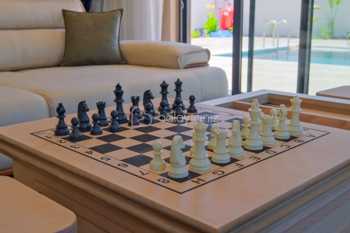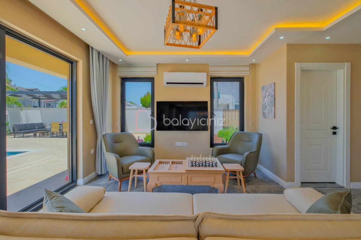 Modern ve konforlu oturma grubu, sehpa, televizyon, uydu alıcı, klima. Salondan havuz terasına çıkış bulunmaktadir.