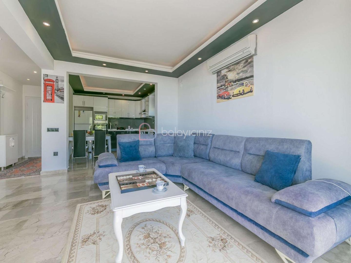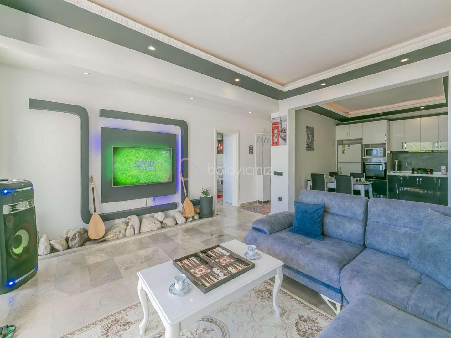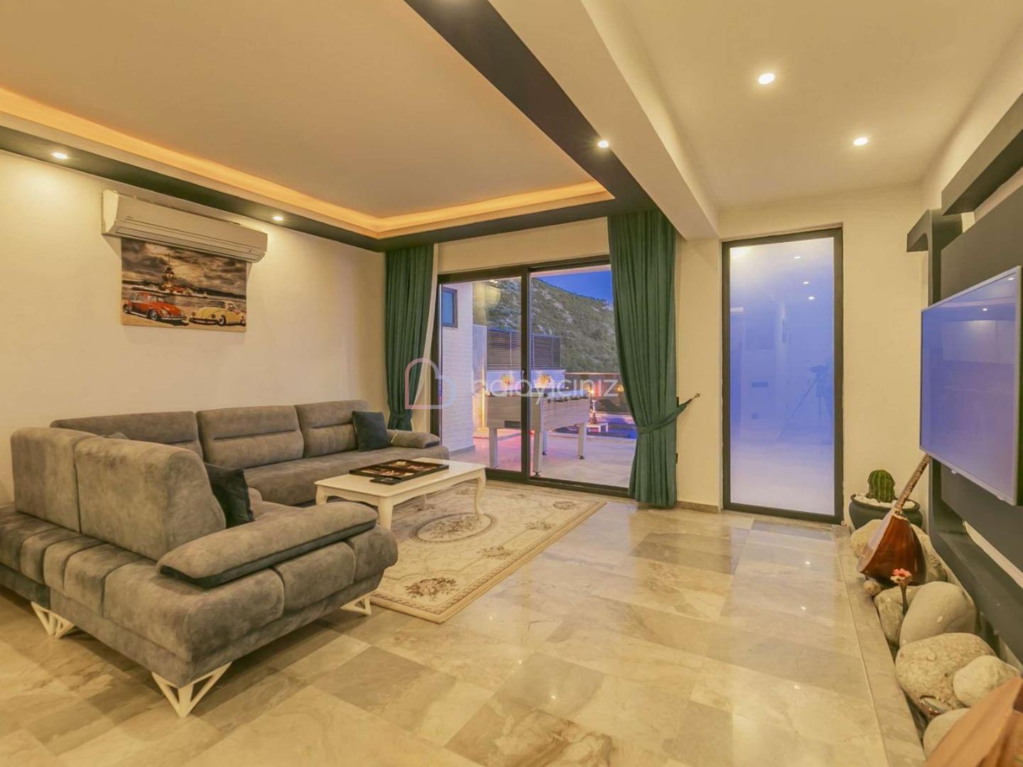 Büyük bir salon içerisinde modern oturma grubu, uydu alıcı, LCD TV, internet için modem, klima, ütü, ütü masası ve havuz terasına çıkış bulunmaktadır.