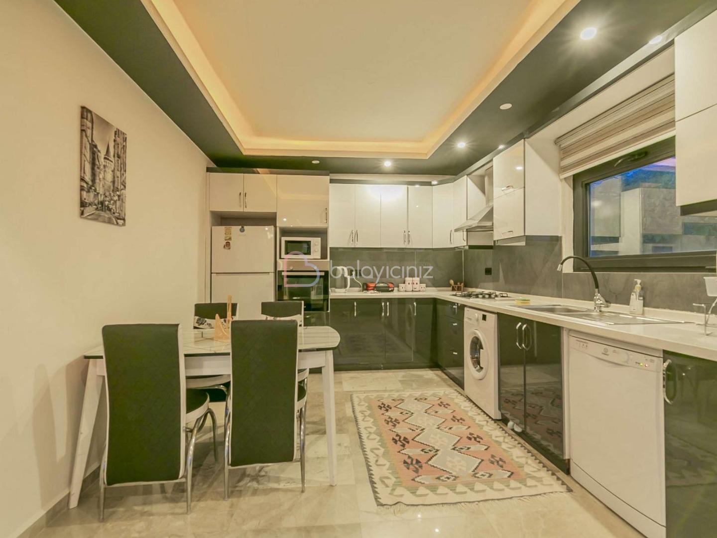 Amerikan mutfak içerisinde buzdolabı, bulaşık makinesi, çamaşır makinesi, yemek masası, mikrodalga fırın, 4’lü ocak, davlumbaz, fırın, elektrikli su ısıtıcısı, yemek takımı, tava ve tencereler, çatal, bıçak takımı bulunmaktadır.