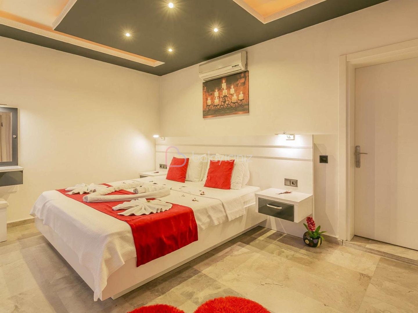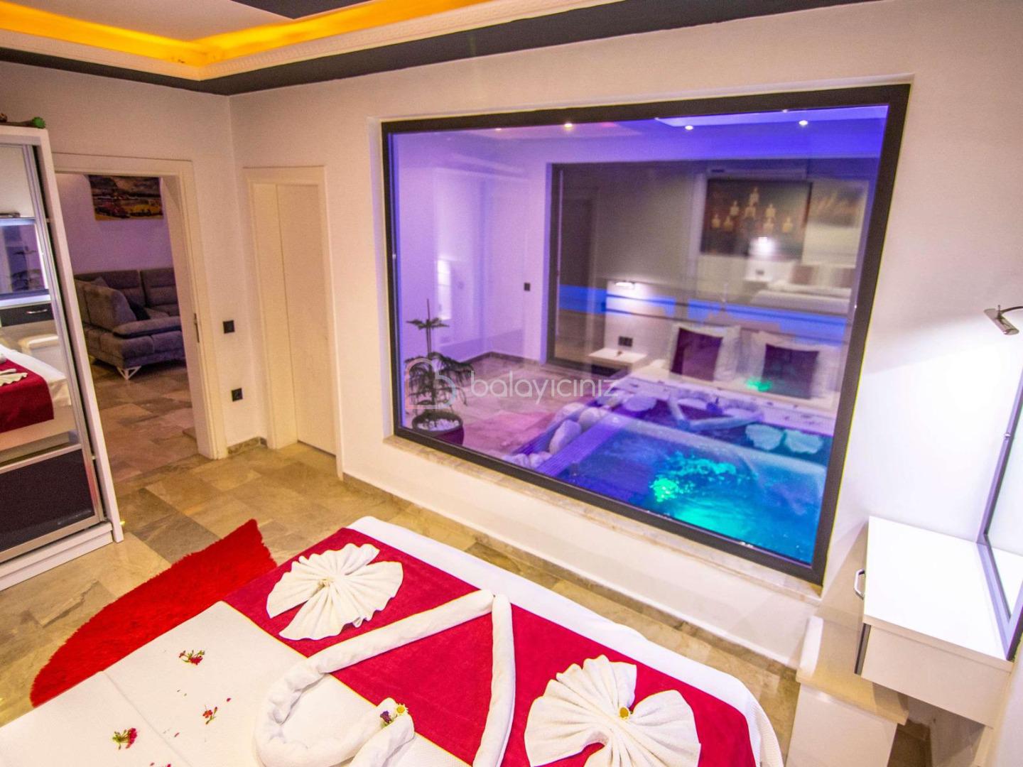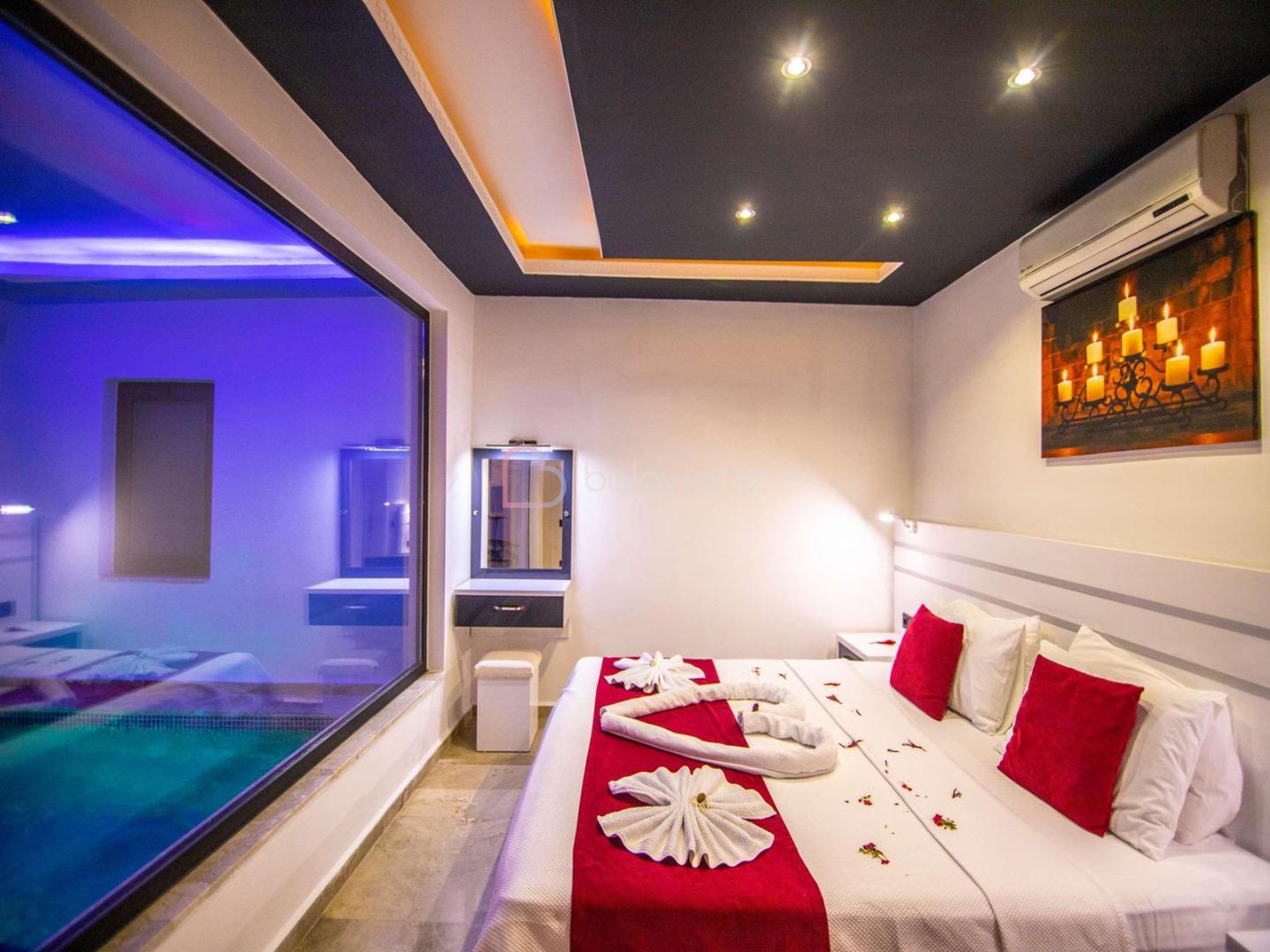 1. Yatak Odası: 1 adet çift kişilik yatak, komodin, makyaj masası, klima, elbise dolabı, klima, ısıtma özelliği olan kapalı havuz, banyo/tuvalet bulunmaktadır.