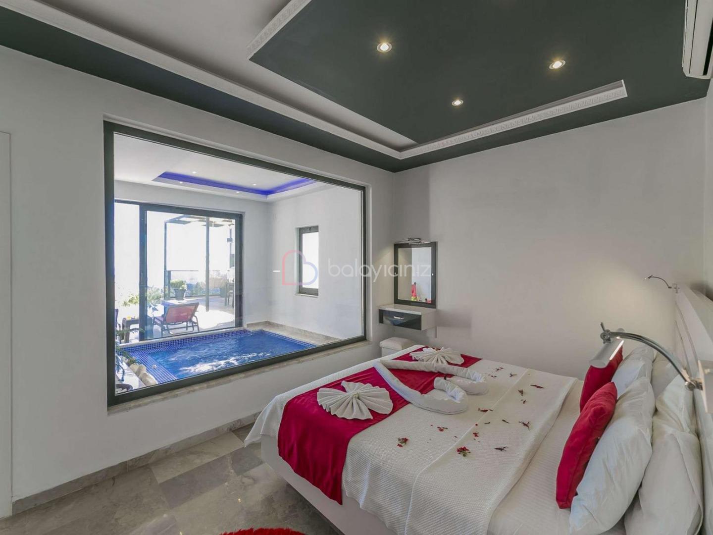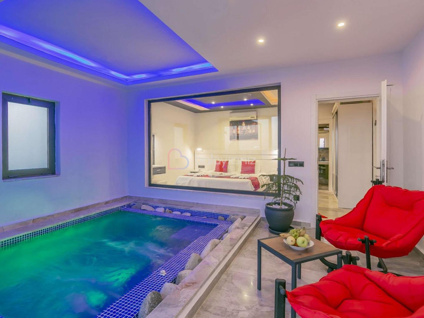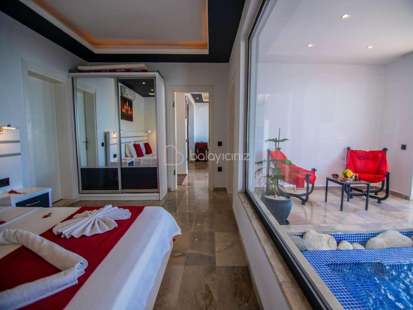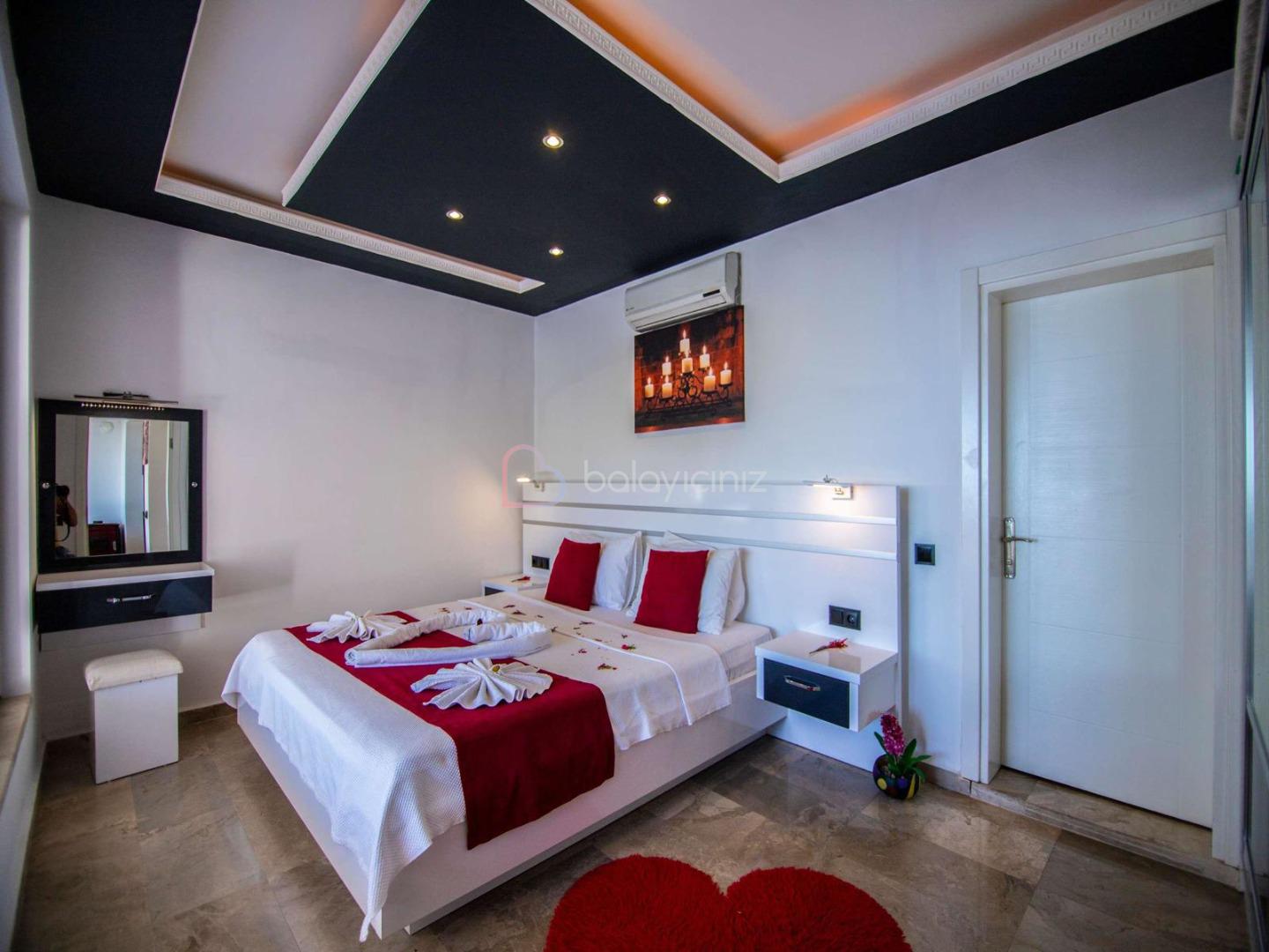 1. Yatak Odası: 1 adet çift kişilik yatak, komodin, makyaj masası, klima, elbise dolabı, klima, ısıtma özelliği olan kapalı havuz, banyo/tuvalet bulunmaktadır.