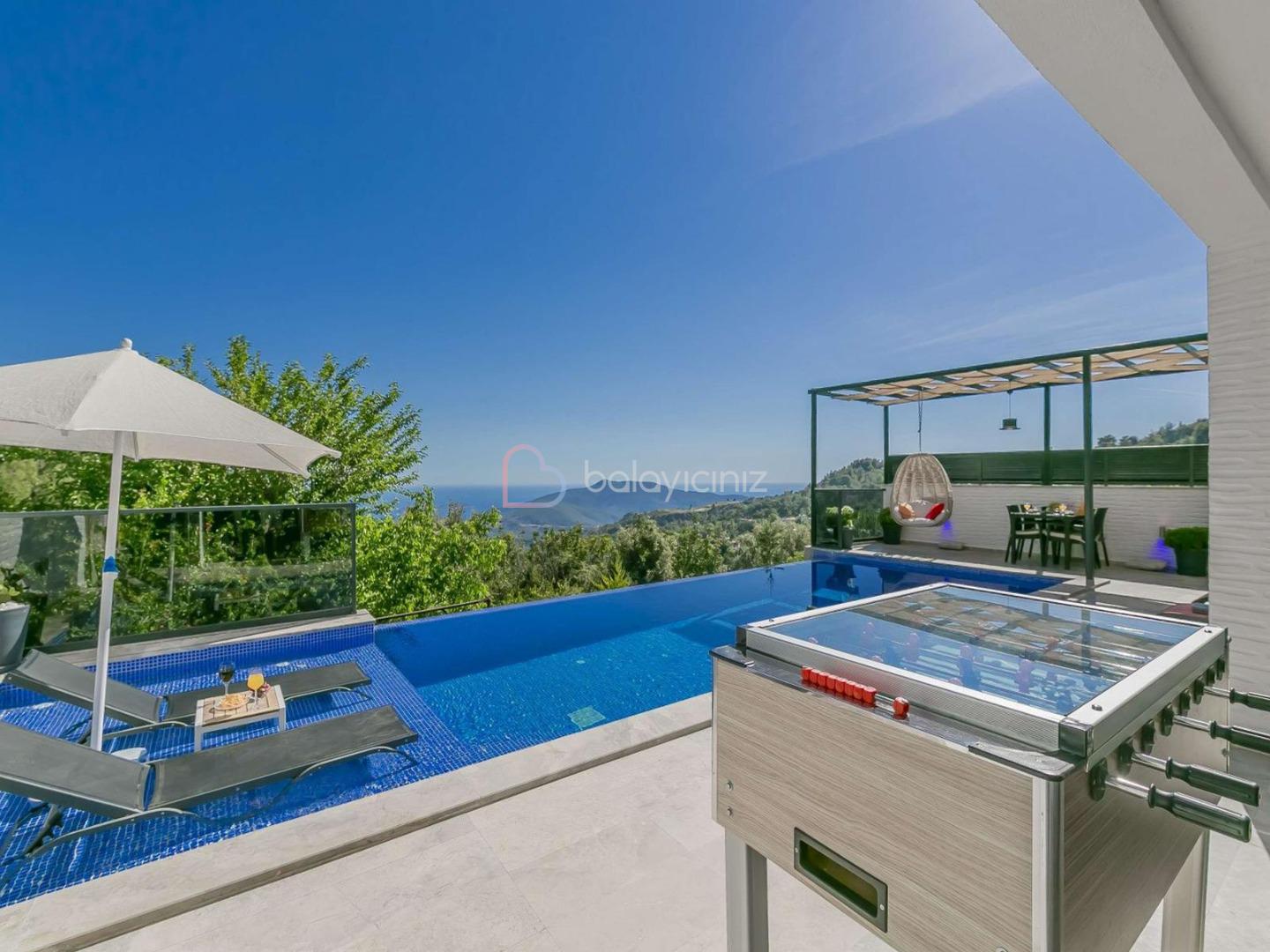 Bahçe içerisinde korunakli özel yüzme havuzu, 2 adet şezlong ve şemsiye, çardak, langırt, yemek masası ve sandalyeler, bahçe oturma grubu, salıncak ve barbekü yer almaktadır.