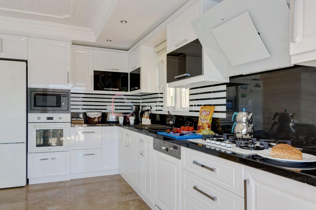 Amerikan mutfak bulunmaktadır. Mutfakta mikrodalga fırın, bulaşık makinesi, ankastre fırın, buzdolabı, çamaşır makinesi, ankastre 4’lü ocak, ketle, ekmek kızartma makinesi, tencere ve tava takımı, 8 kişilik yemek takımı, kaşık ve çatal seti ve bardaklar bulunmaktadır.