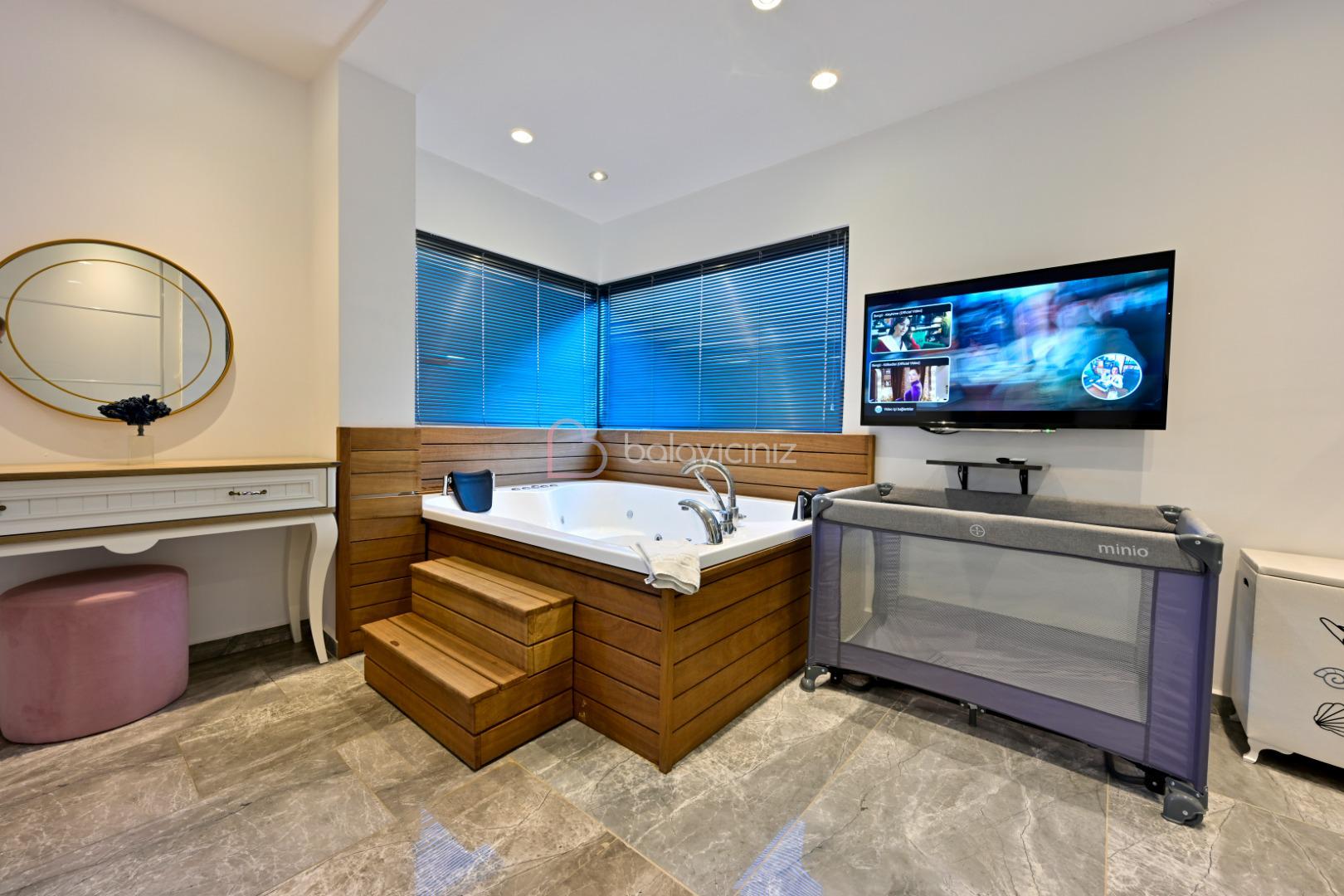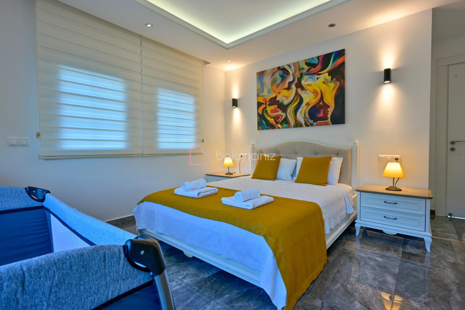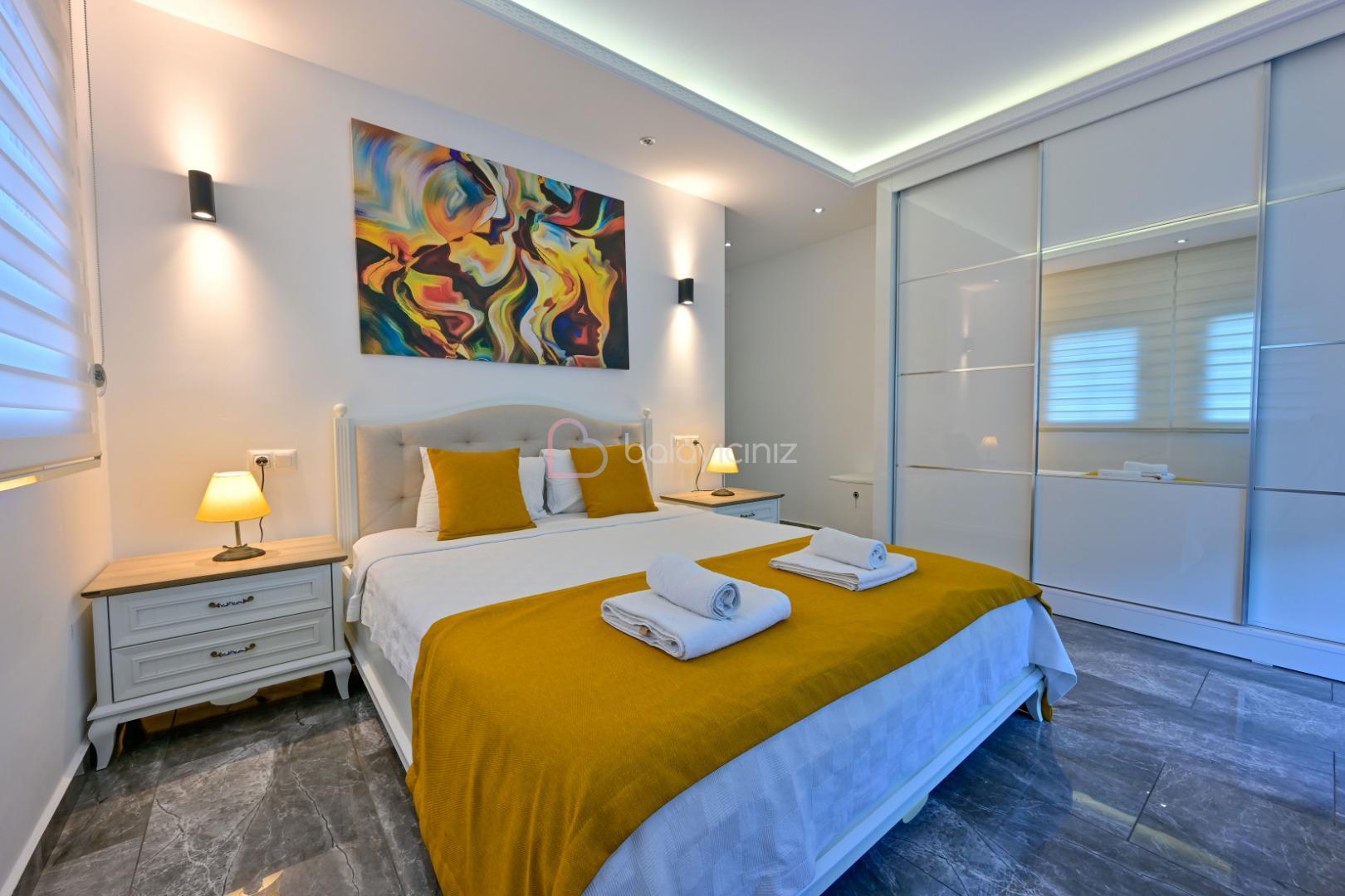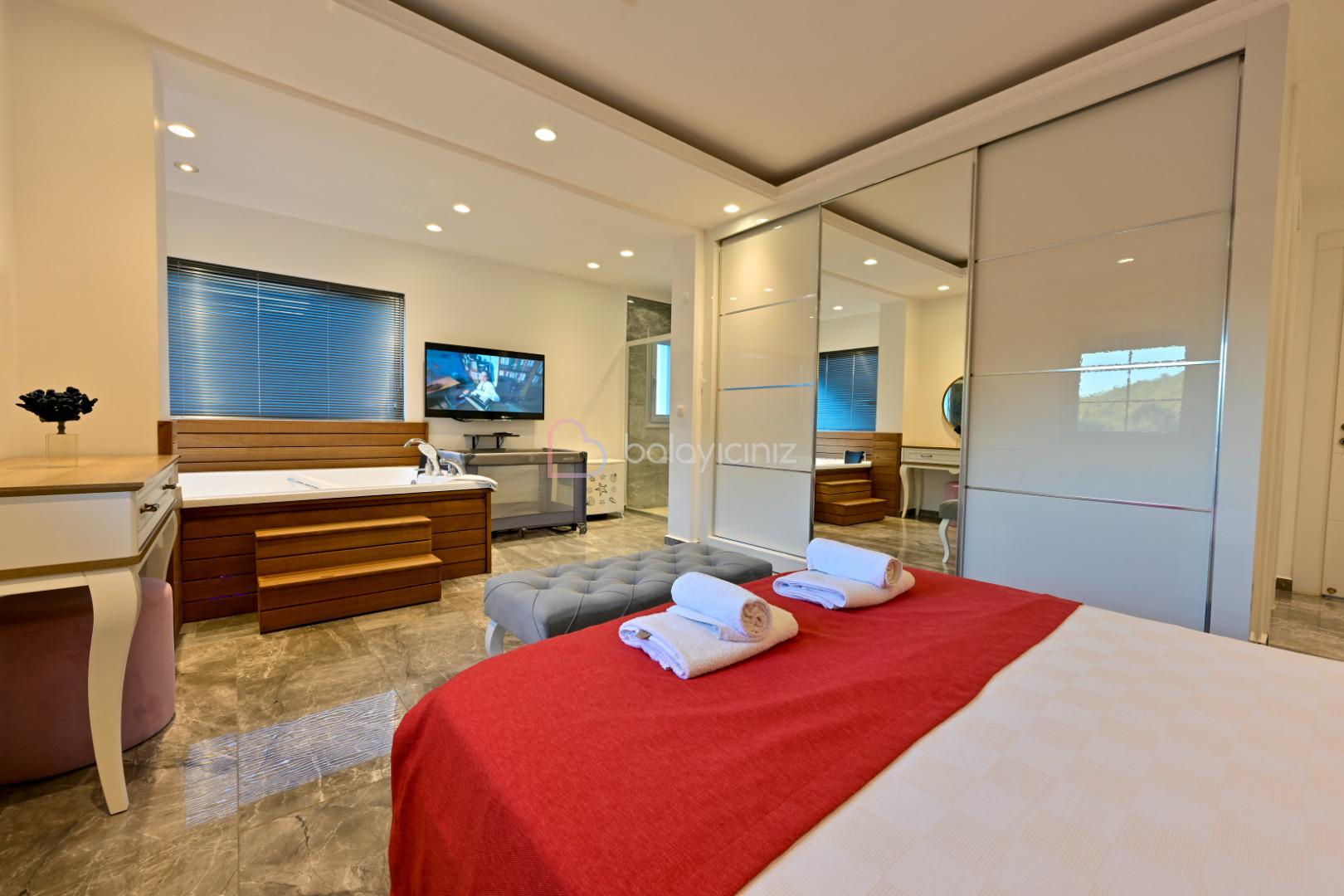 1.Yatak Odası: 1 adet çift kişilik yatak, makyaj masası, elbise dolabı, klima, jakuzi, banyo, tuvalet, havuz terasına çıkış bulunmaktadır.
