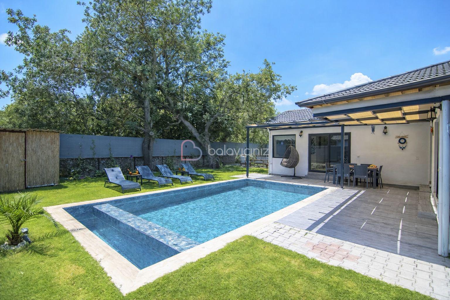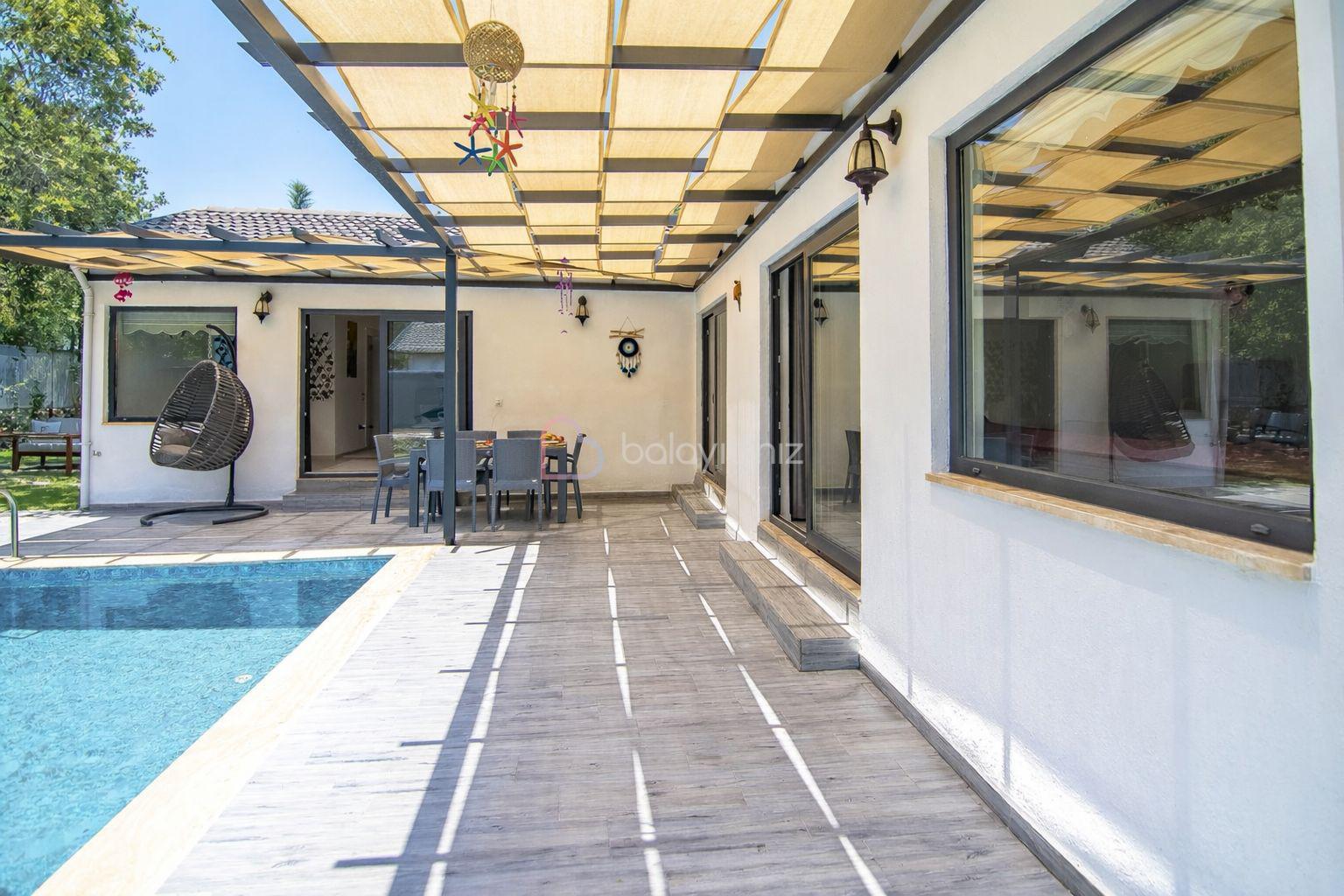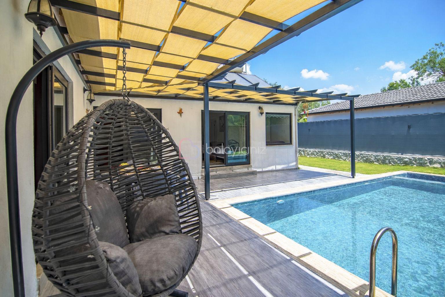 Özel yüzme havuzu, şezlong, barbekü alanı, yemek masası, oturma alanı, salıncak, bulunmaktadır.
