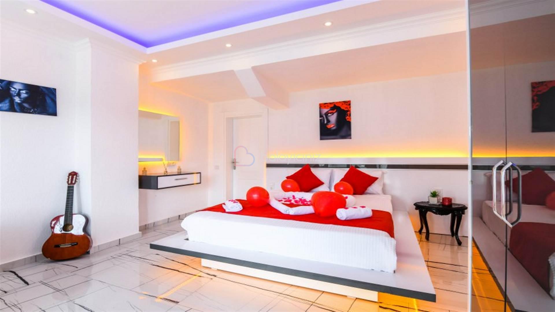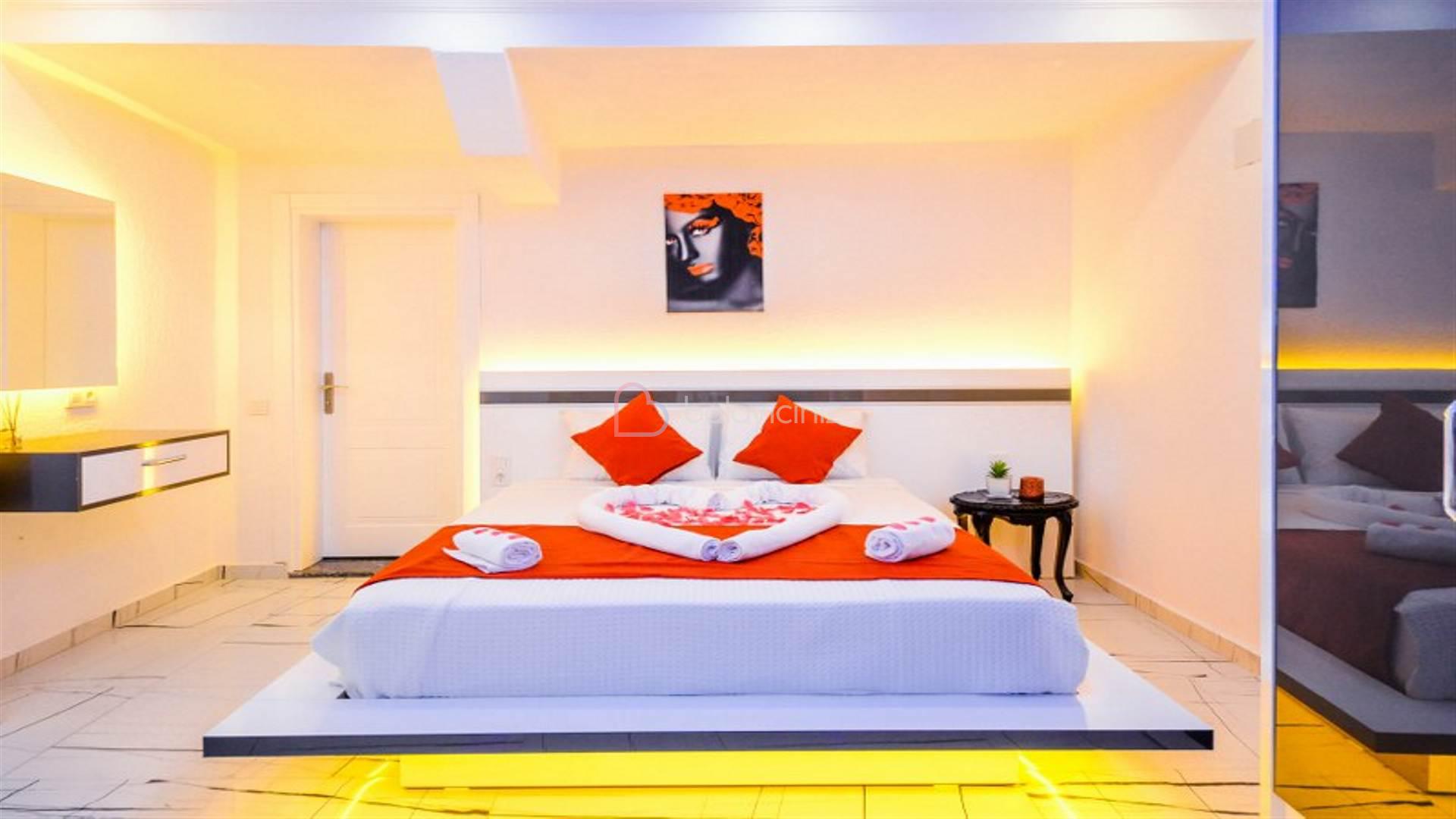 1.Yatak Odası(Aile): 1 adet çift kişilik yatak, klima, komodin, makyaj masası, elbise dolabı, jakuzi, banyo ve tuvalet bulunmaktadır.