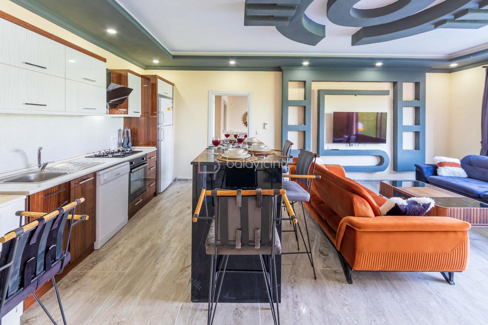 Modern Amerikan mutfakta buz dolabı, bulaşık makinesi, 4'lü ocak, fırın, mikrodalga fırın, ekmek kızartma makinesi, kettle, 4 kişilik yemek masası, yemek takımları, çatal ve bıçak takımları, tencere ve tava takımları, bardaklar bulunmaktadır.