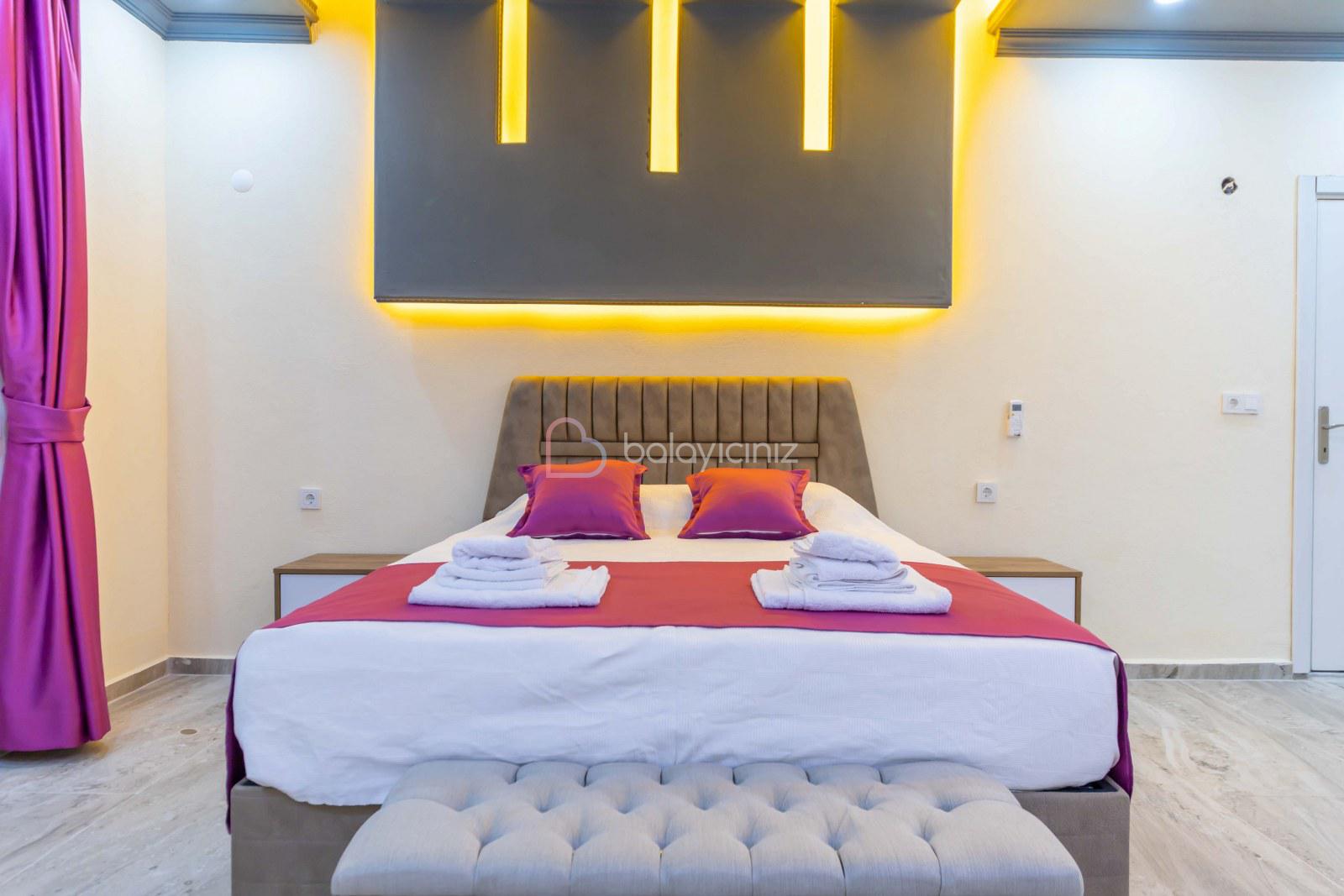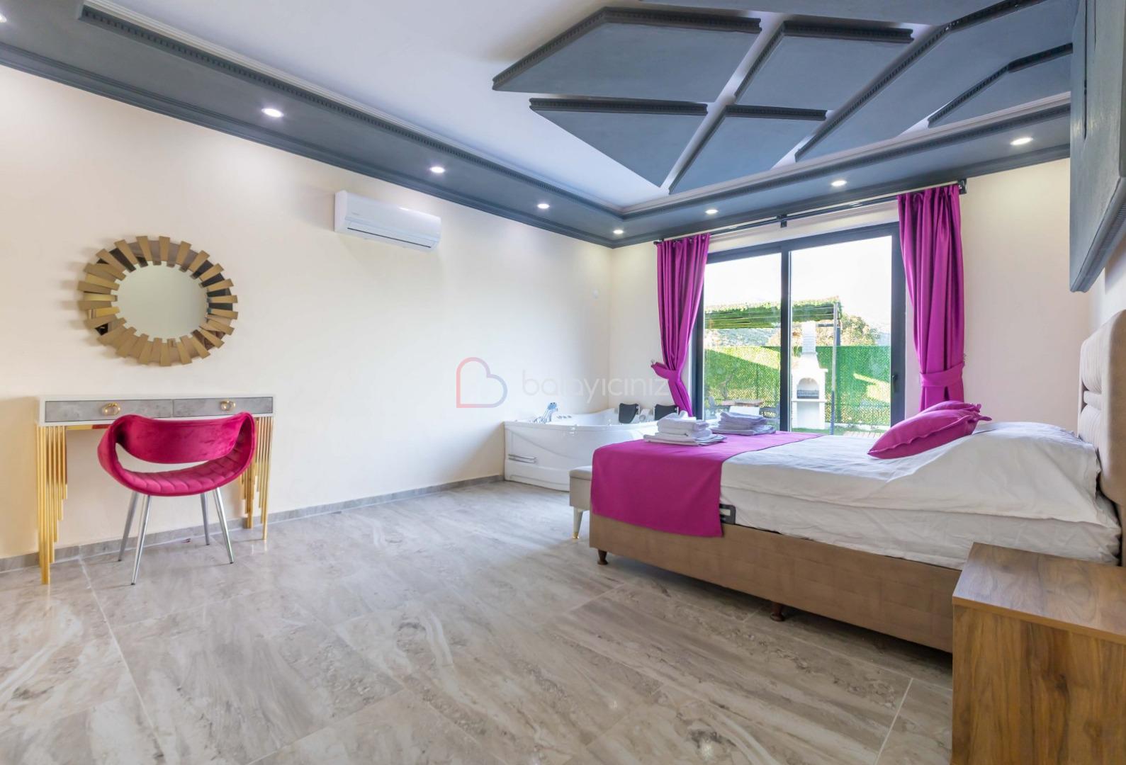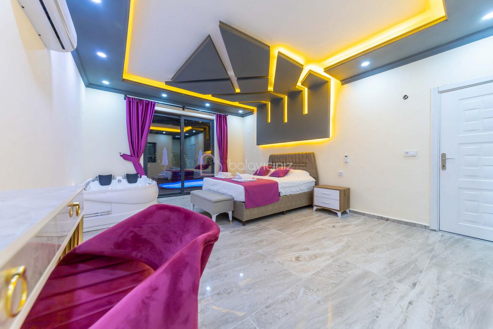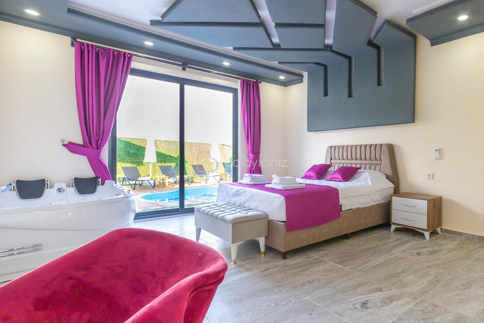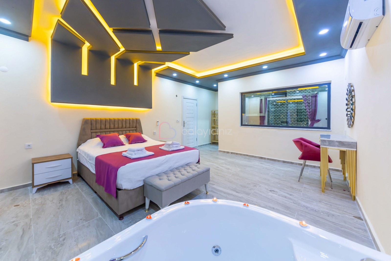 1.Yatak Odası: 1 adet çift kişilik yatak, elbise dolabı, makyaj masası, komodin, jakuzi, bulunmaktadır. Banyo ve tuvalet bulunmaktadır.